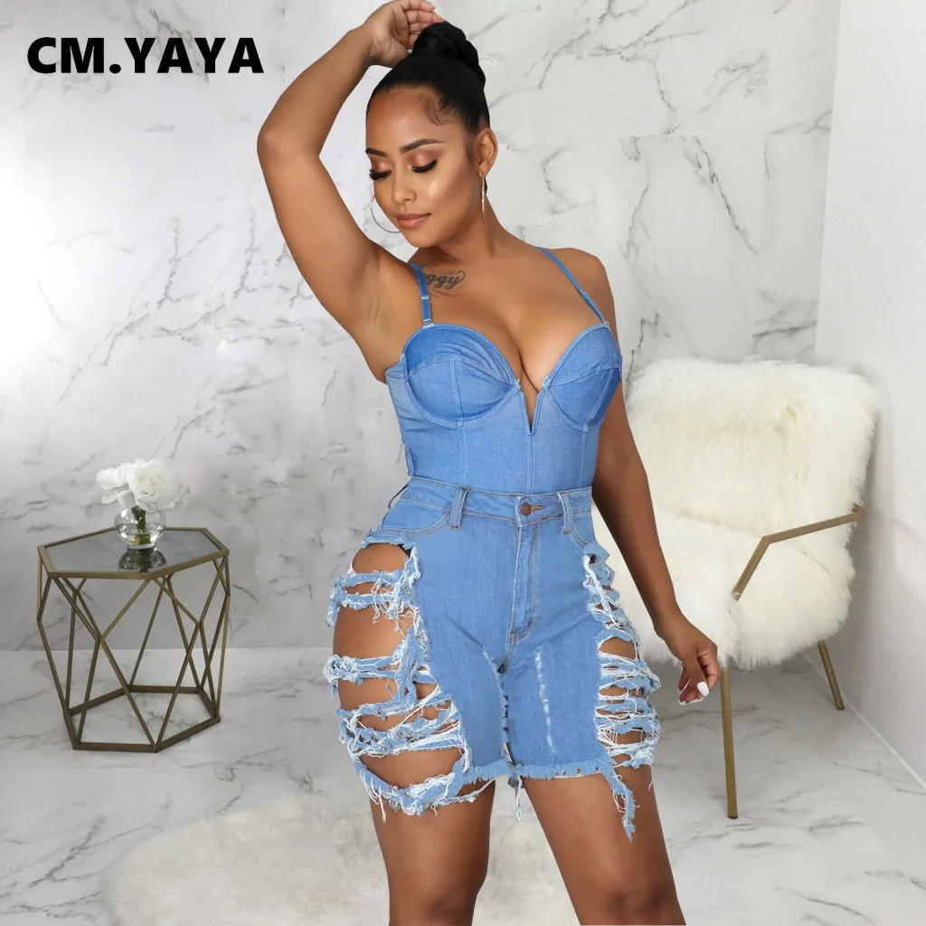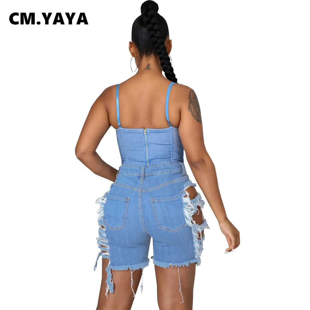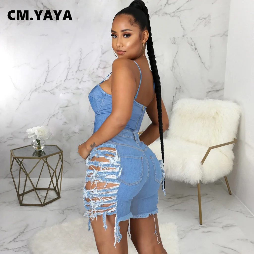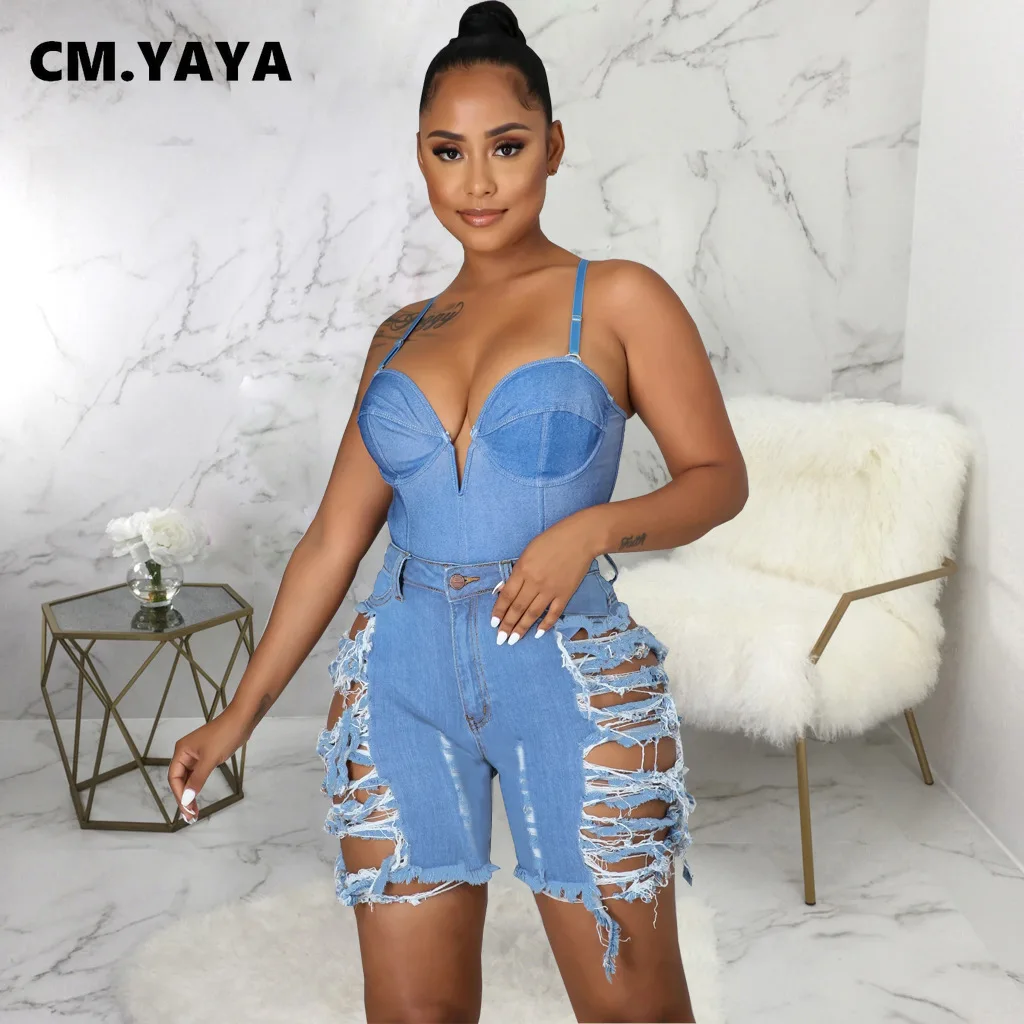 CM.YAYA Women Jeans Solid Ripped Hole Pockets Zipper Straight Denim Shorts Sexy Fashion High Streetwear Summer Trousers 2021