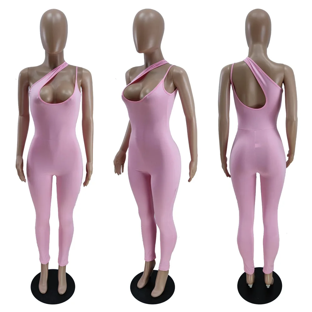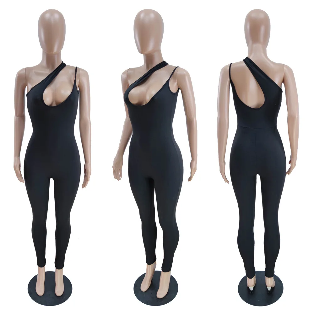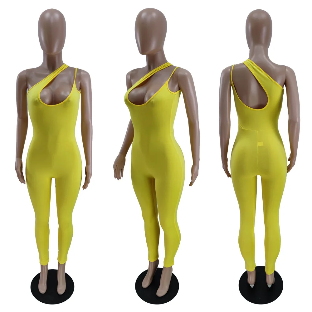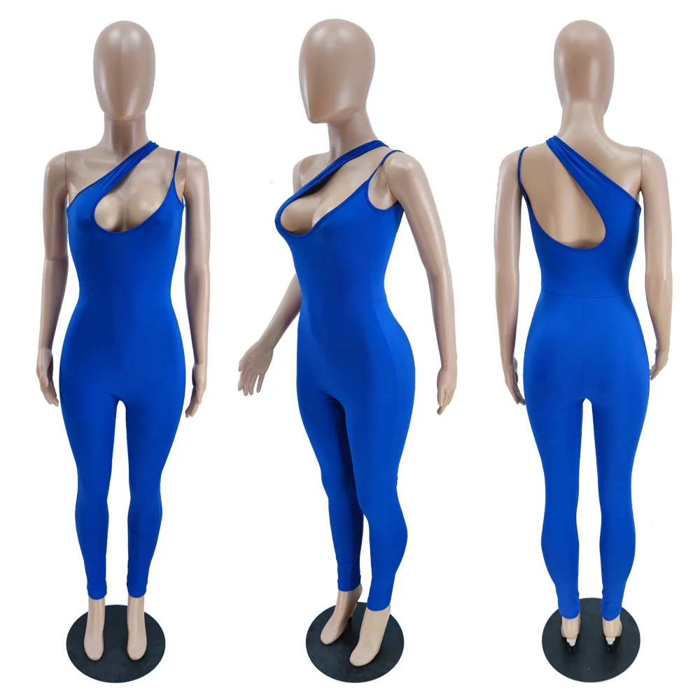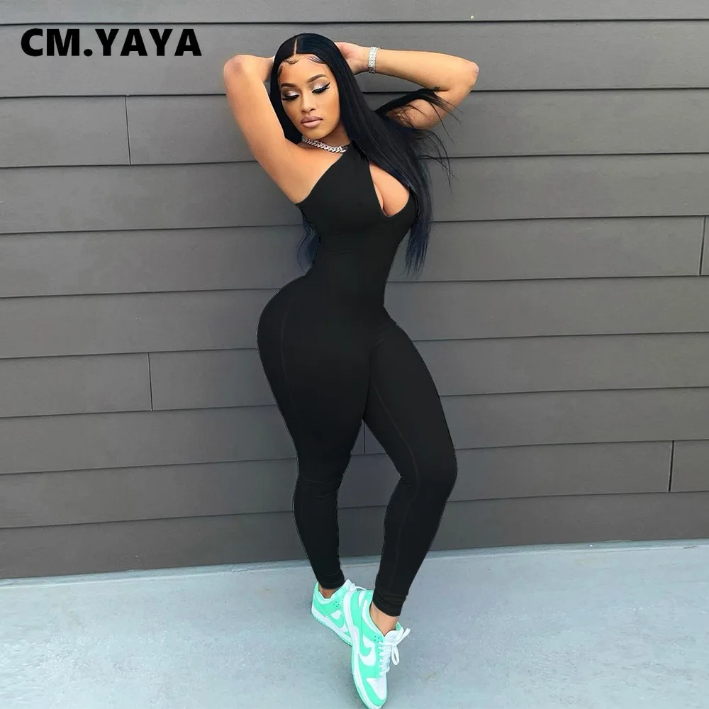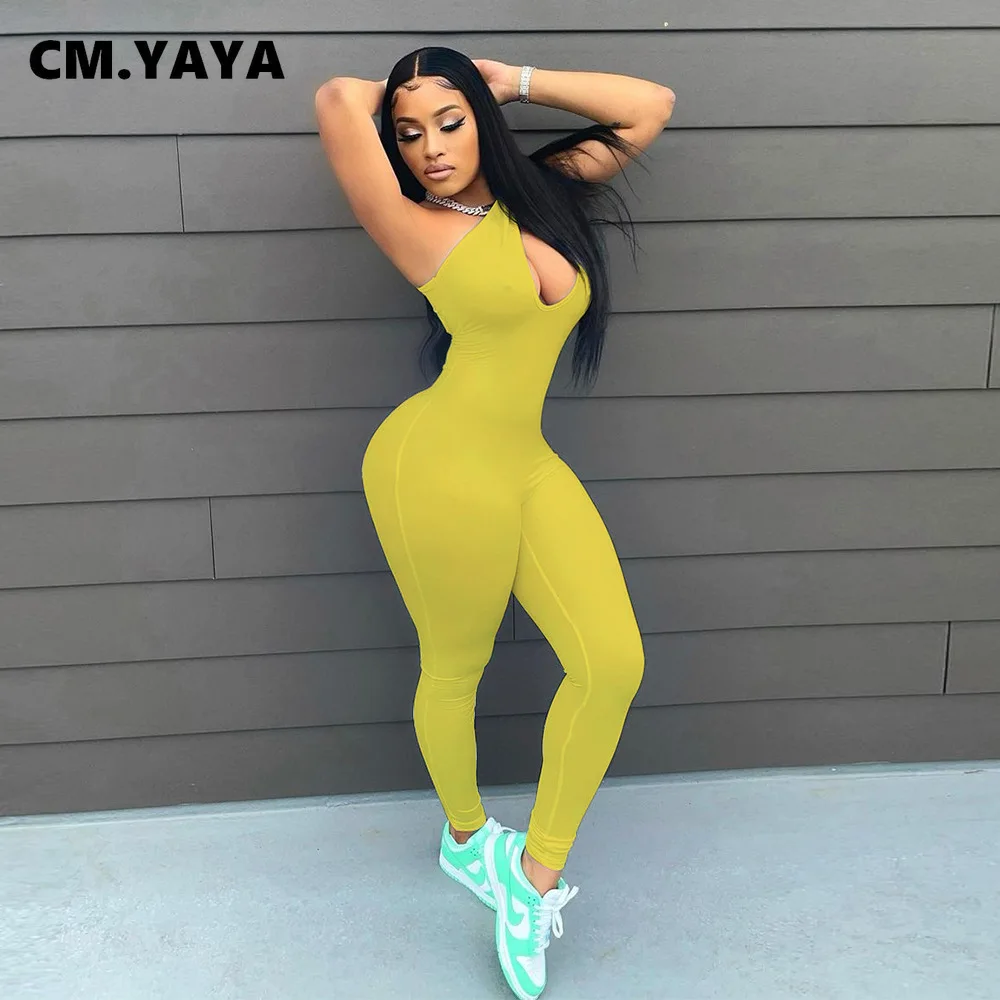 CM.YAYA Women Jumpsuit Solid One Shoulder Sleeveless Skew Collar Cut Out Bodycon Jumpsuits Casual One Piece Overalls Summer