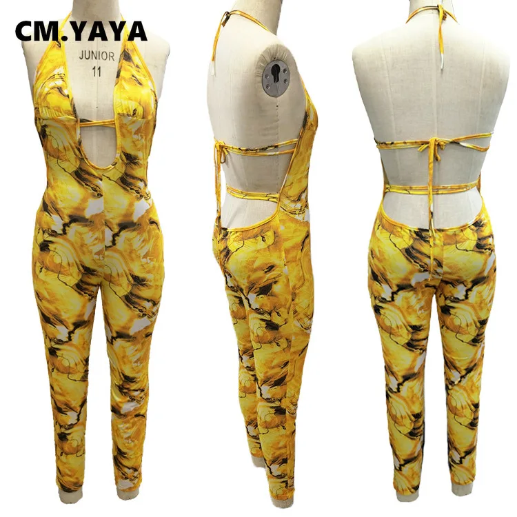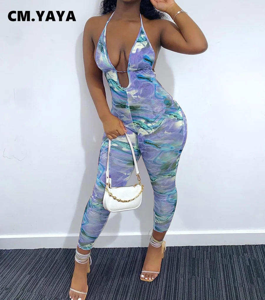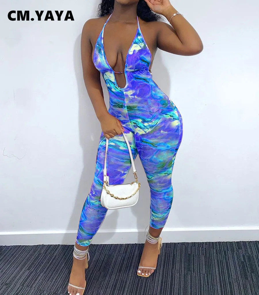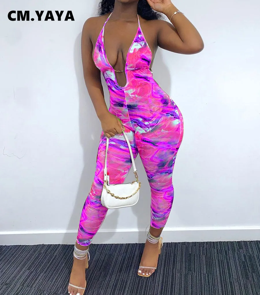CM.YAYA Women Jumpsuit Tie Dye Bandage Halter Hollow Out Stretchy Skinny Bodycon Jumpsuits Sexy One Piece Overalls Summer Outfit