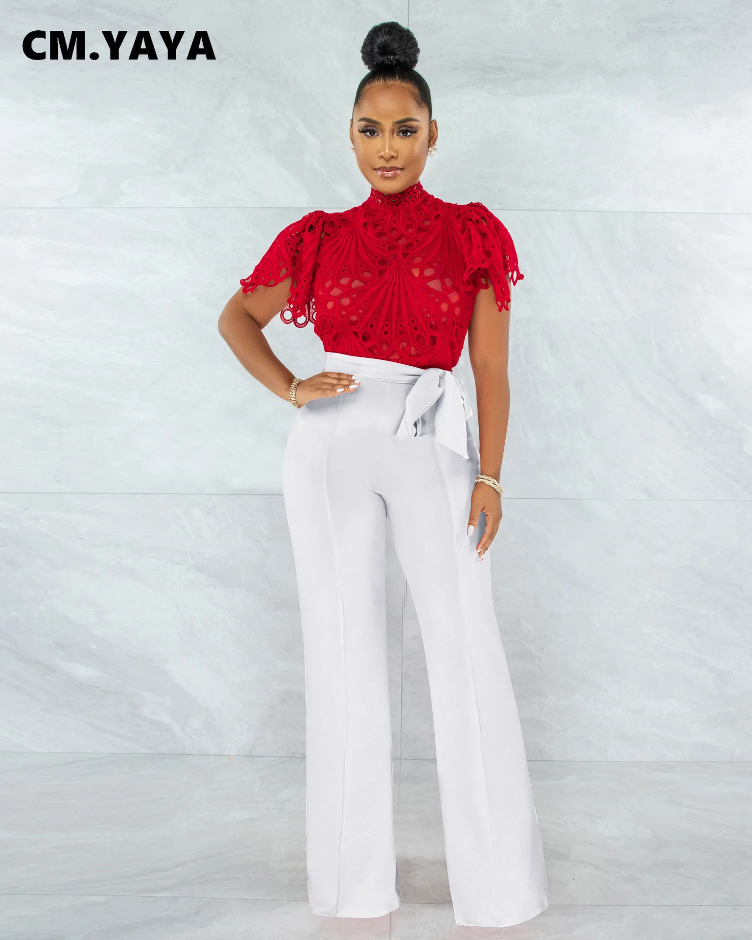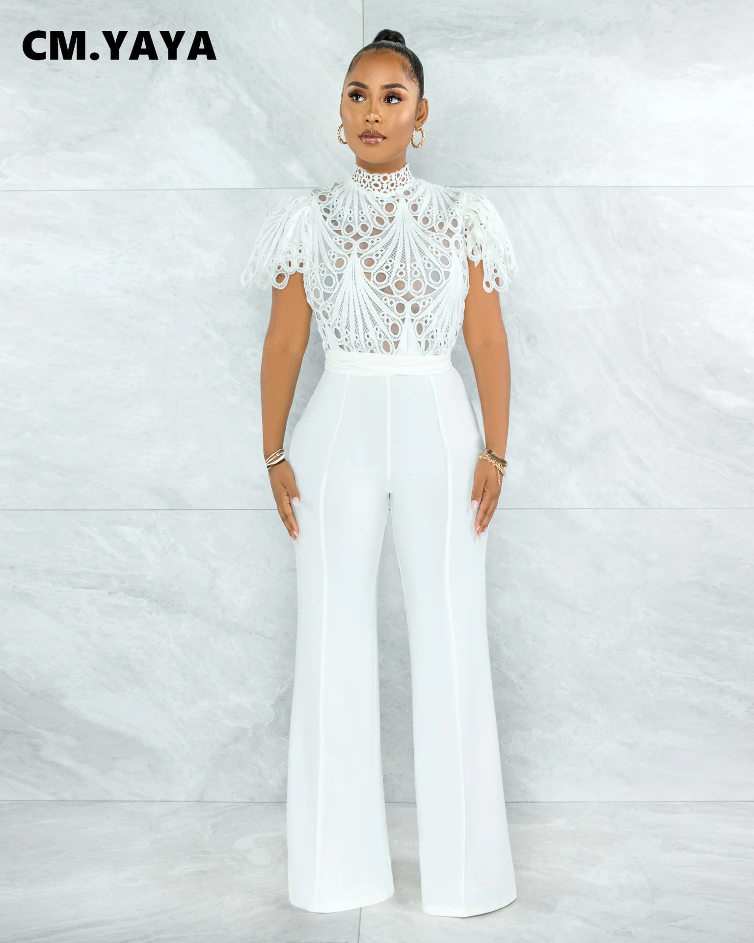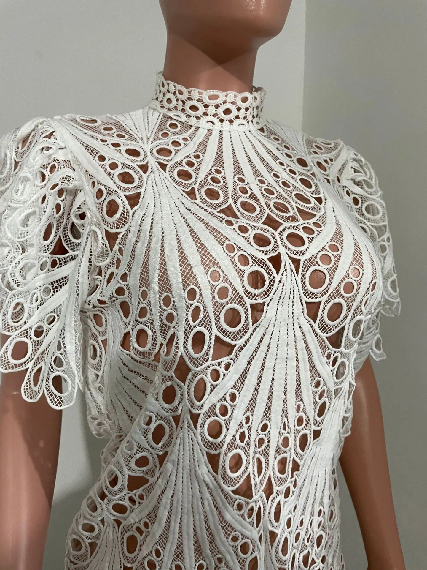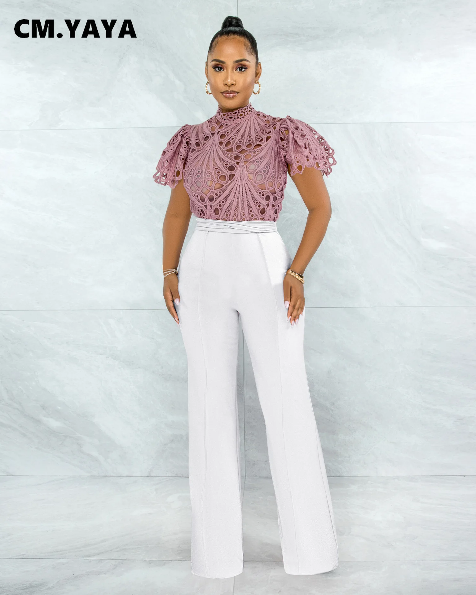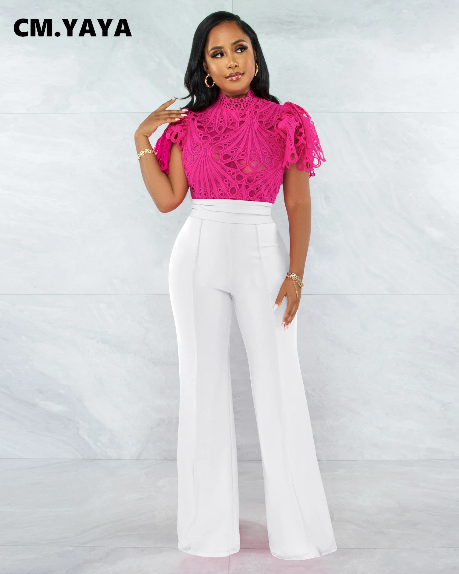 CM.YAYA Women Lace Crochet Hollow Out Short Sleeve Shirt Blouse Tops 2022 Summer Elegant Party Club Top