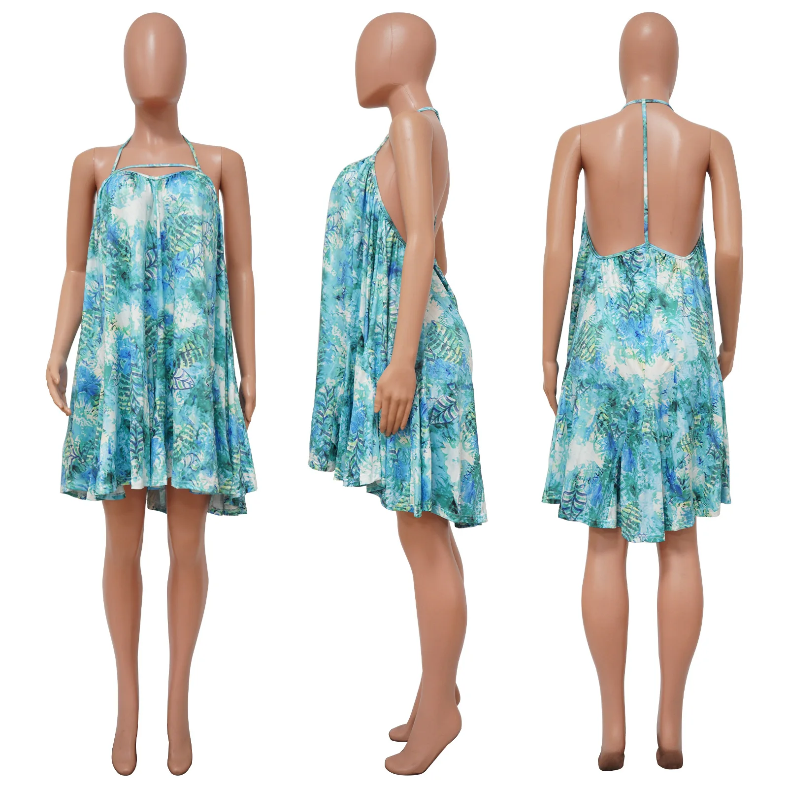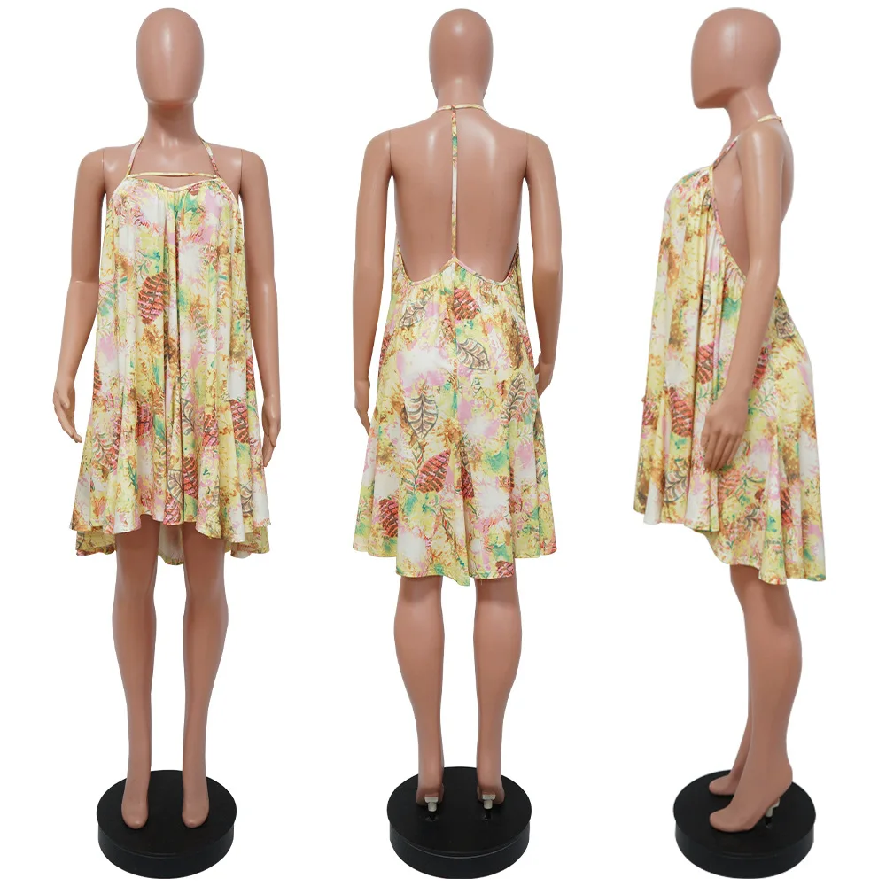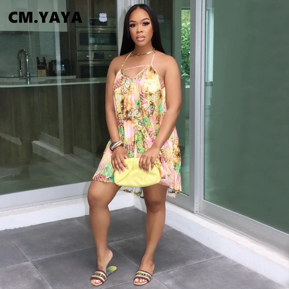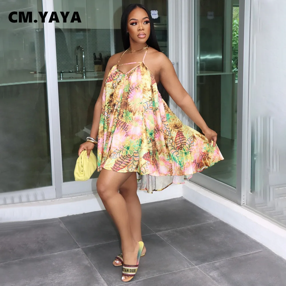 CM.YAYA Women Leaf Halter Neck Backless Loose A-line Dress for Women 2022 Sexy Beach Street Boho Big Swing Sleeveless Dresses