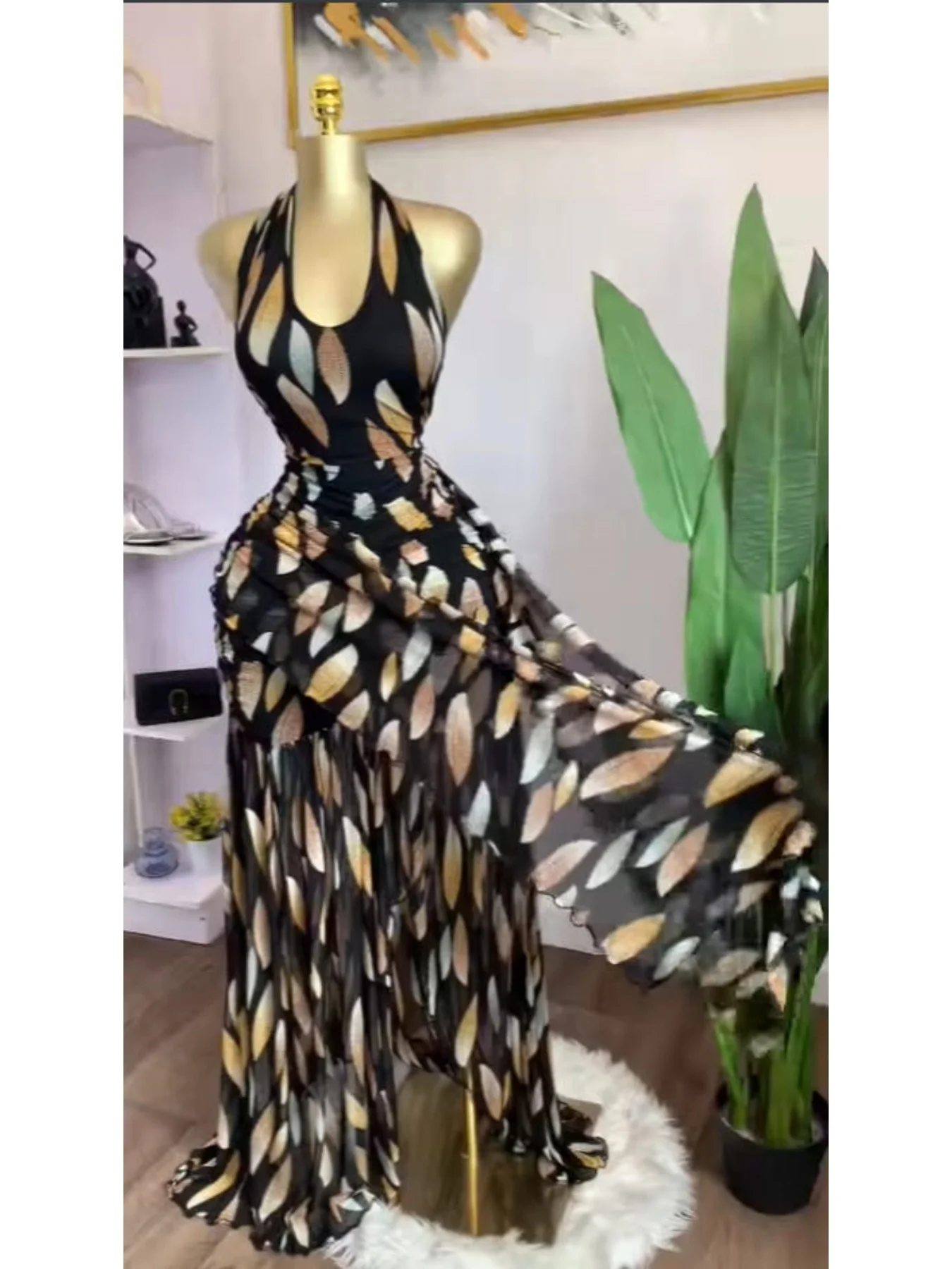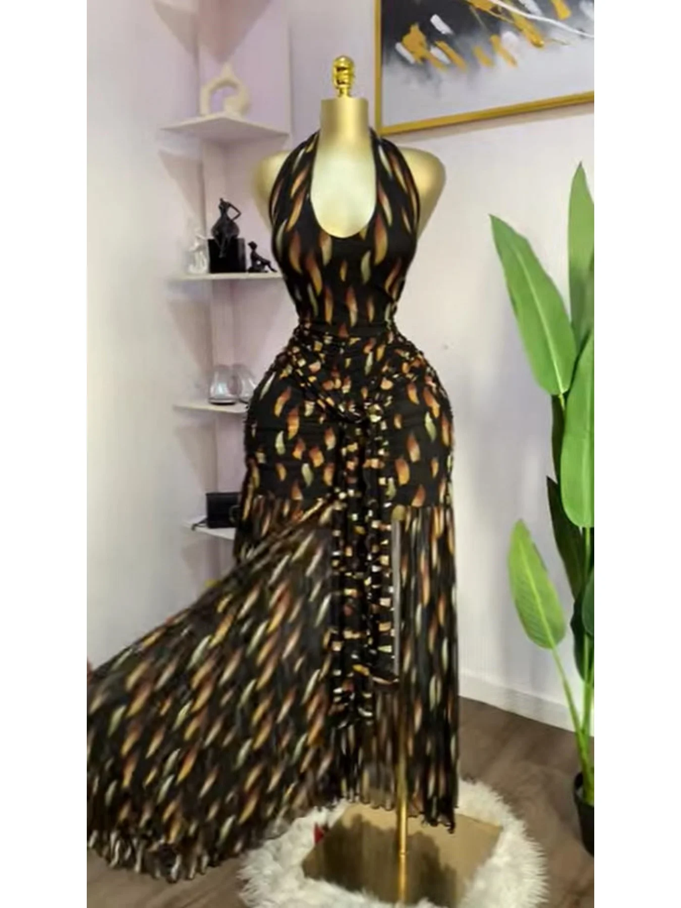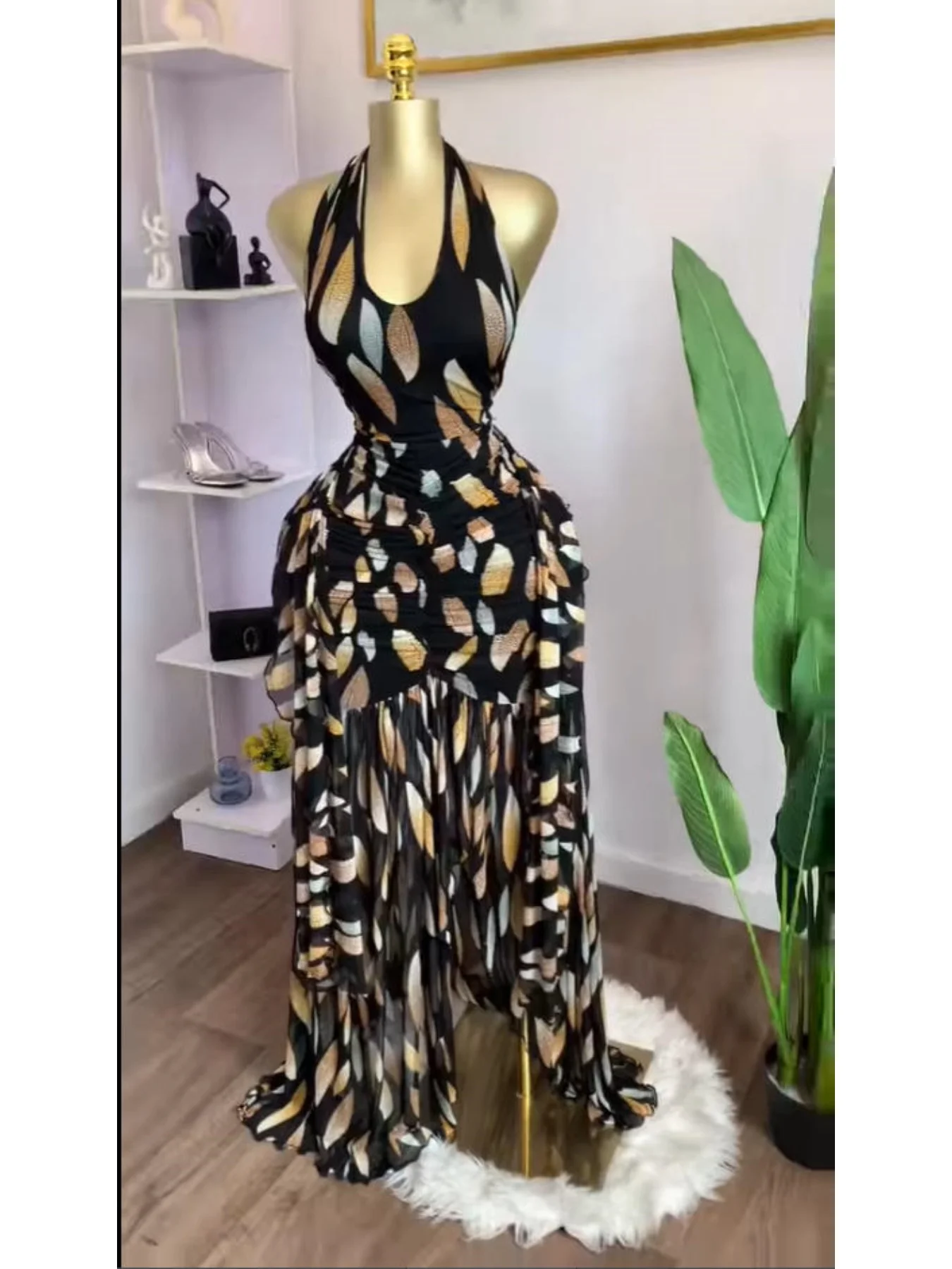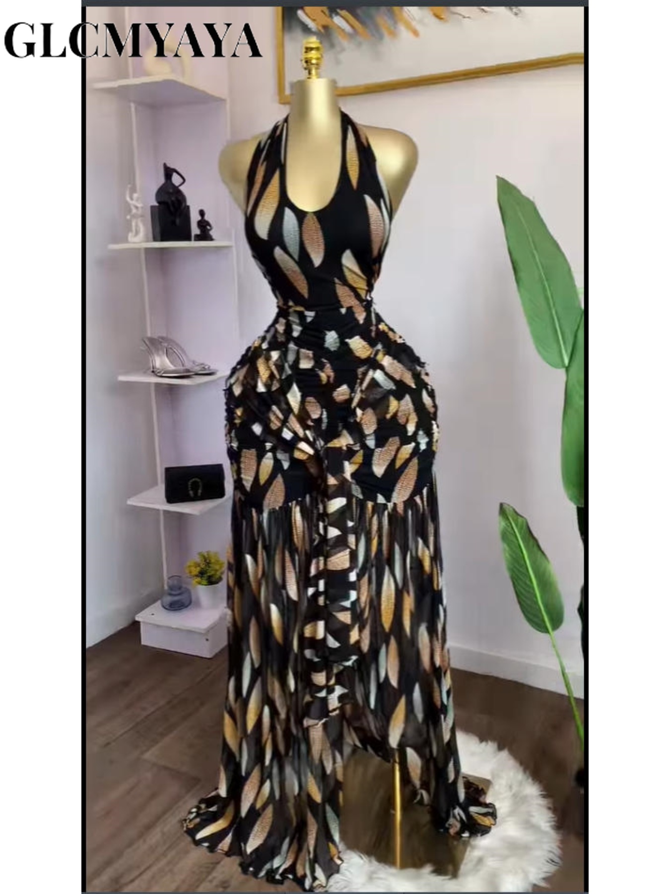 CM.YAYA Women Leaf Printed Ruched Stacked Side Split A-line Midi Halter Neck Long Maxi Dress Party Education Vacation Dresses