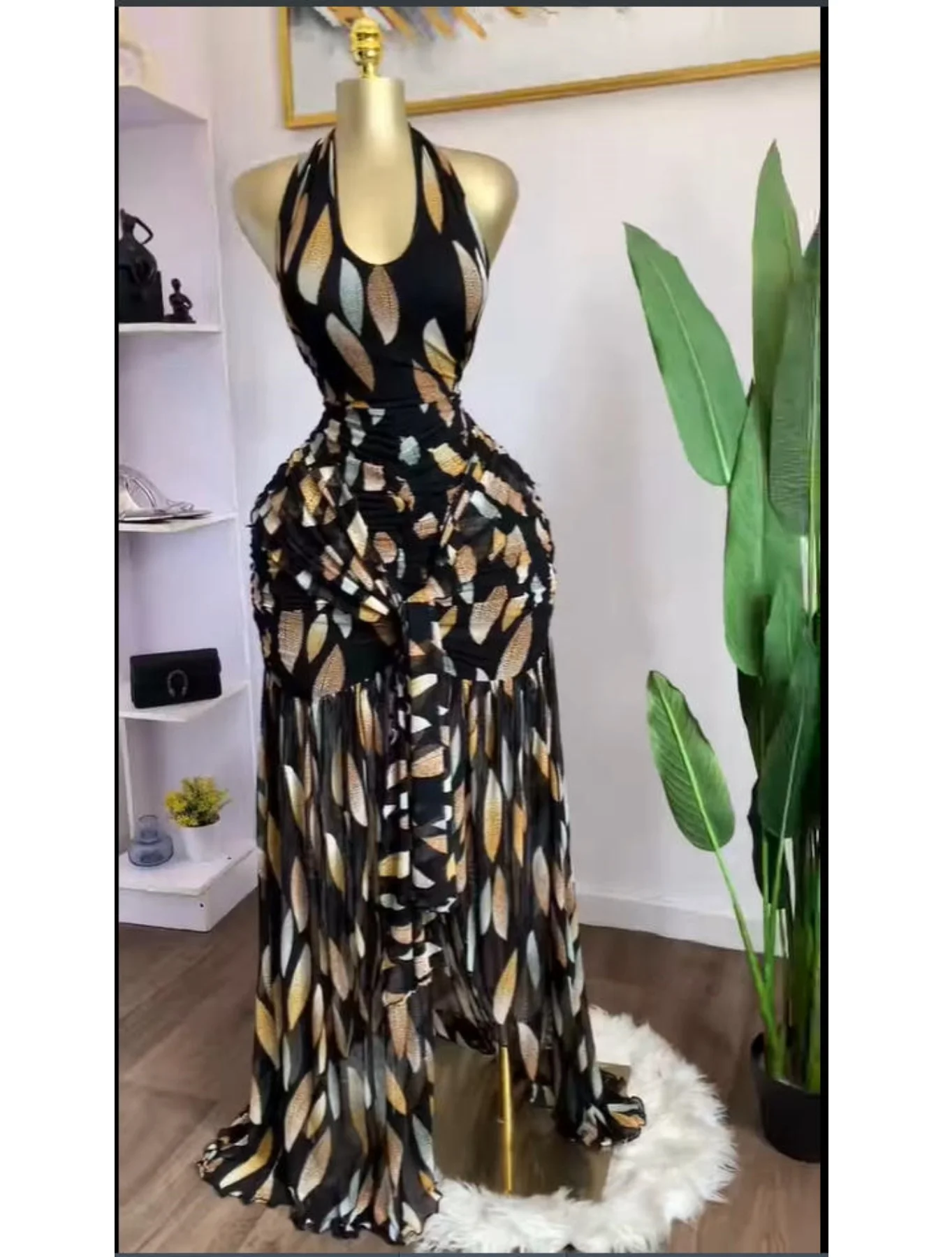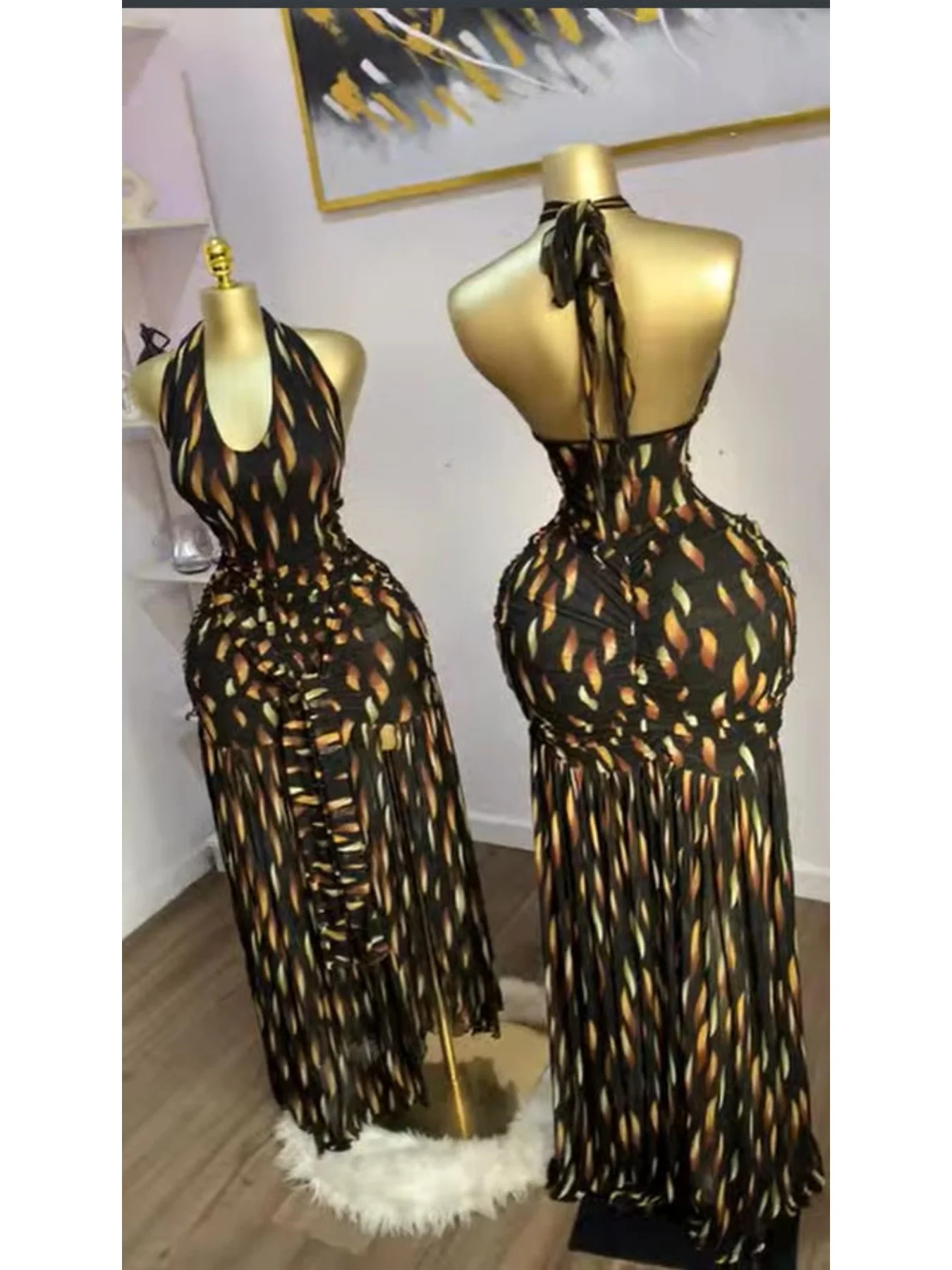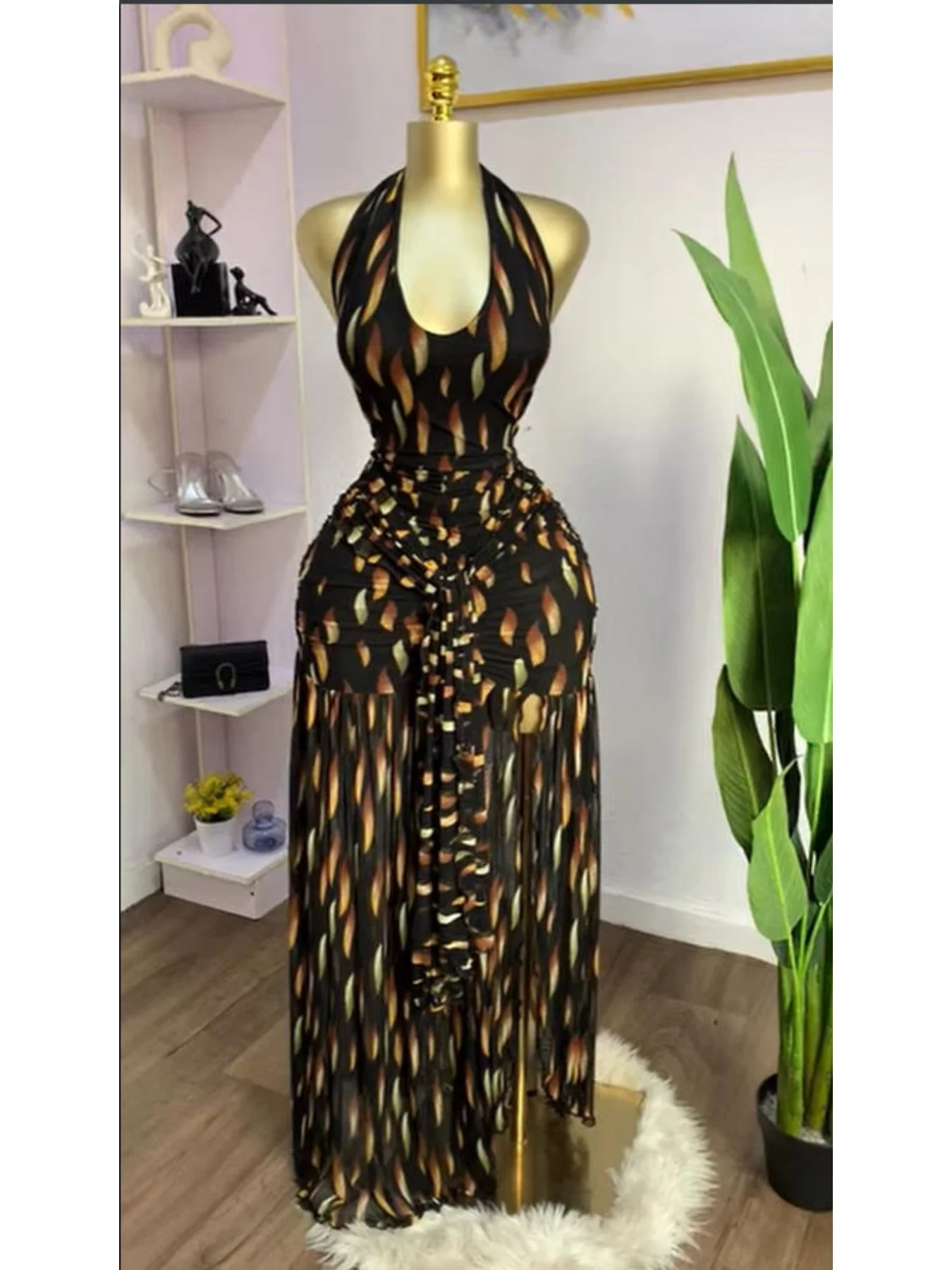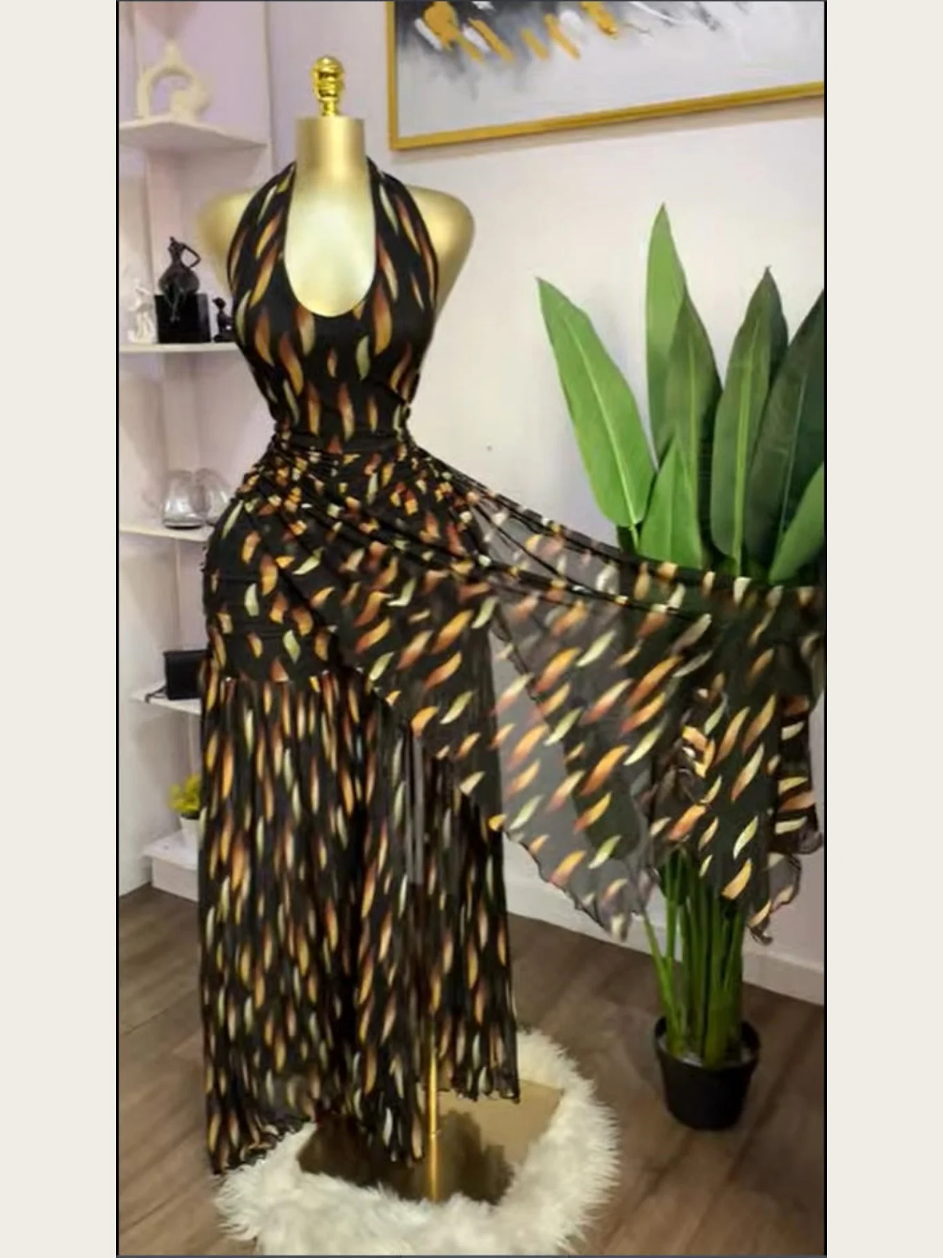 CM.YAYA Women Leaf Printed Ruched Stacked Side Split A-line Midi Halter Neck Long Maxi Dress Party Education Vacation Dresses