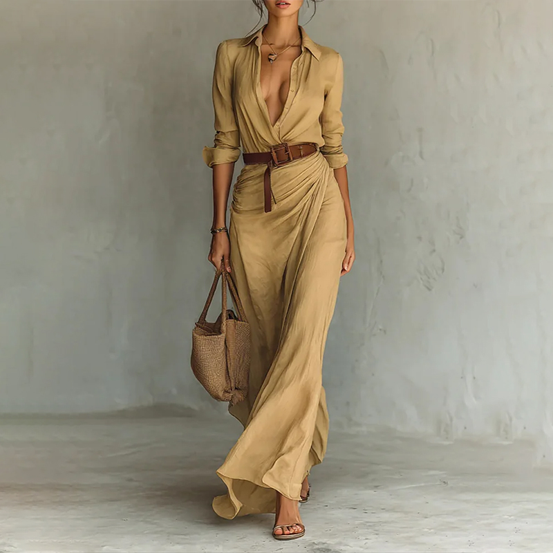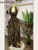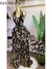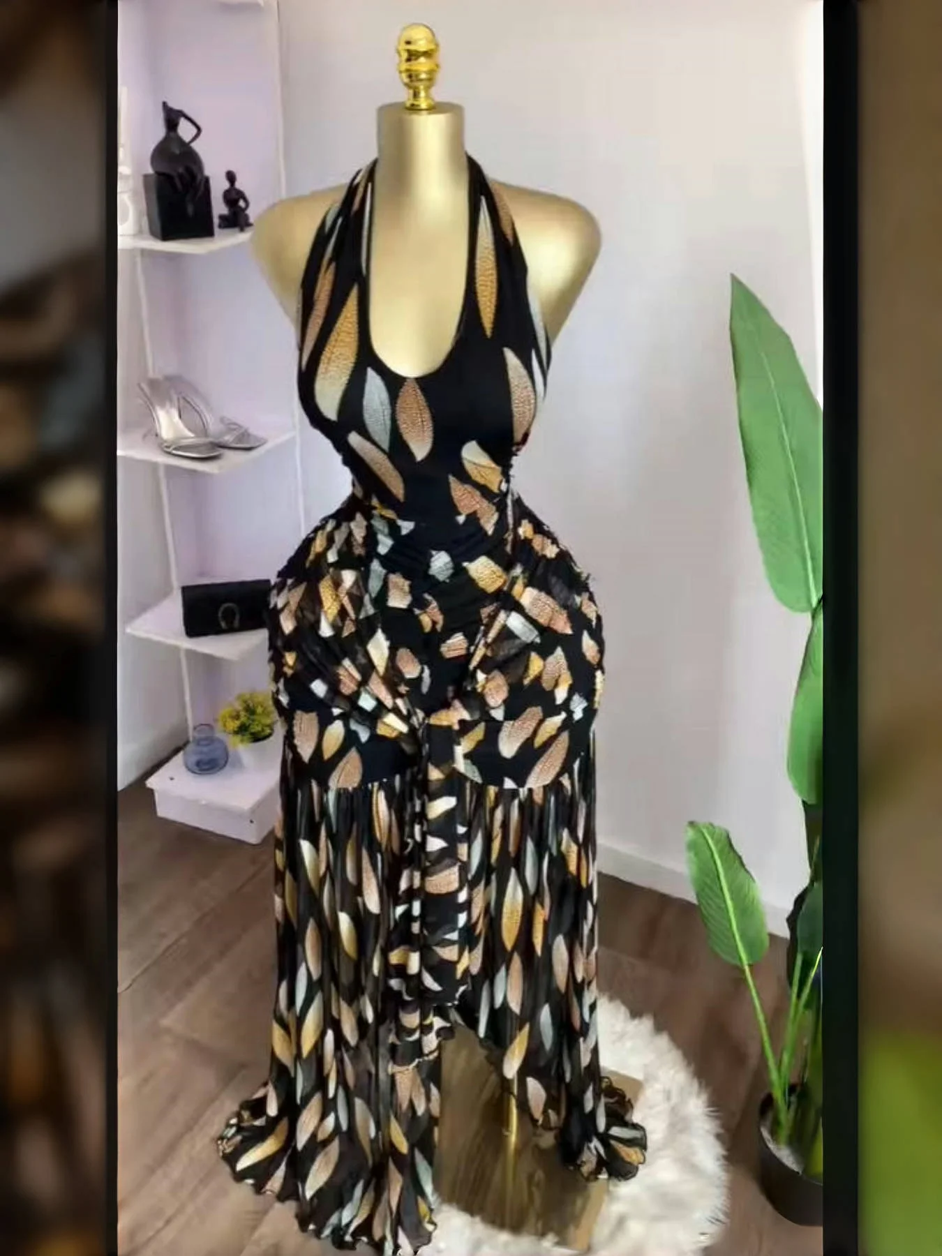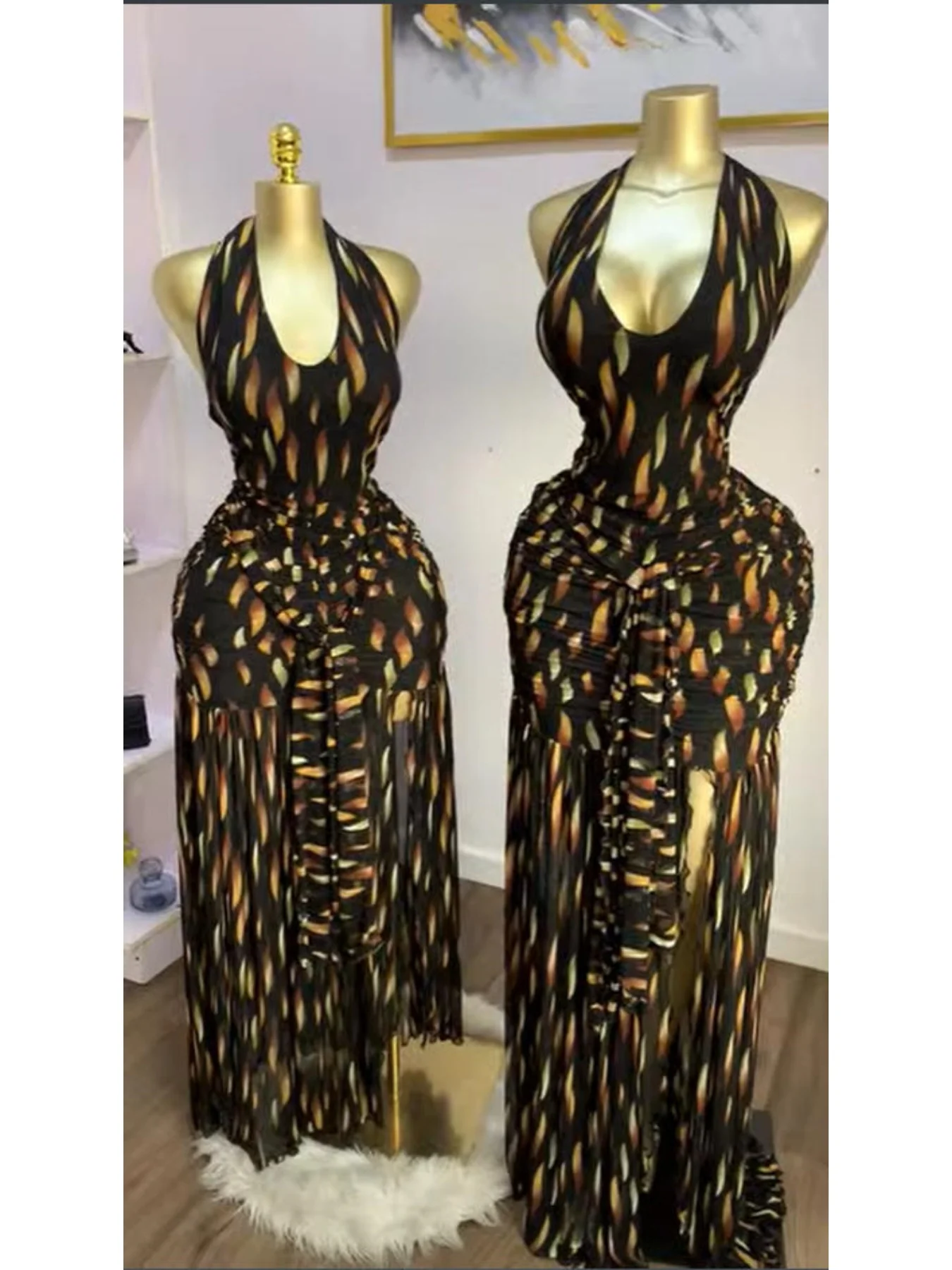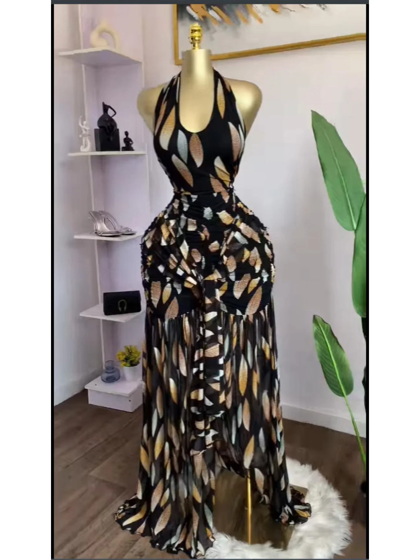 CM.YAYA Women Leaf Printed Ruched Stacked Side Split A-line Midi Halter Neck Long Maxi Dress Party Education Vacation Dresses