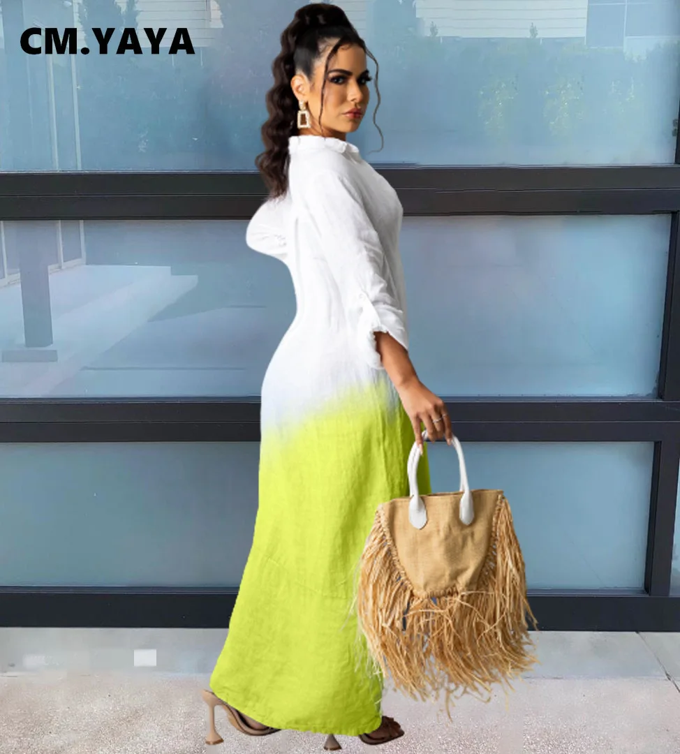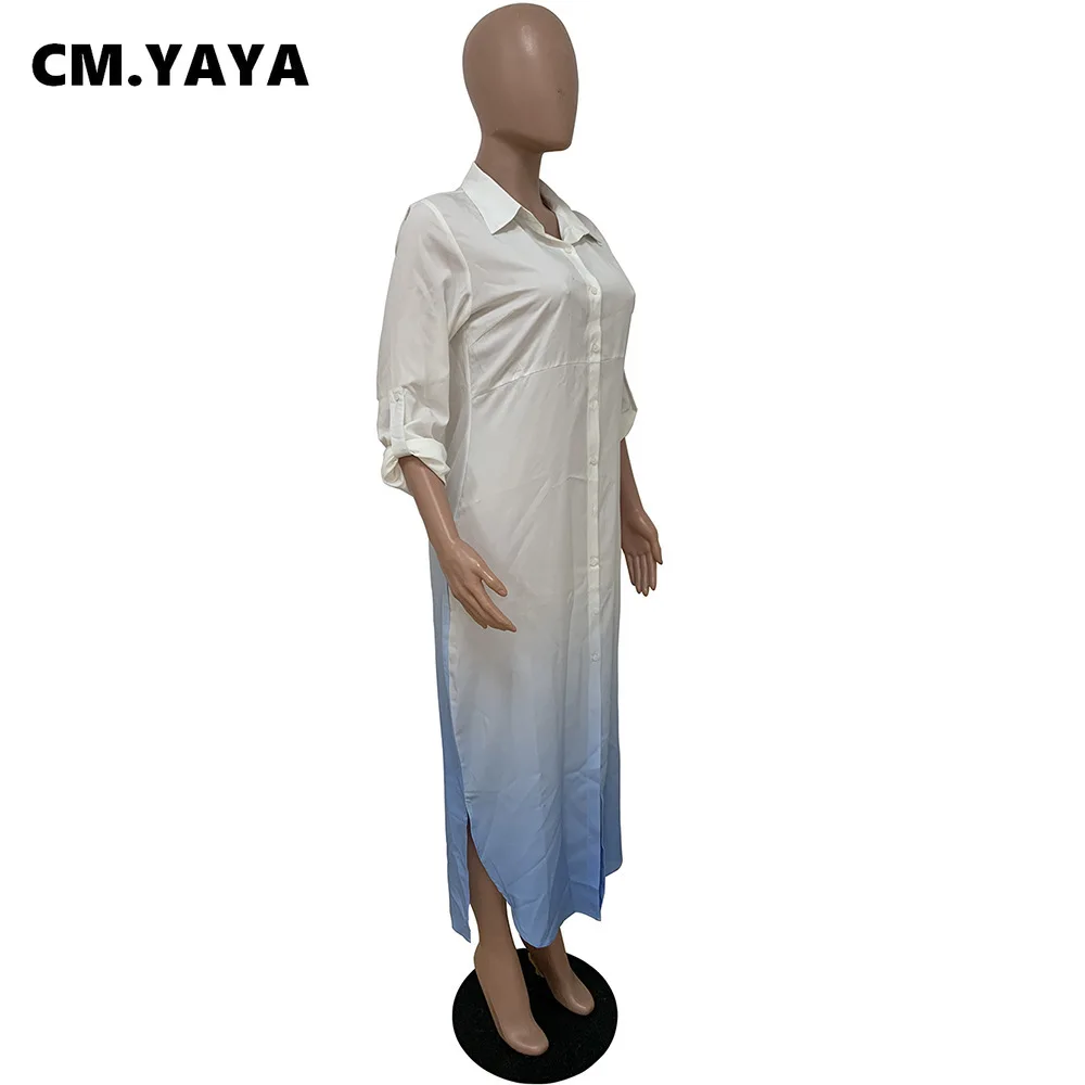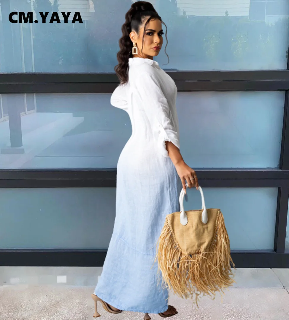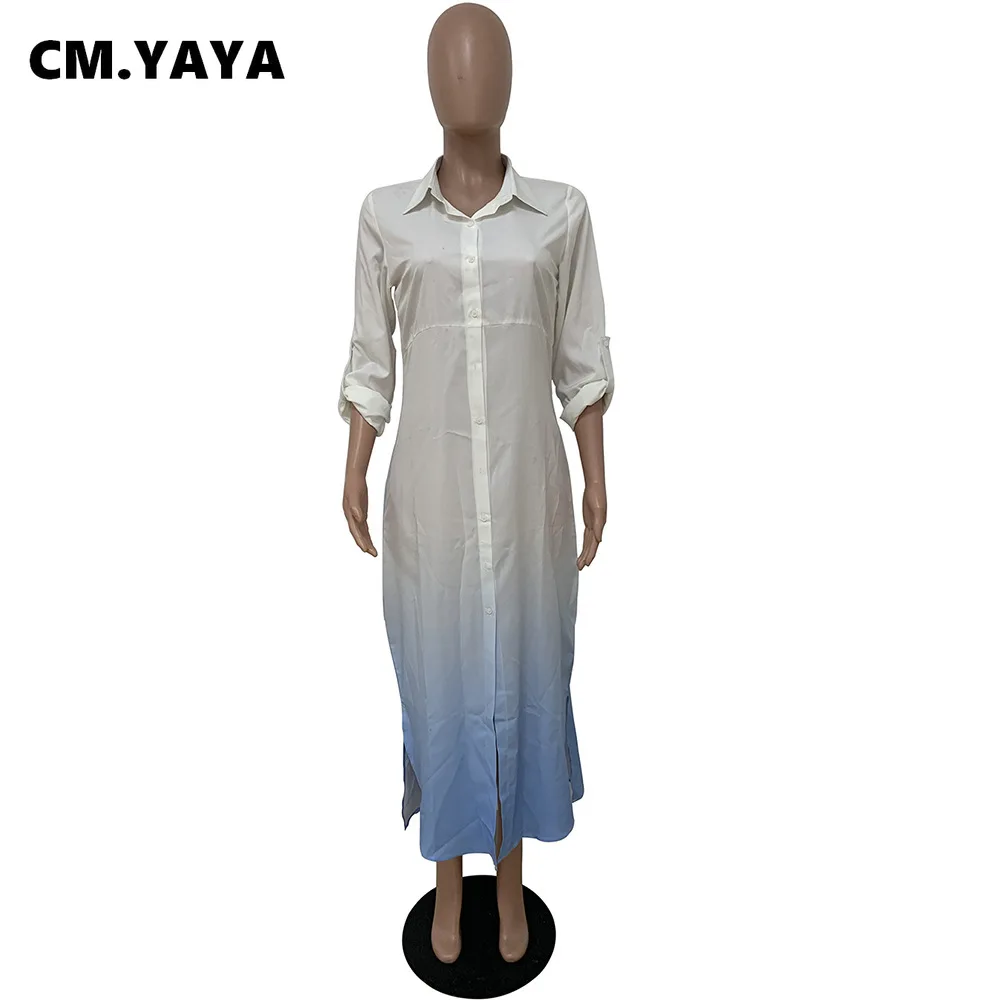 CM.YAYA Women Long Dress Gradient Color Full Sleeve Turn-down Collar Single Breasted Straight Maxi Dresses Fashion Outfit Fall