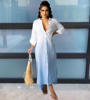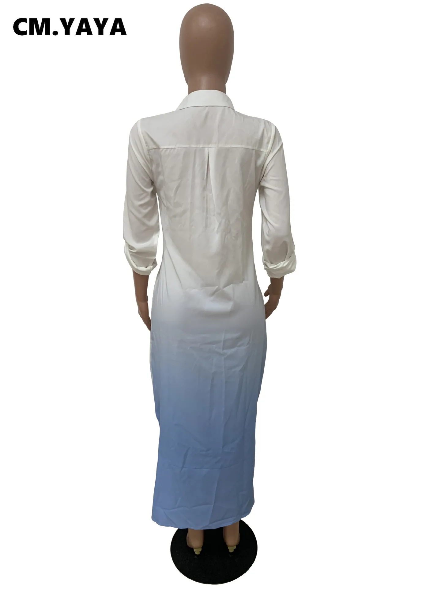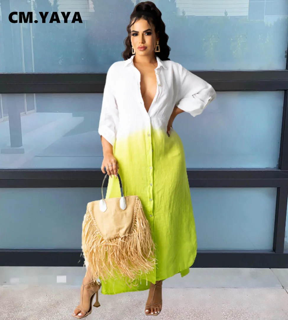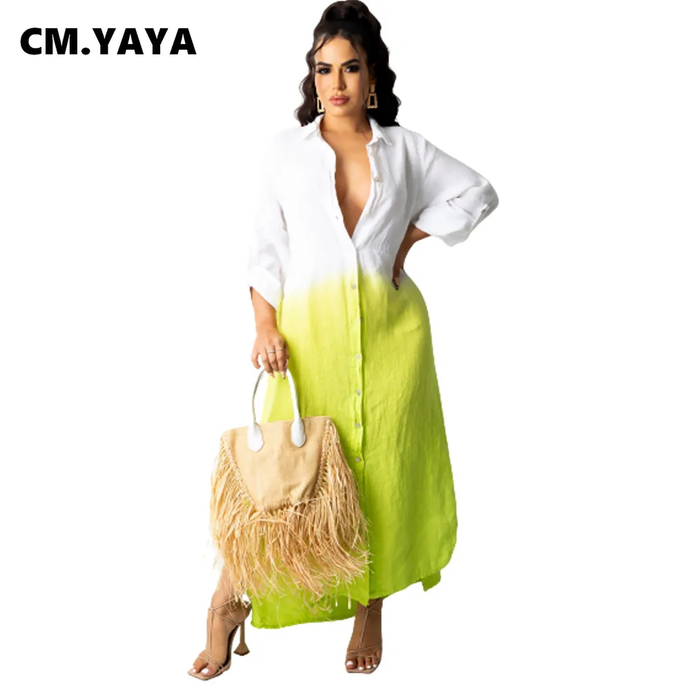 CM.YAYA Women Long Dress Gradient Color Full Sleeve Turn-down Collar Single Breasted Straight Maxi Dresses Fashion Outfit Fall
