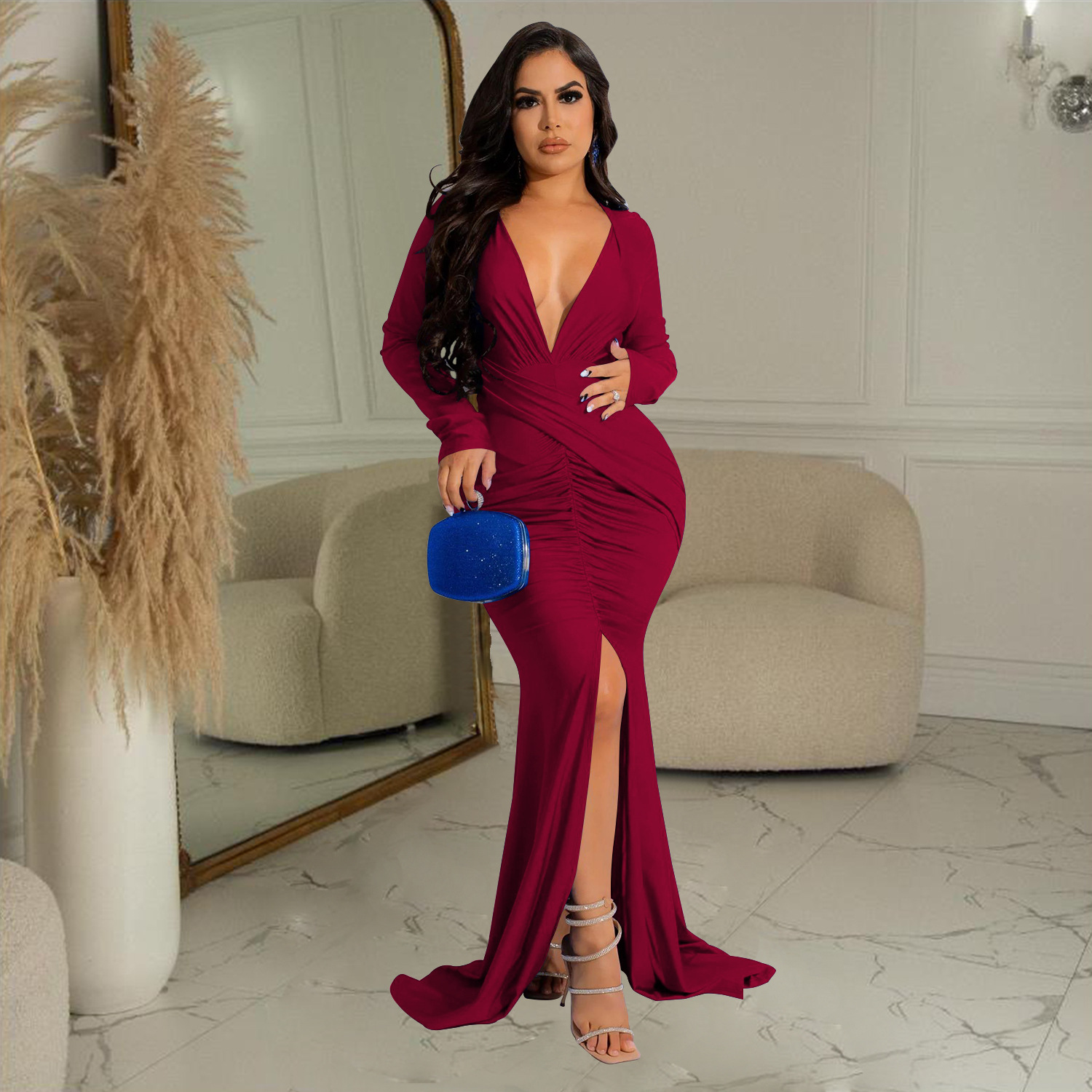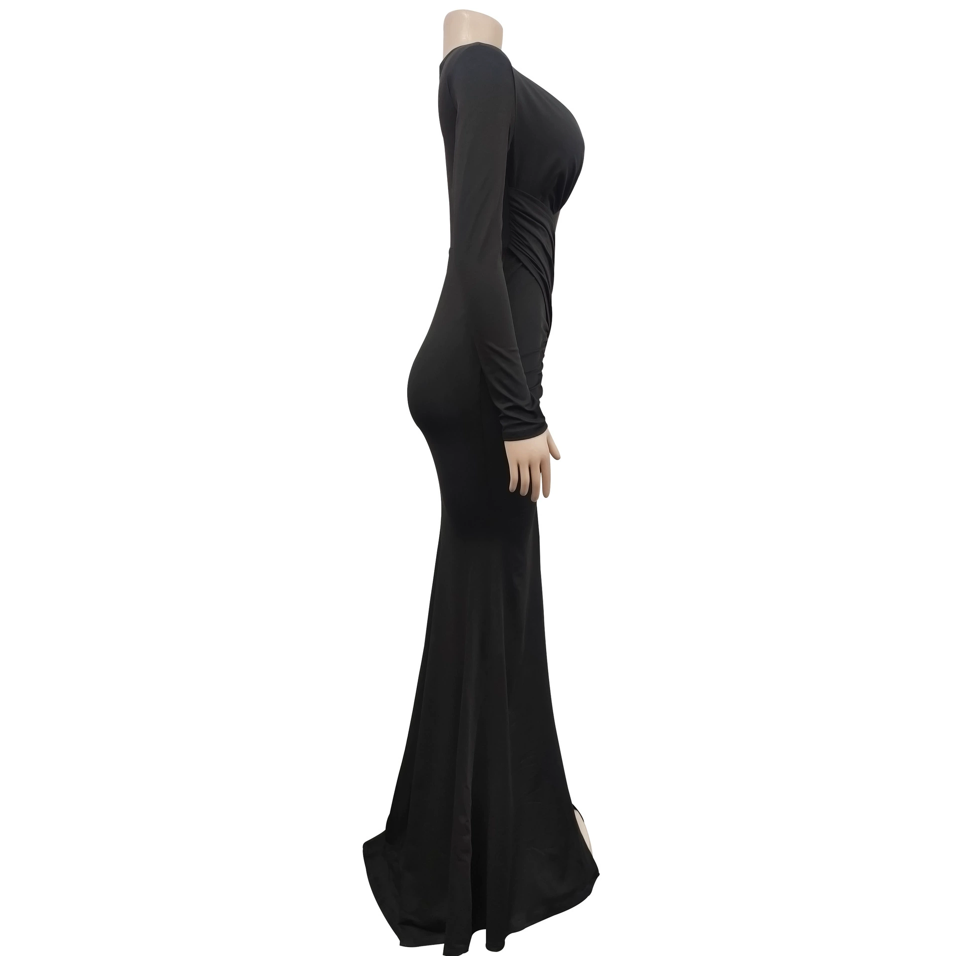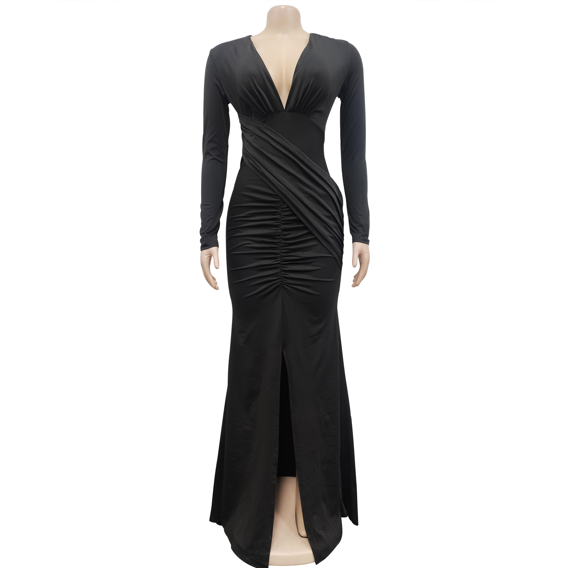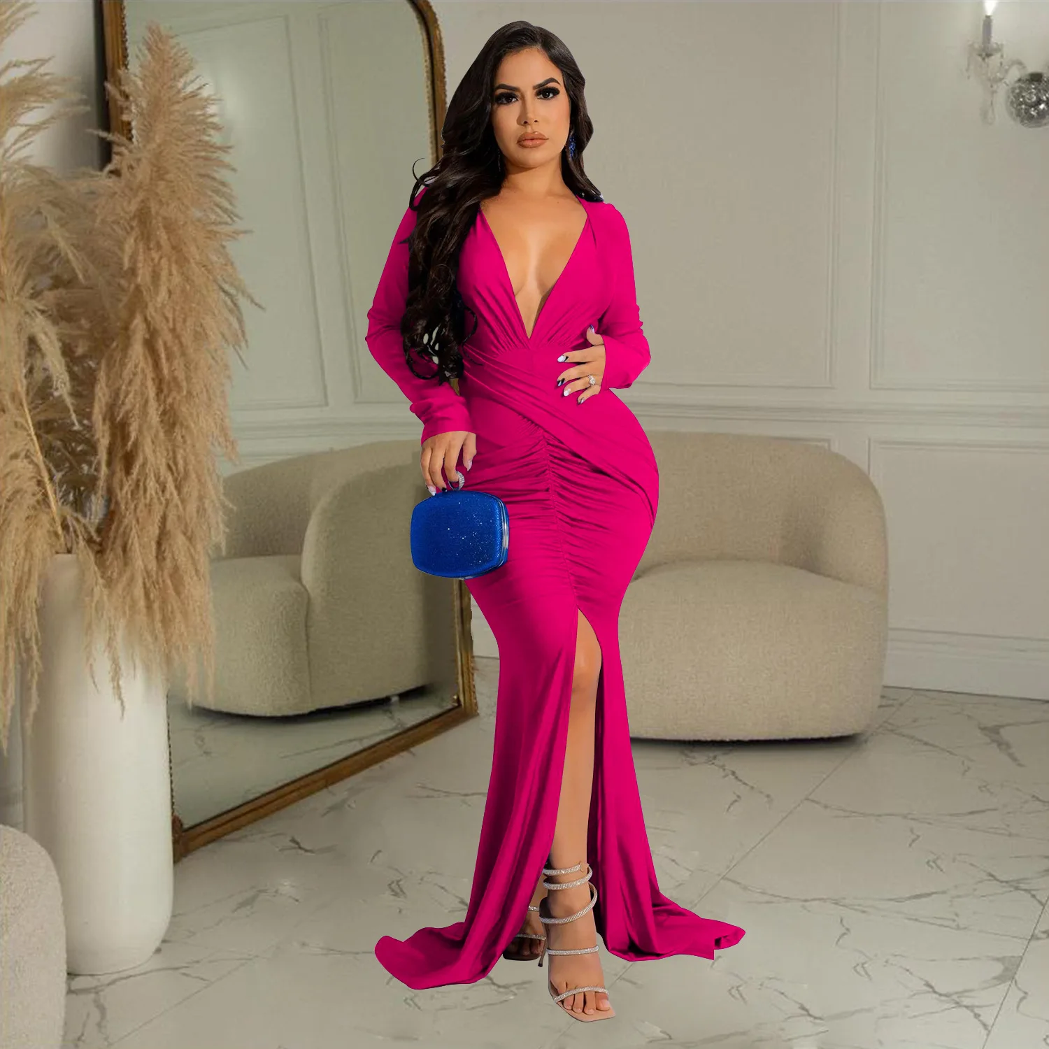 CM.YAYA Women Long Sleeve Deep V-neck High Slit Ruched High Waist Mermaid Trumpet Maxi Long Dress Evening Sexy Party Dresses
