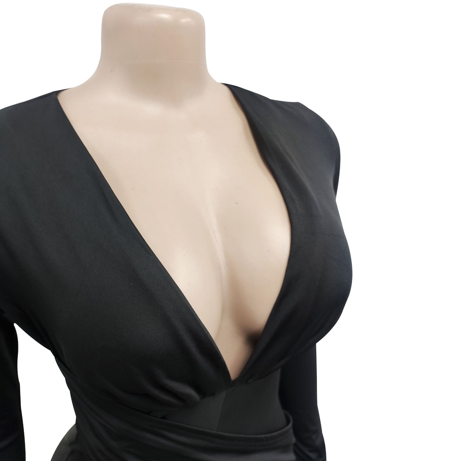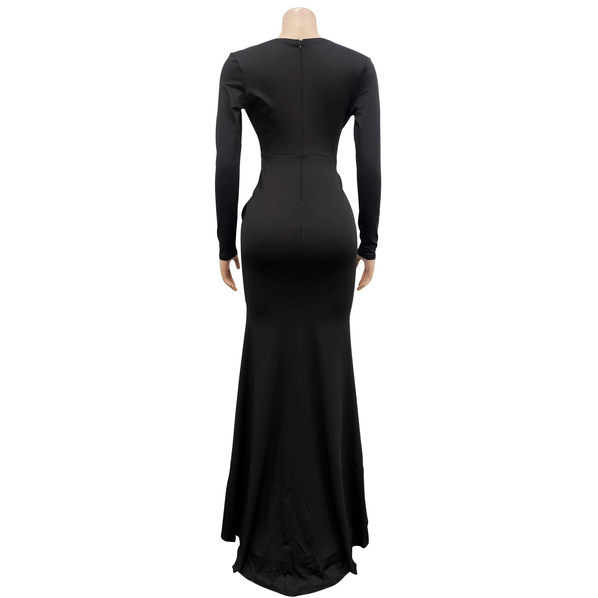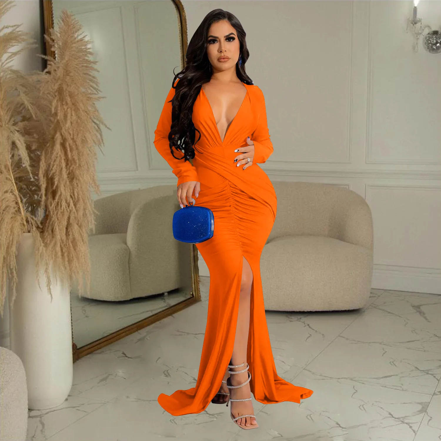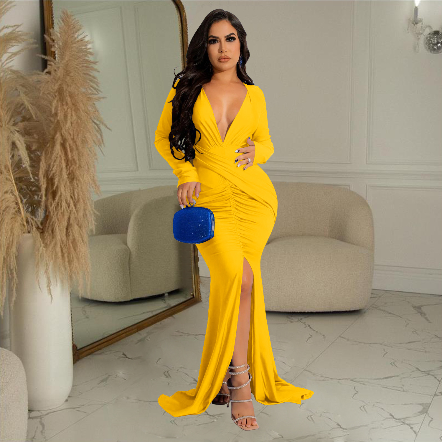 CM.YAYA Women Long Sleeve Deep V-neck High Slit Ruched High Waist Mermaid Trumpet Maxi Long Dress Evening Sexy Party Dresses