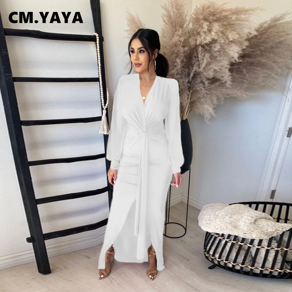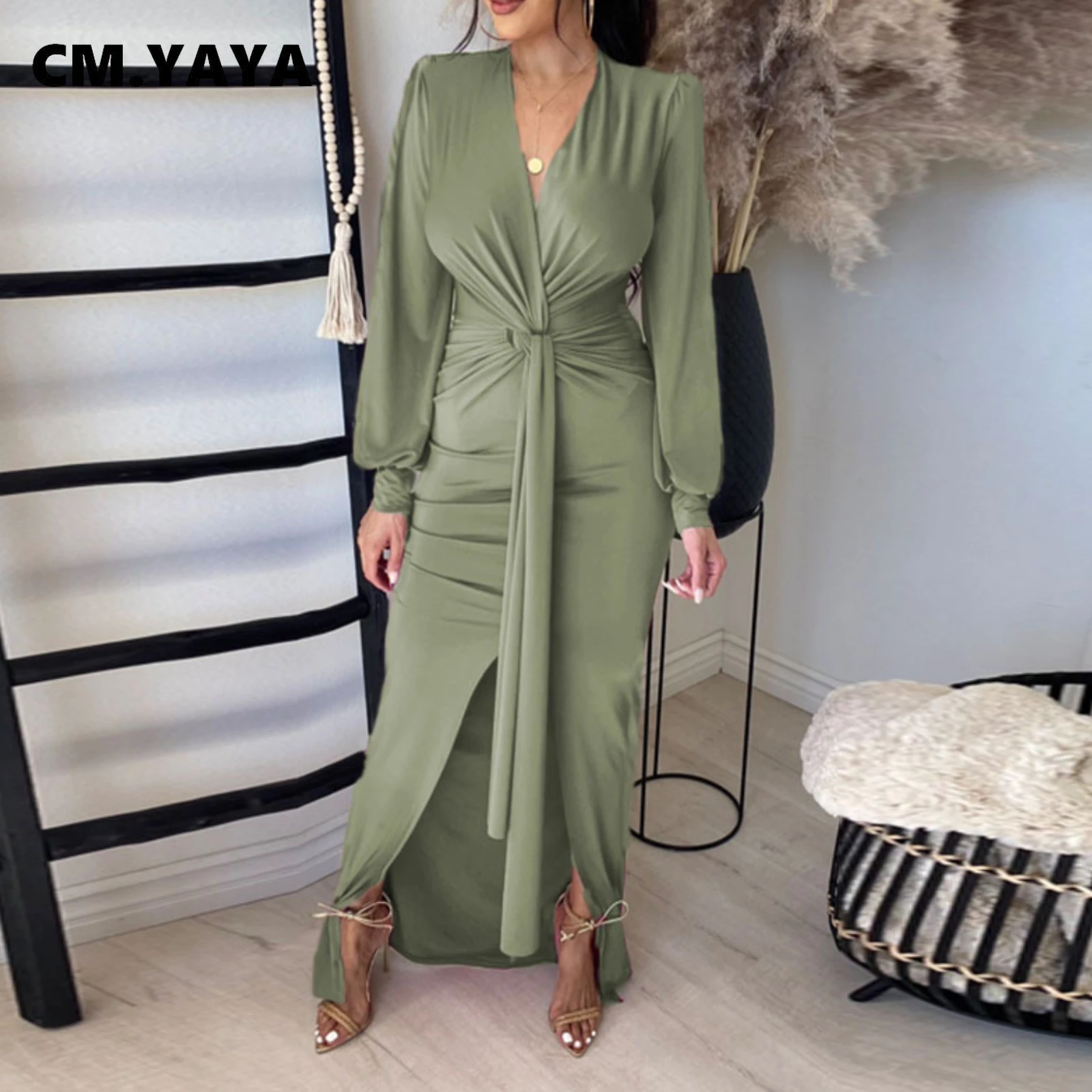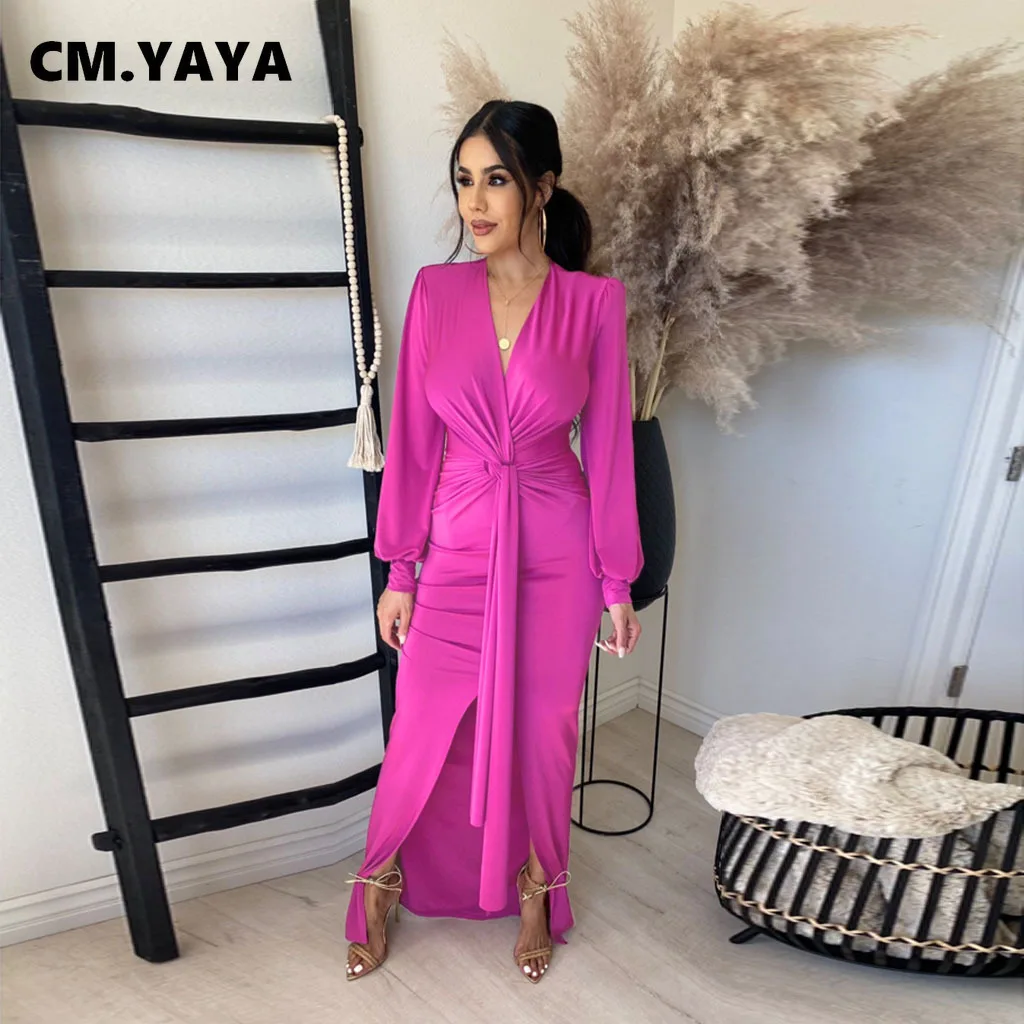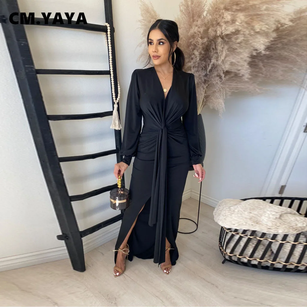 CM.YAYA Women Long Sleeve Draped Bow Neck High Slit V-neck Sexy Party Dress