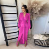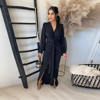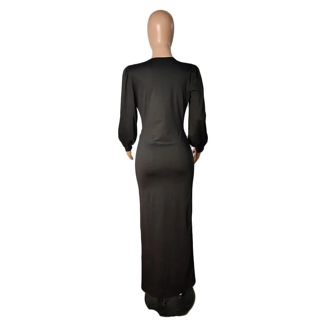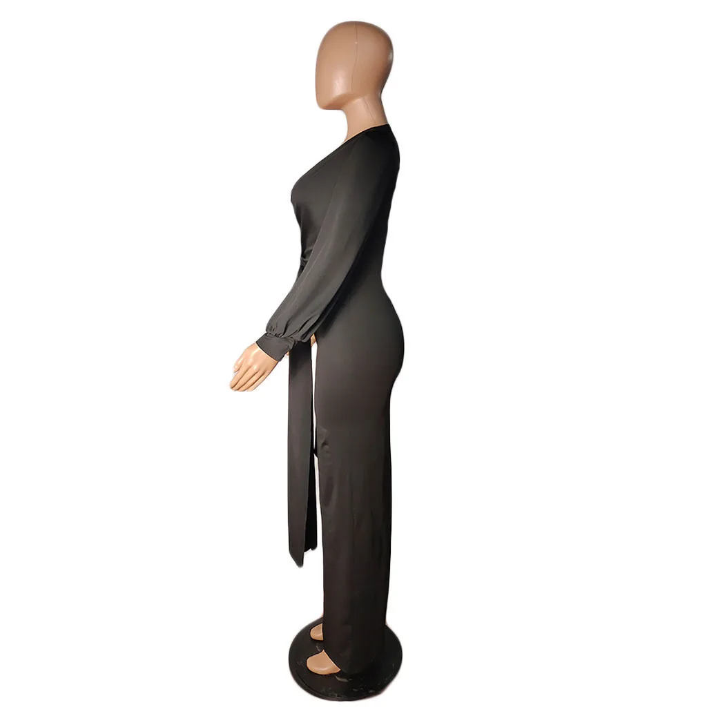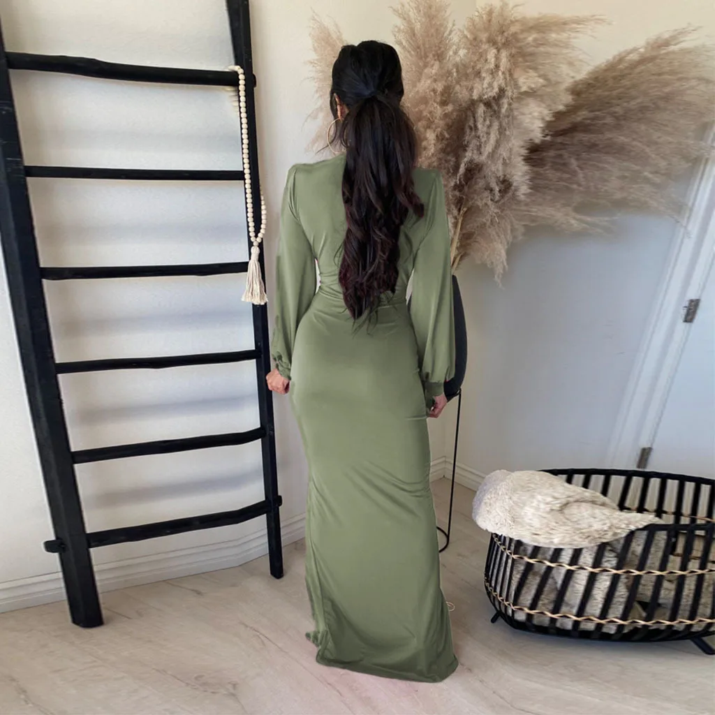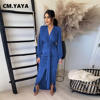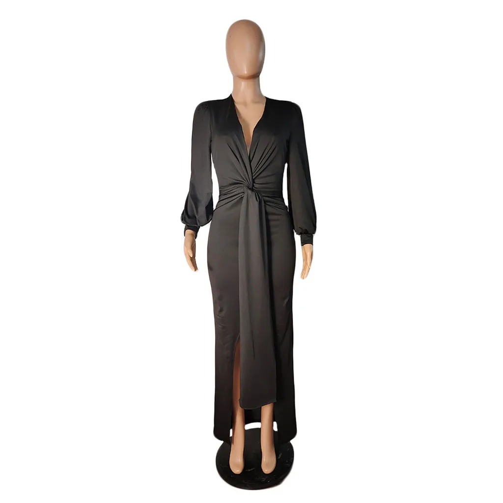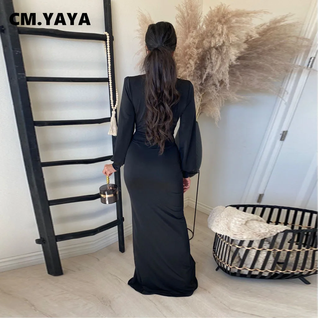 CM.YAYA Women Long Sleeve Draped Bow Neck High Slit V-neck Sexy Party Dress