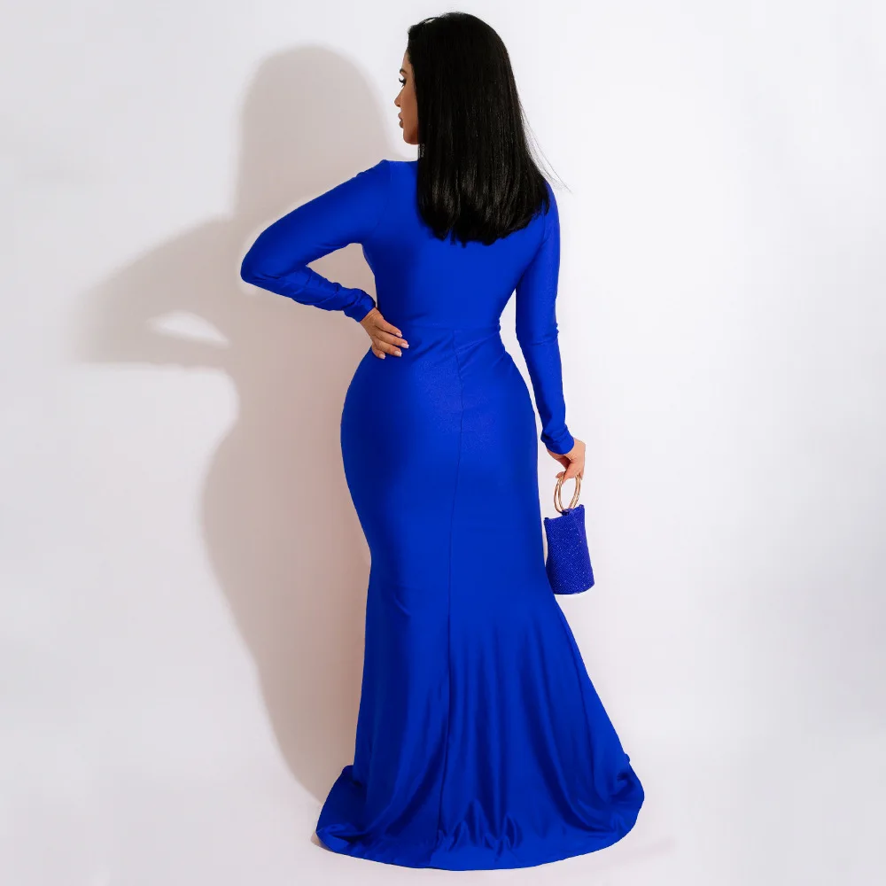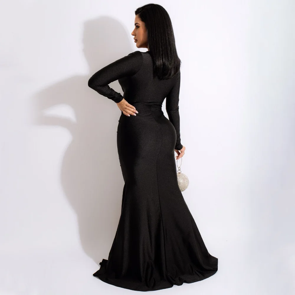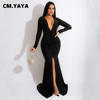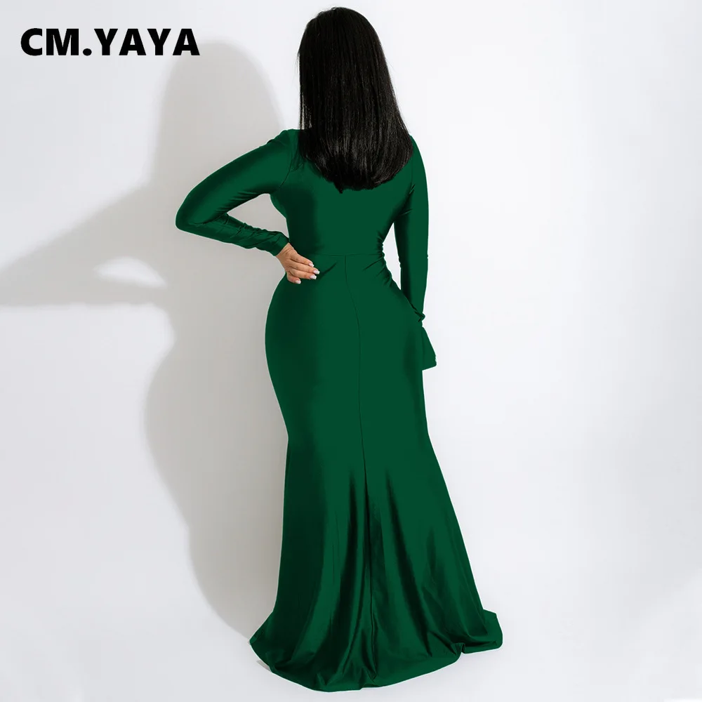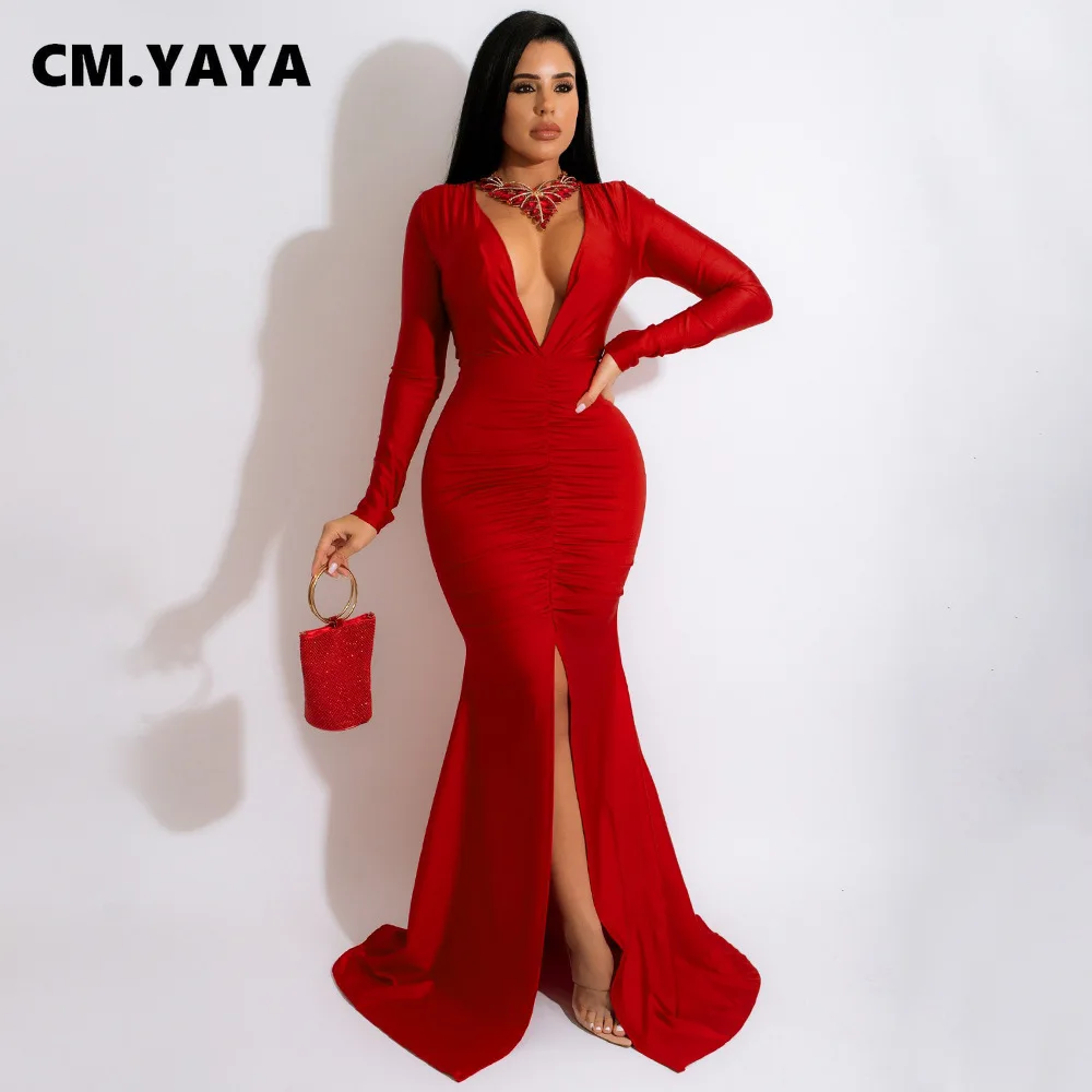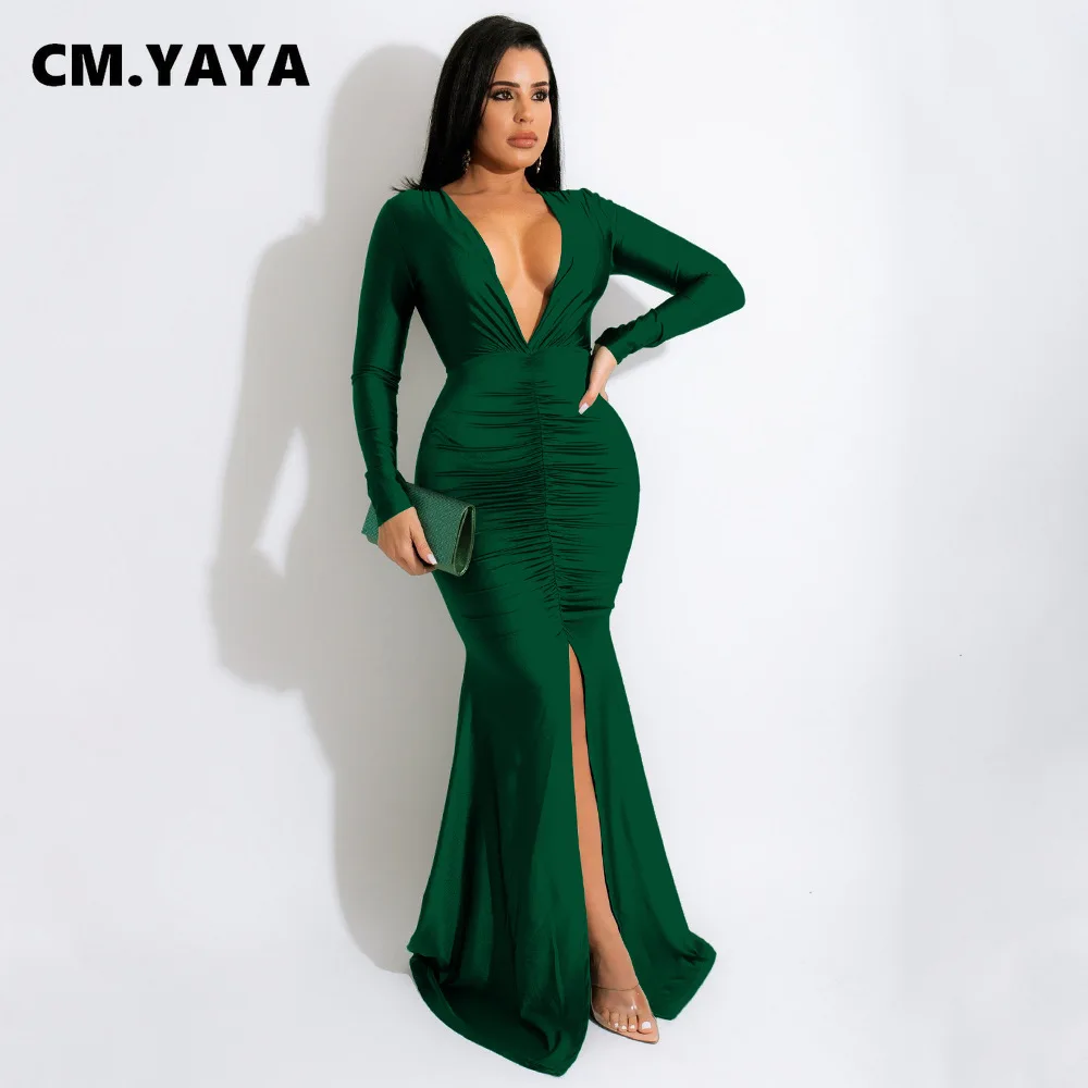 CM.YAYA Women Long Sleeve Ruched High Side Slit Deep V-neck Bodycon Mermaid Long Dress Sexy Party Club Night Elegant Maxi Dress