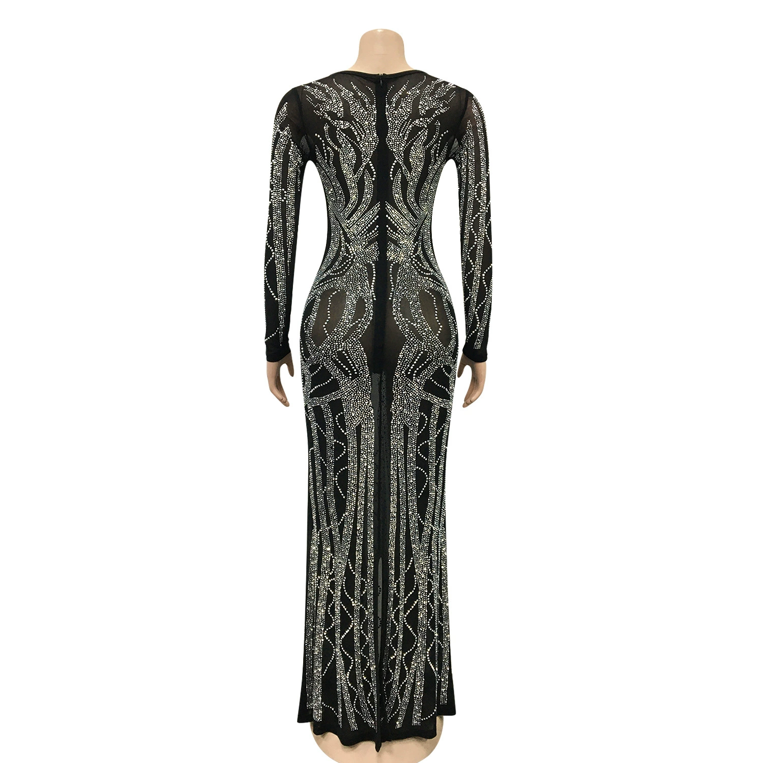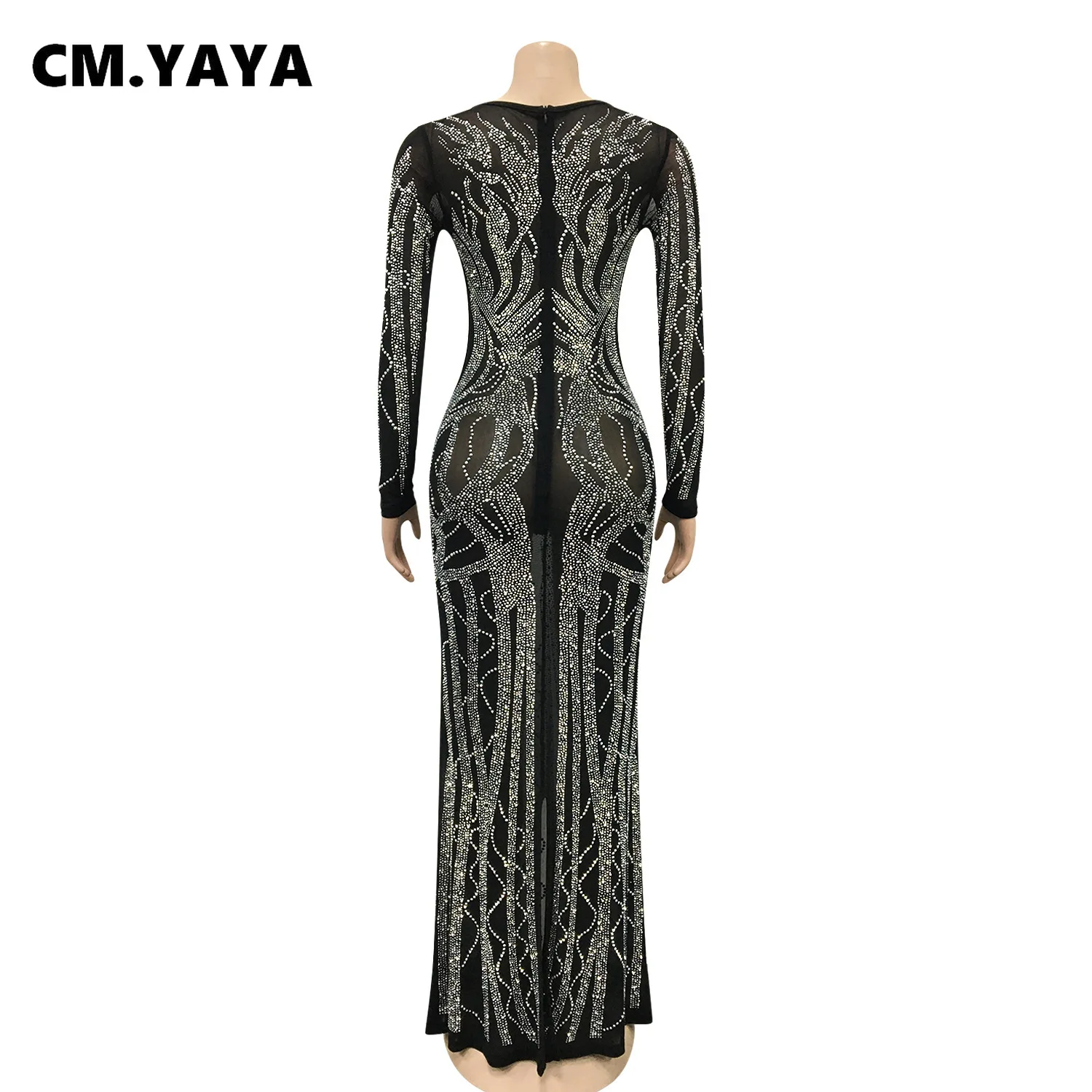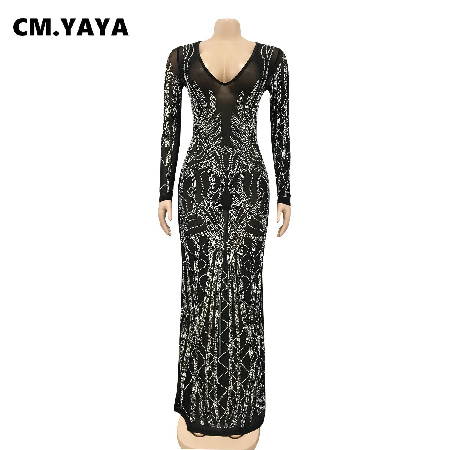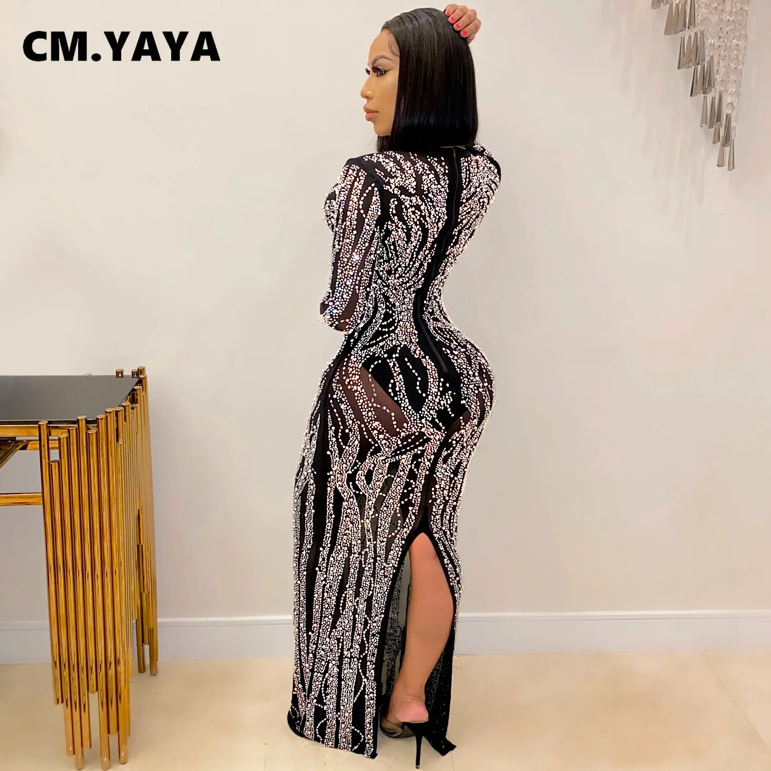 CM.YAYA Women Long Sleeve V-neck Hot Rhinestones Slit Back Crystal Bodycon Maxi Dress Sexy Club Party Pencil Evening Long Dress