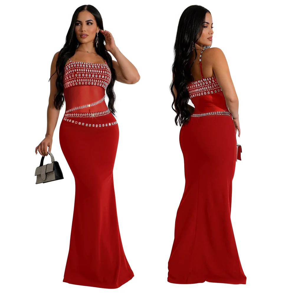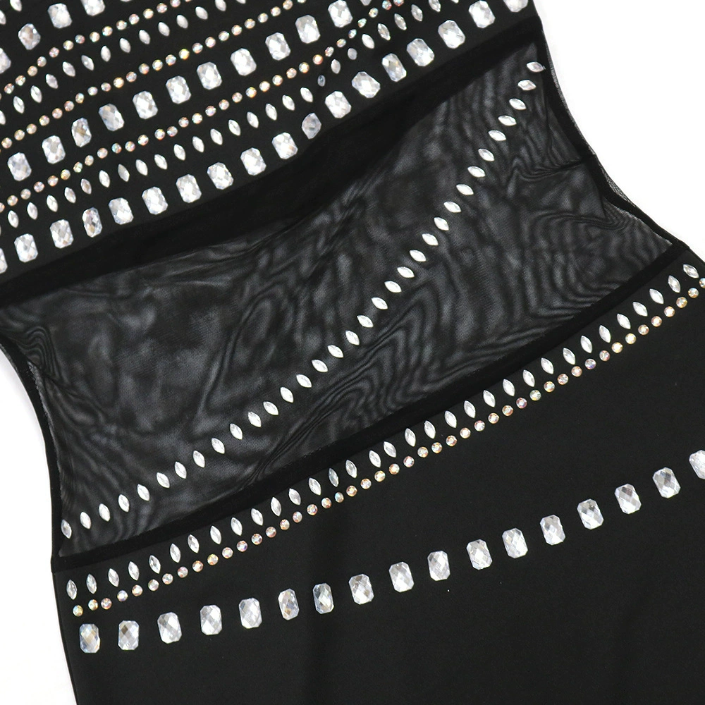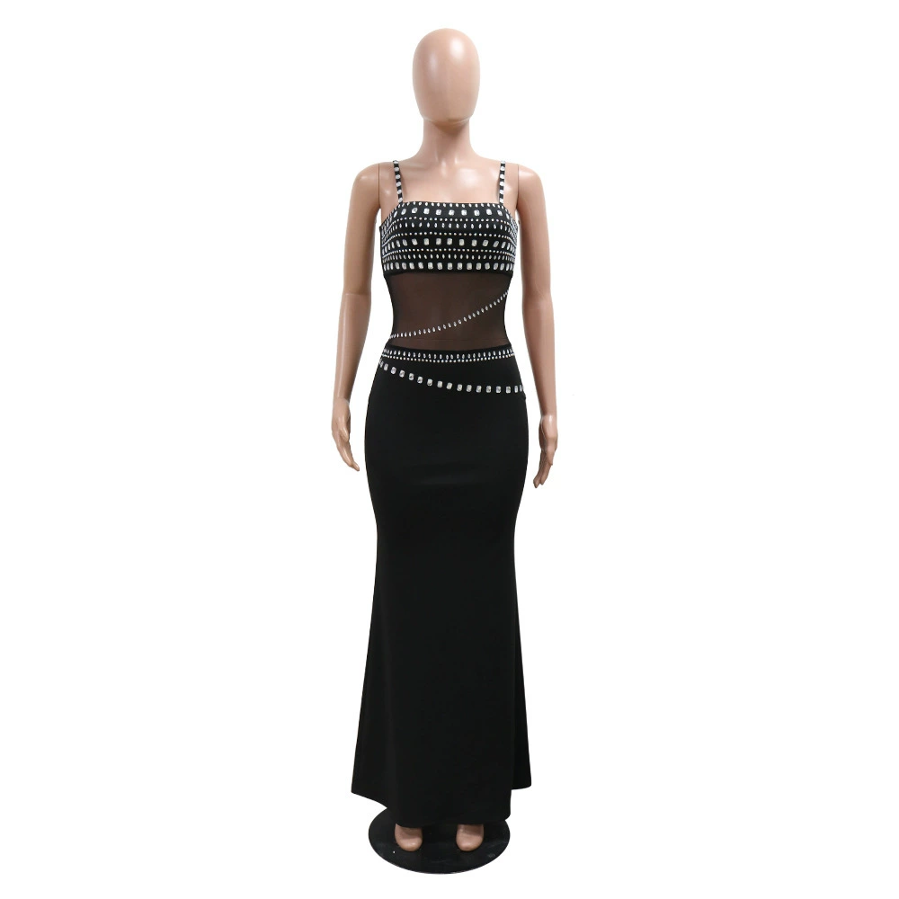 CM.YAYA Women Mesh See Though Diamonds Hot Rhinestones Strap Bodycon Midi Maxi Dress 2024 Evening Party Club Party Long Dresses
