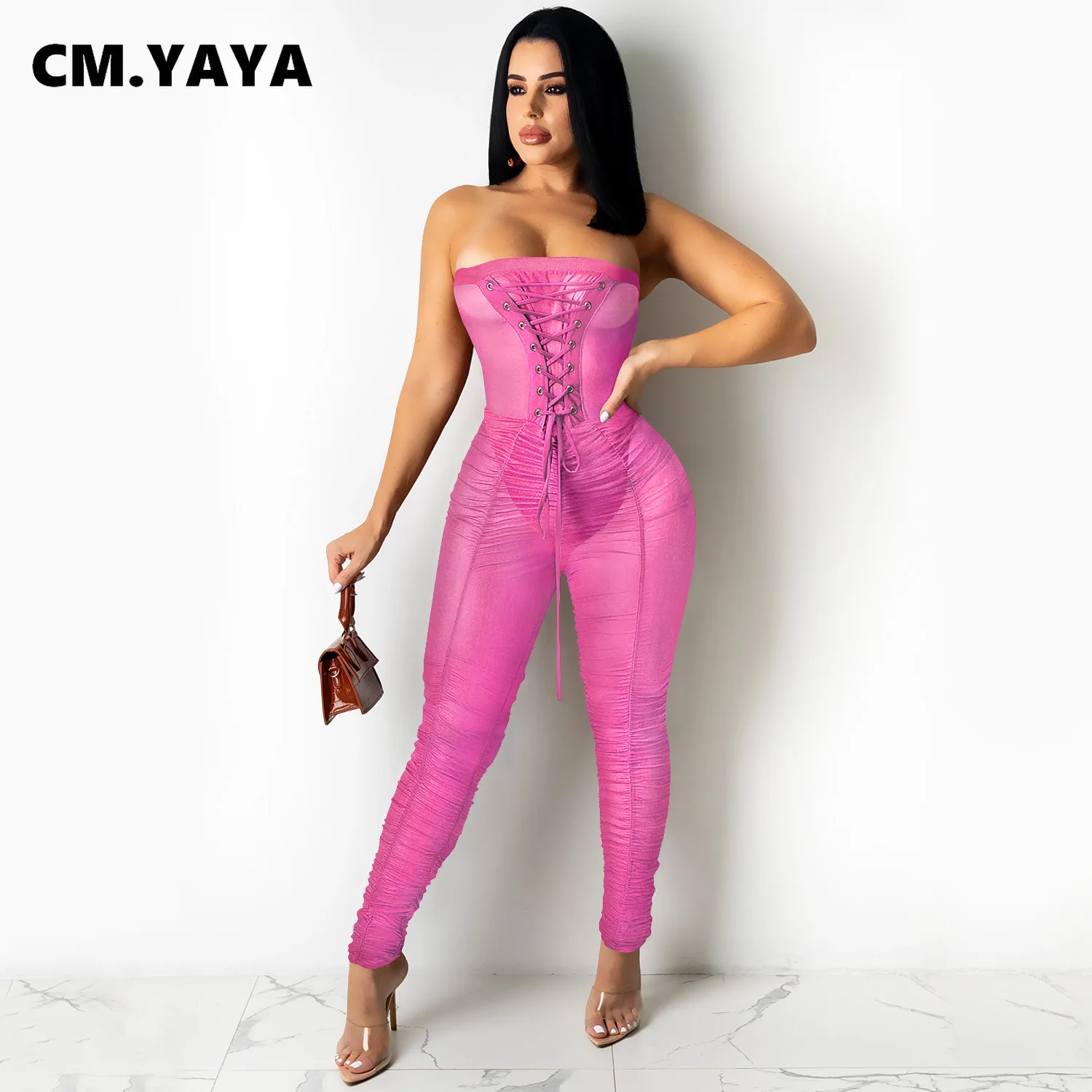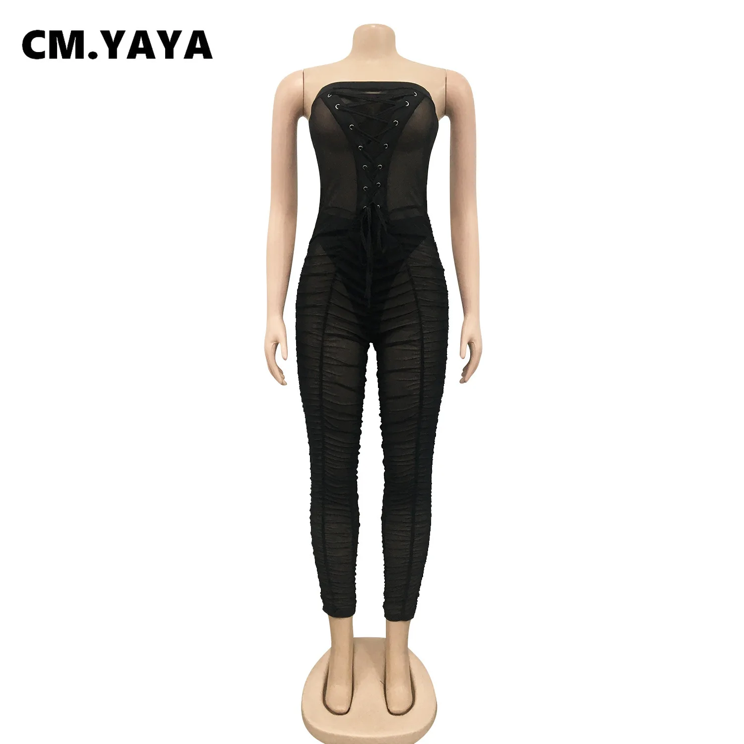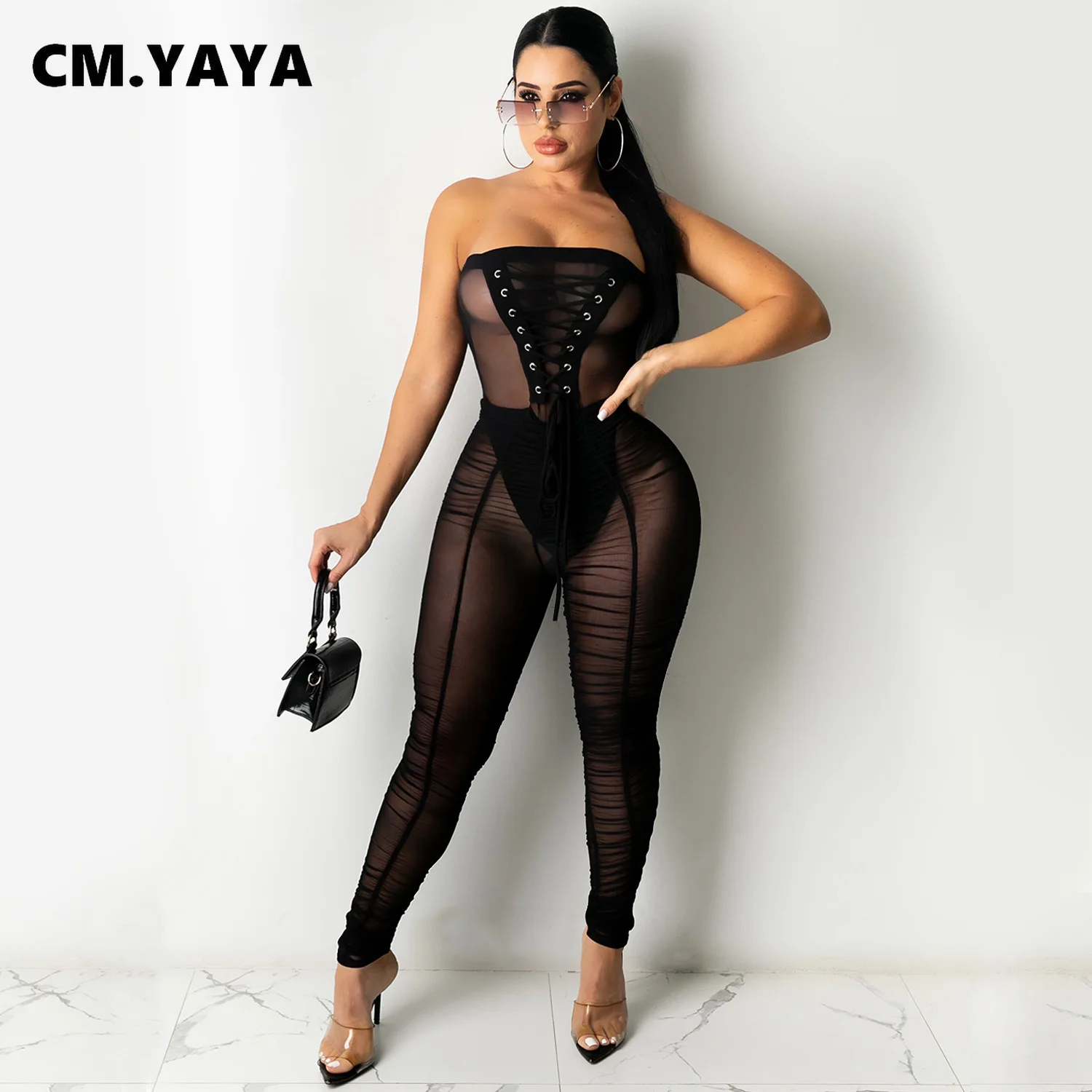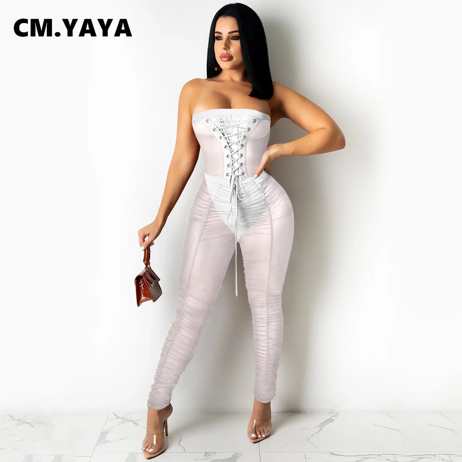 CM.YAYA Women Mesh See Though Lace Up Strapless Jumpsuit Beach Sexy Night Party Stacked Ruched Romper Summer Overalls
