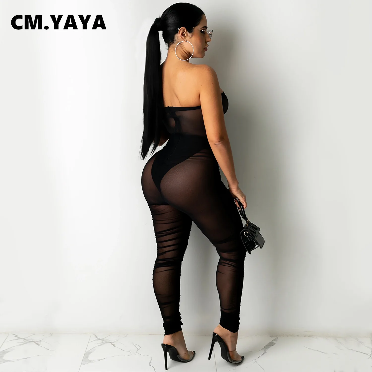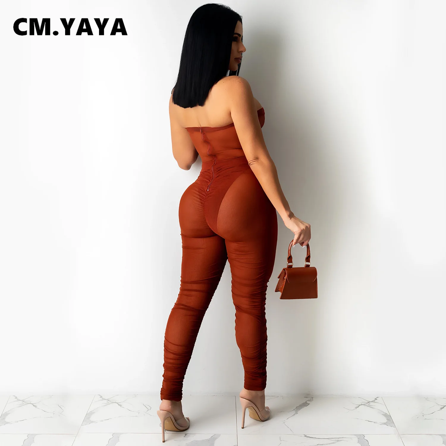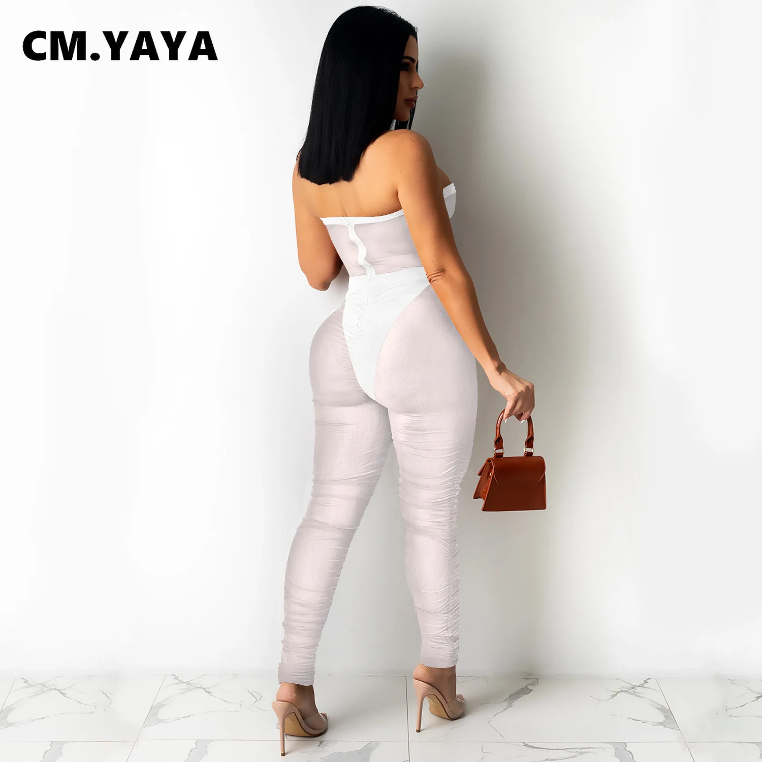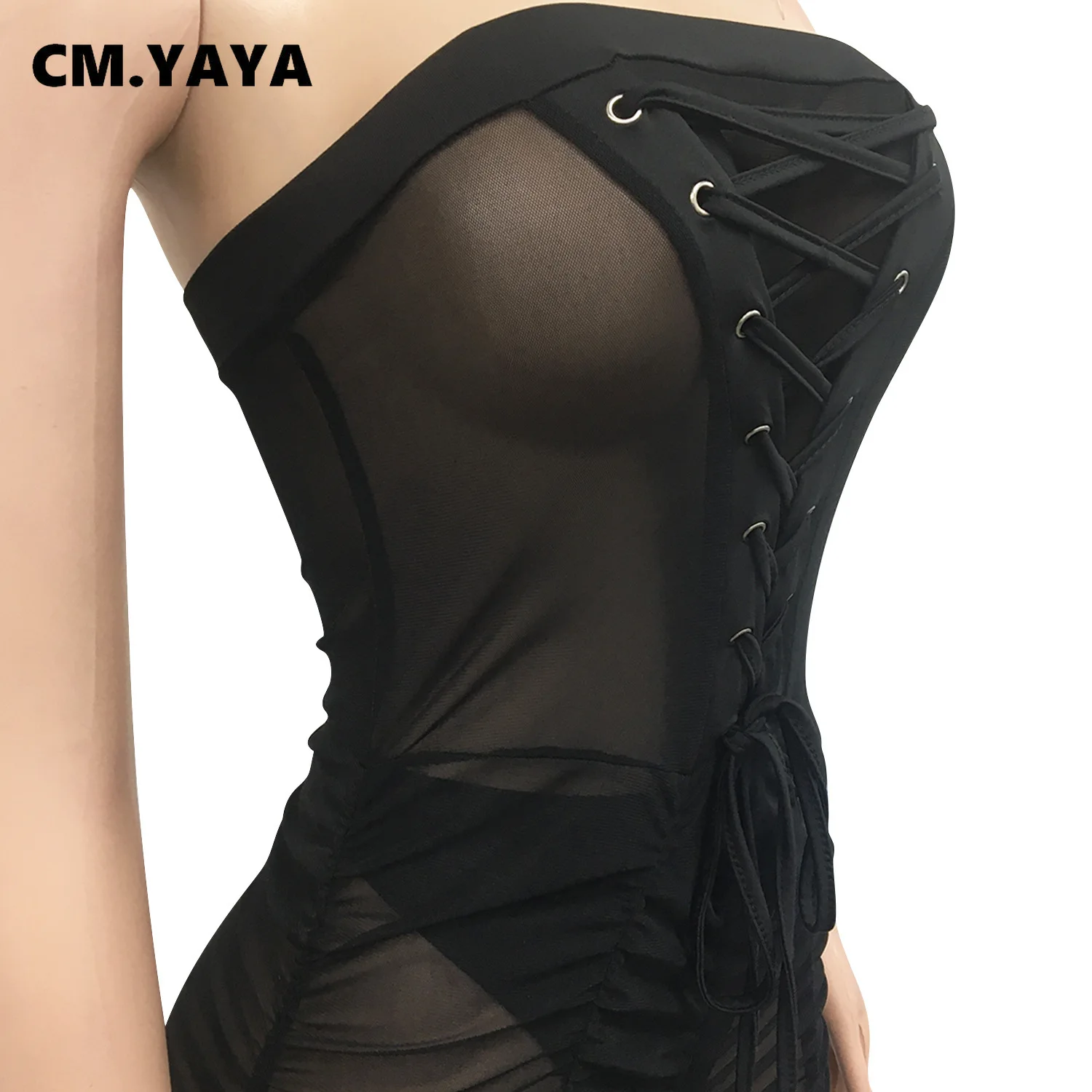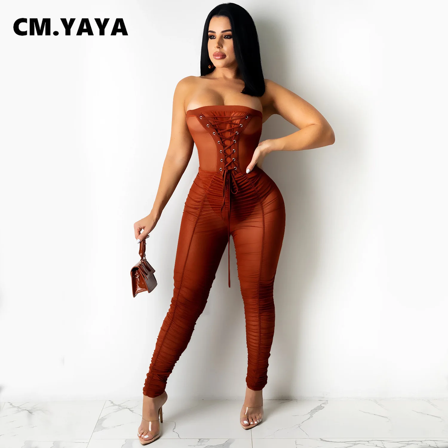 CM.YAYA Women Mesh See Though Lace Up Strapless Jumpsuit Beach Sexy Night Party Stacked Ruched Romper Summer Overalls