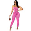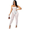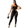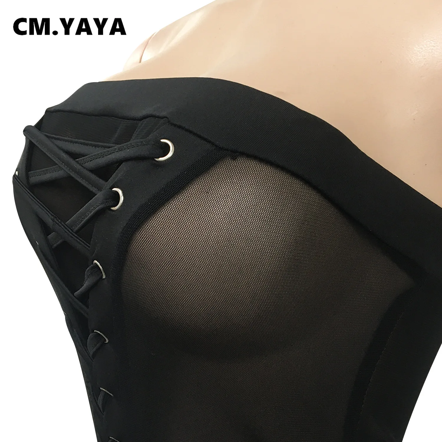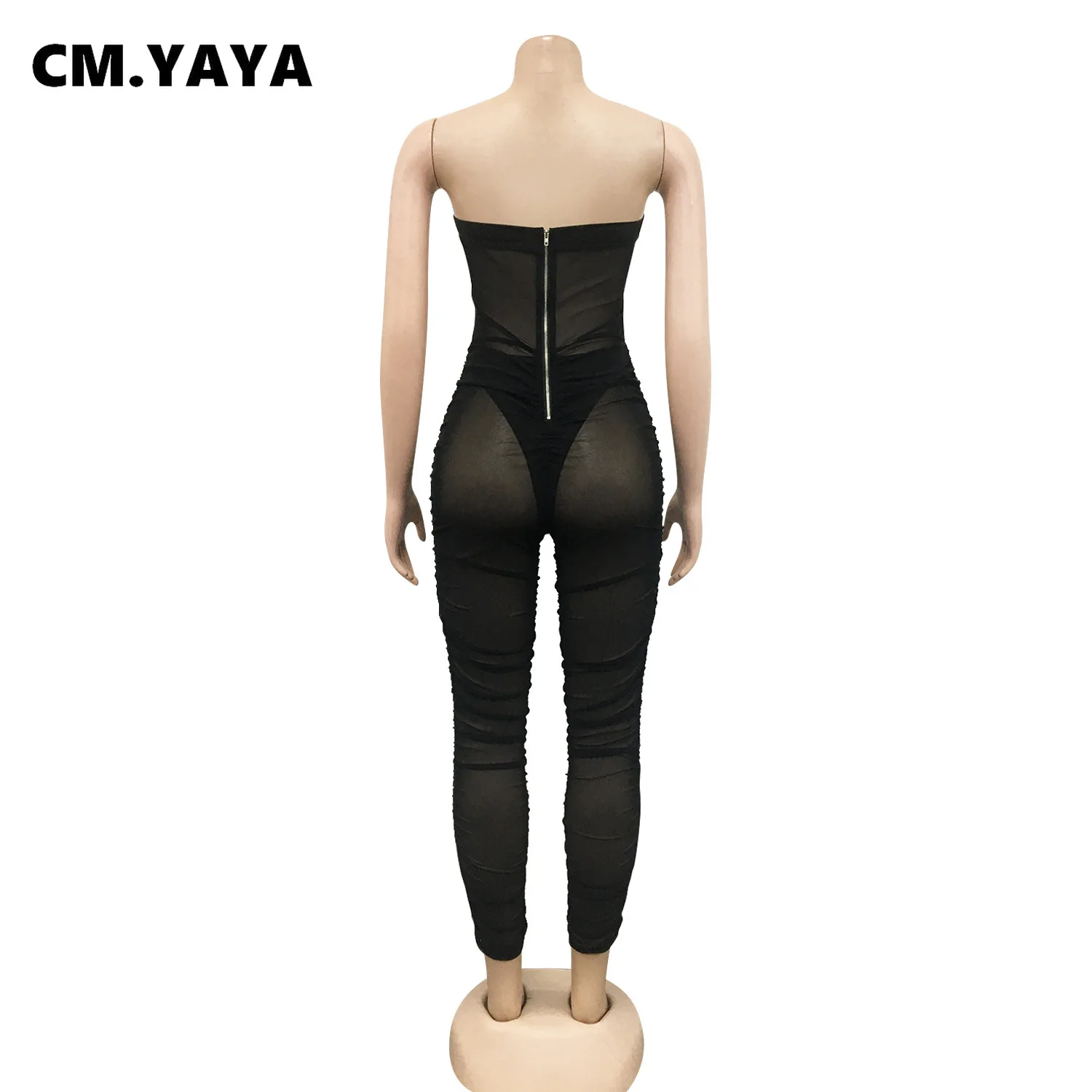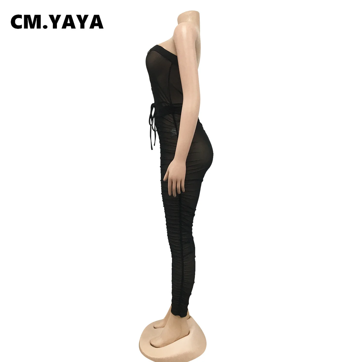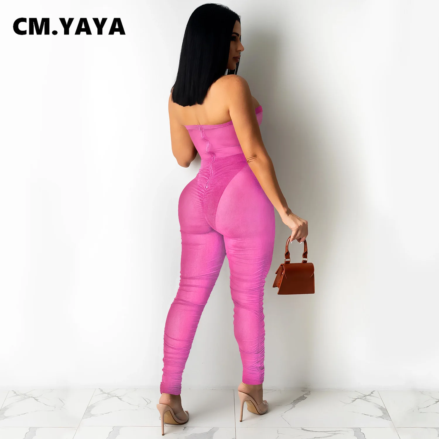 CM.YAYA Women Mesh See Though Lace Up Strapless Jumpsuit Beach Sexy Night Party Stacked Ruched Romper Summer Overalls