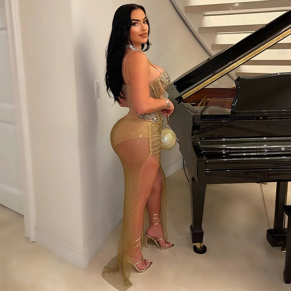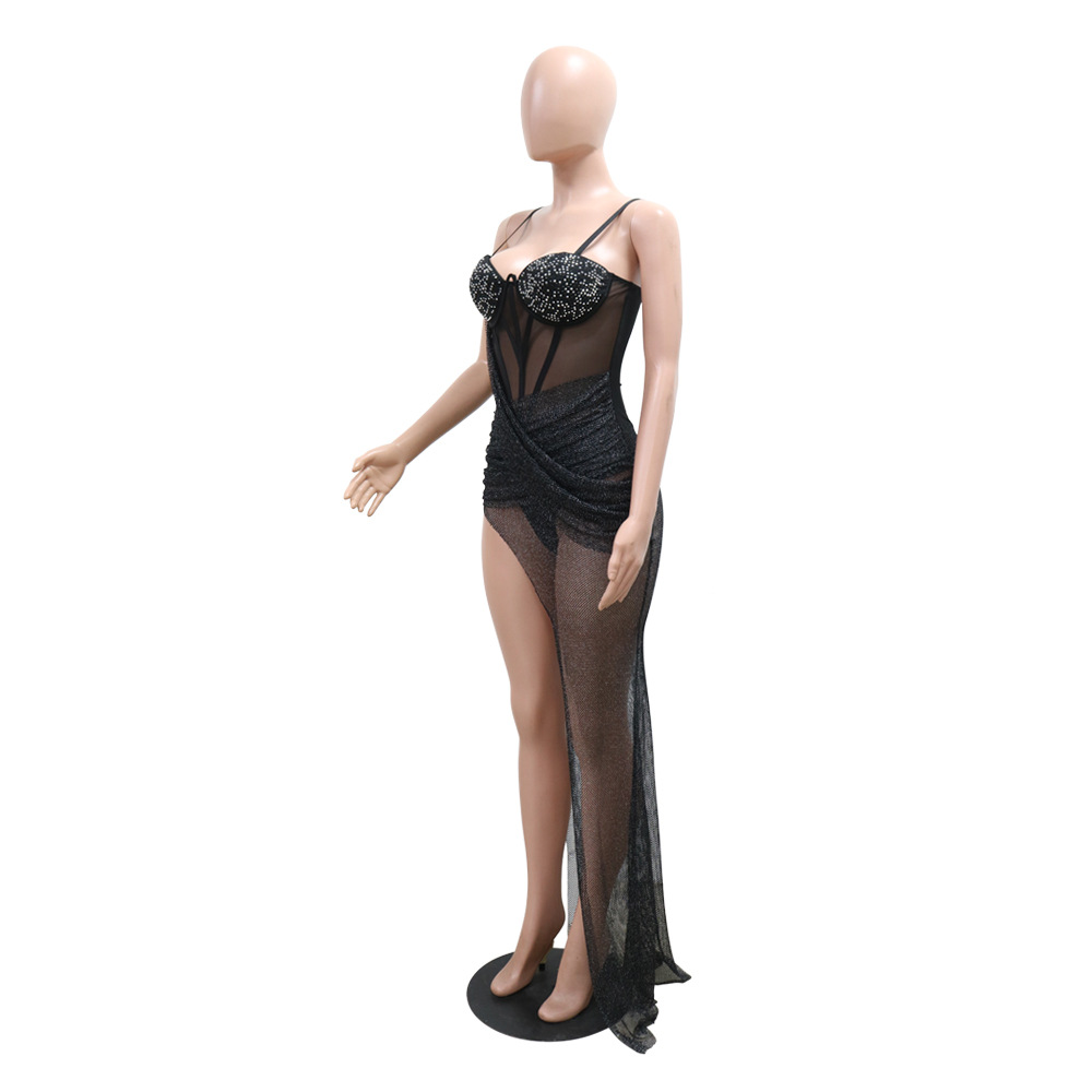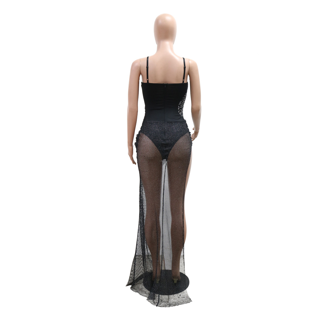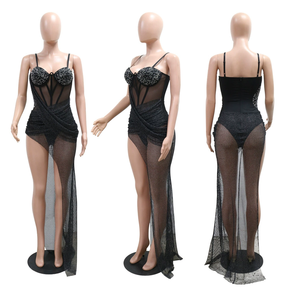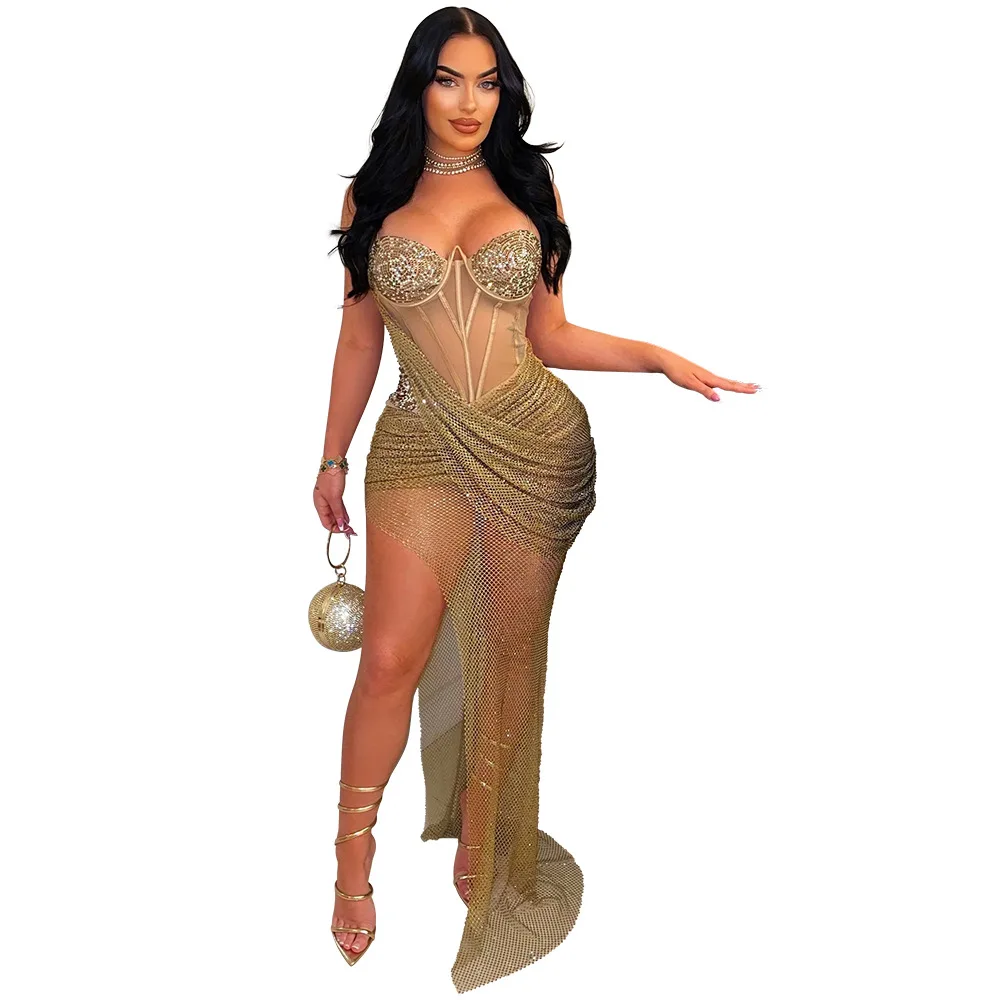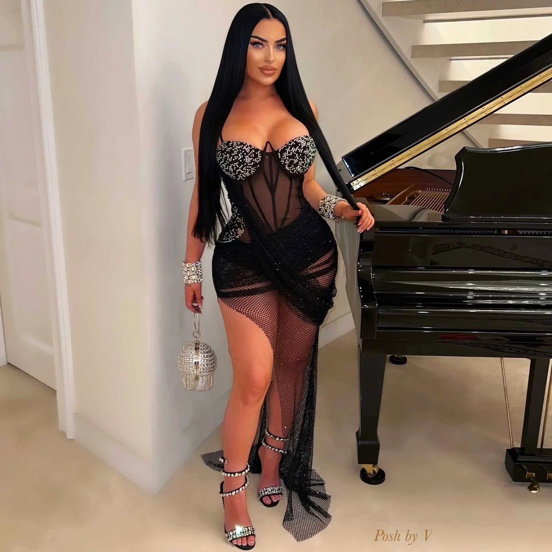 CM.YAYA Women Mesh Strapless Perspective Rhinestone Strap Maxi Long Dress 2024 Vestidos Sexy Party Evenning Birthday Dresses