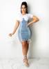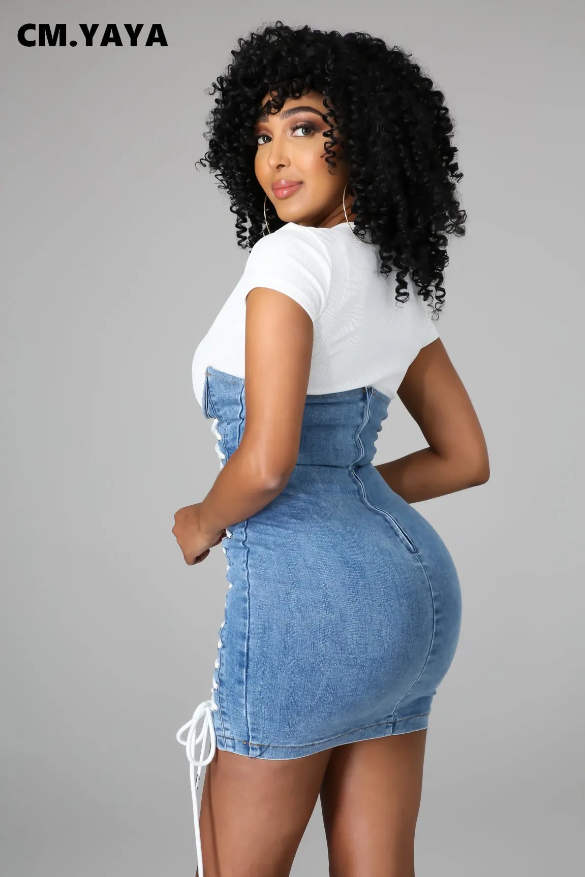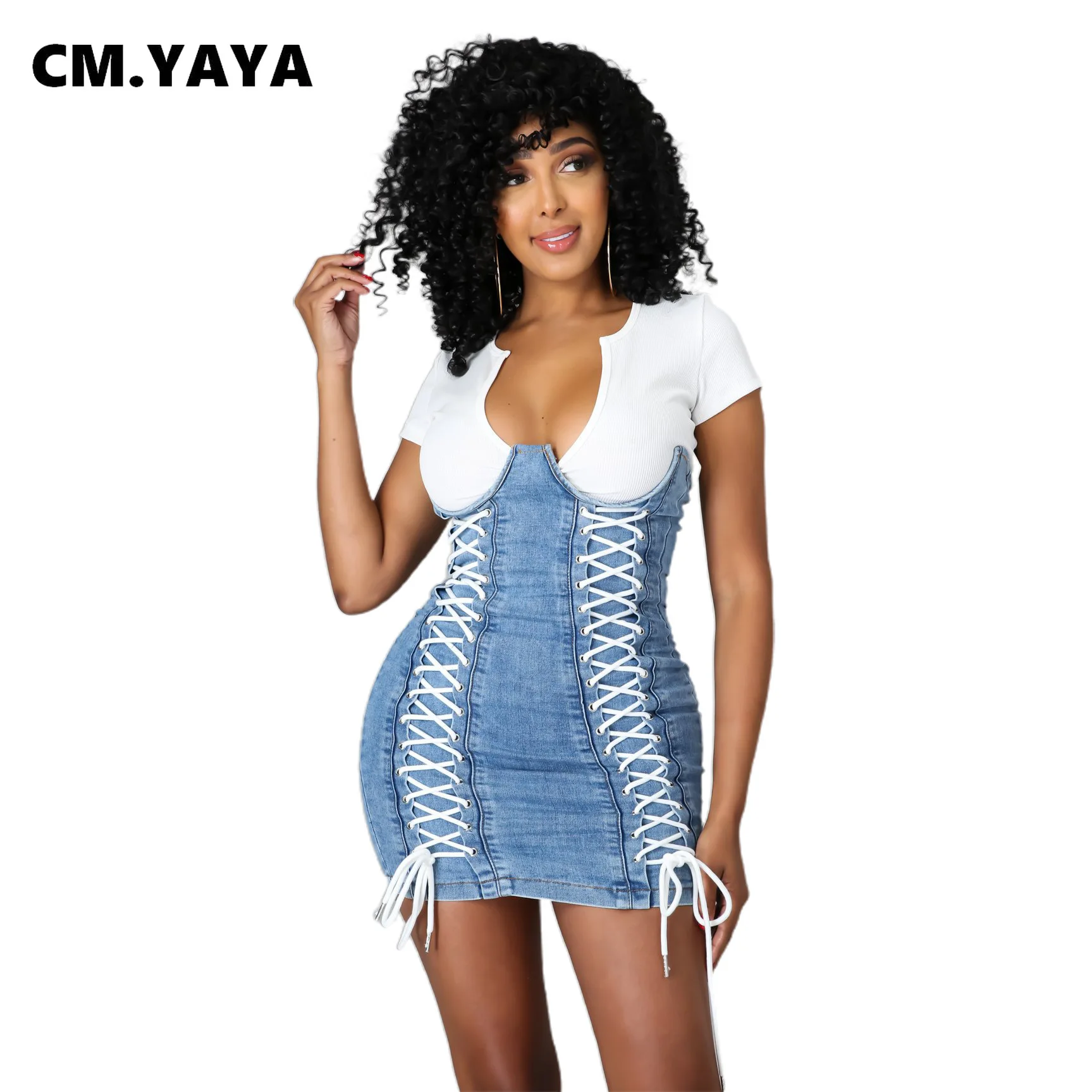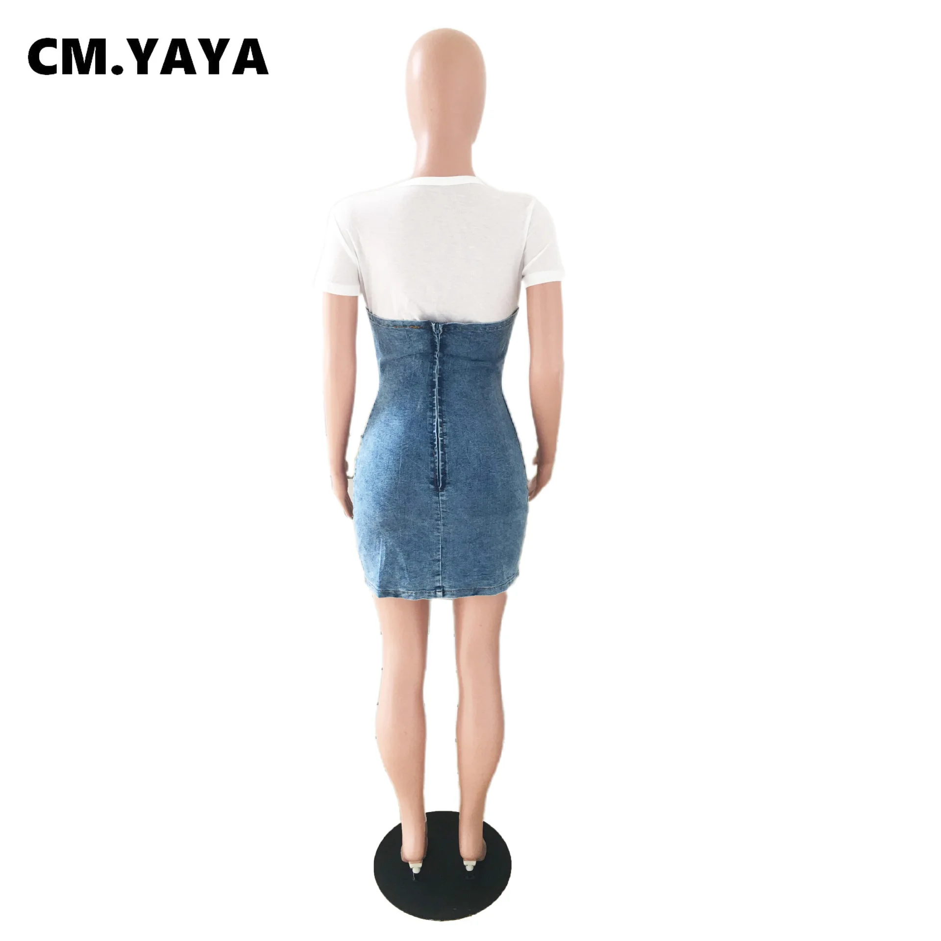 CM.YAYA Women Mini Dress Patchwork Denim Short Sleeve Bandage Back Zip Stretchy Bodycon Dresses Fashion Vestidos Summer Outfits