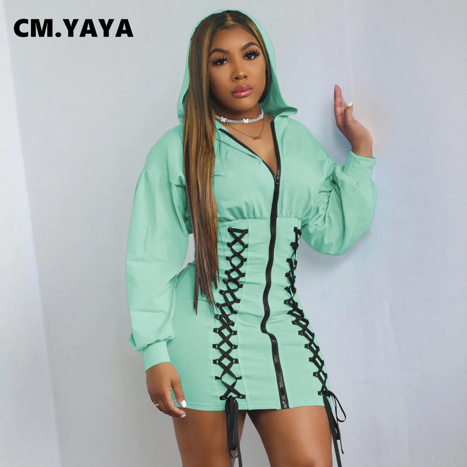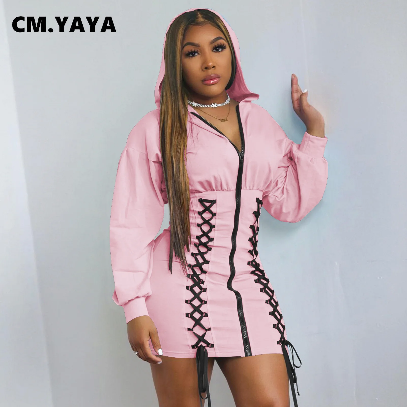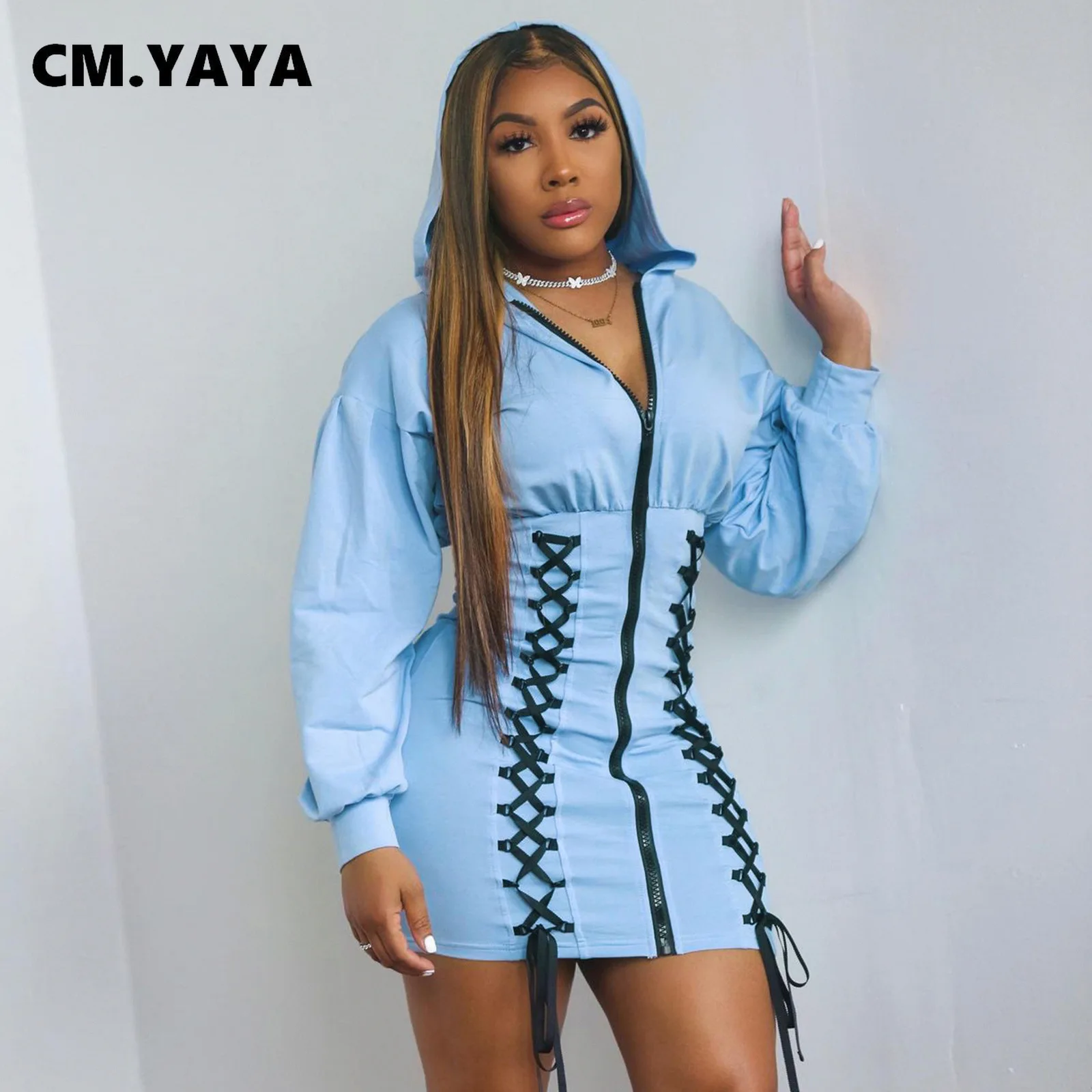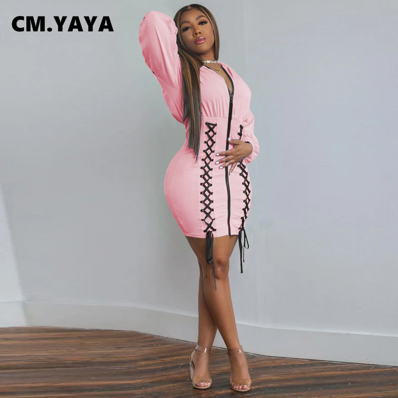 CM.YAYA Women Mini Dress Solid Bandage Hooded Zip Stretchy Bodycon Pencil Dresses Sexy Fashion Vestidos Casual Streetwear Autumn