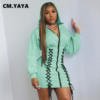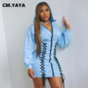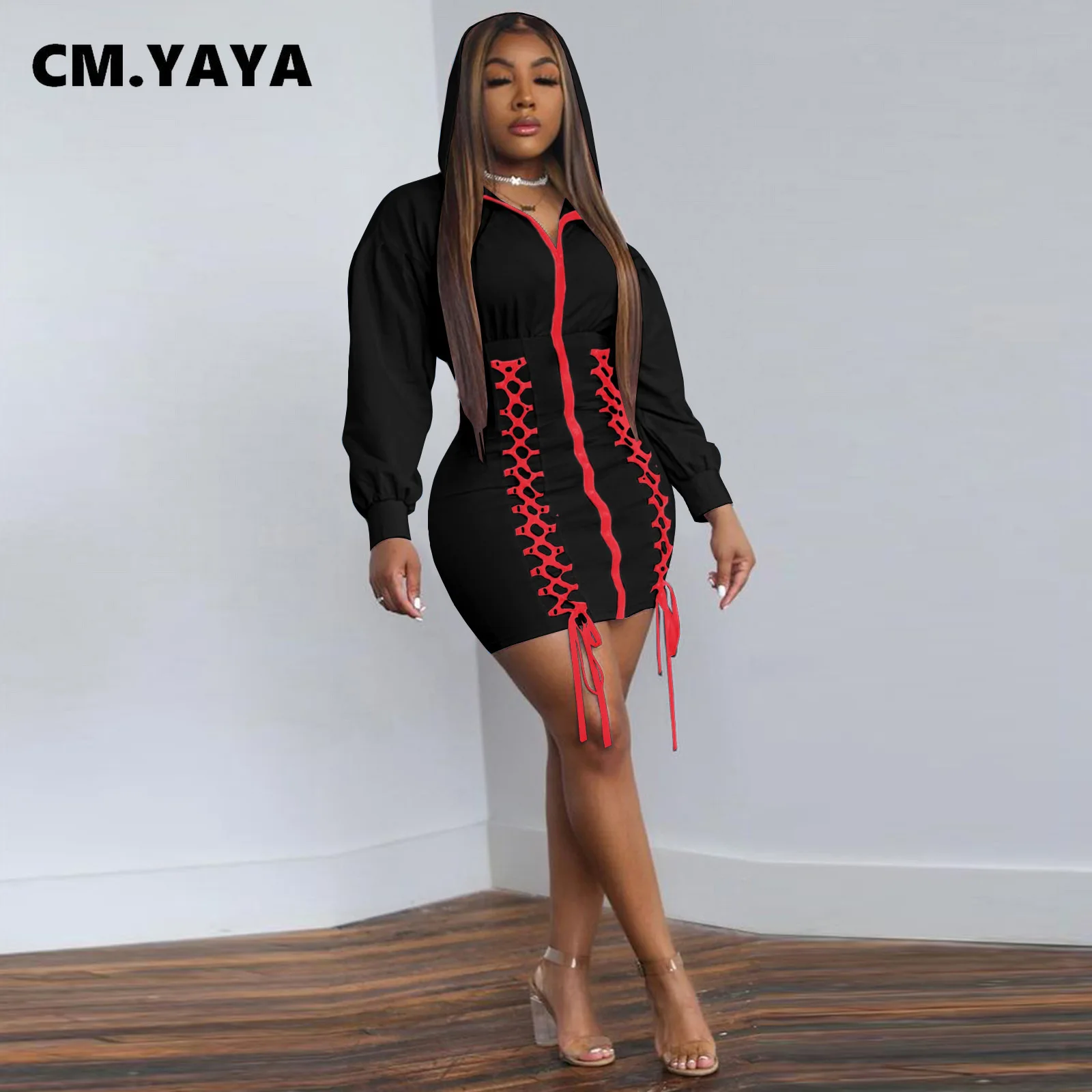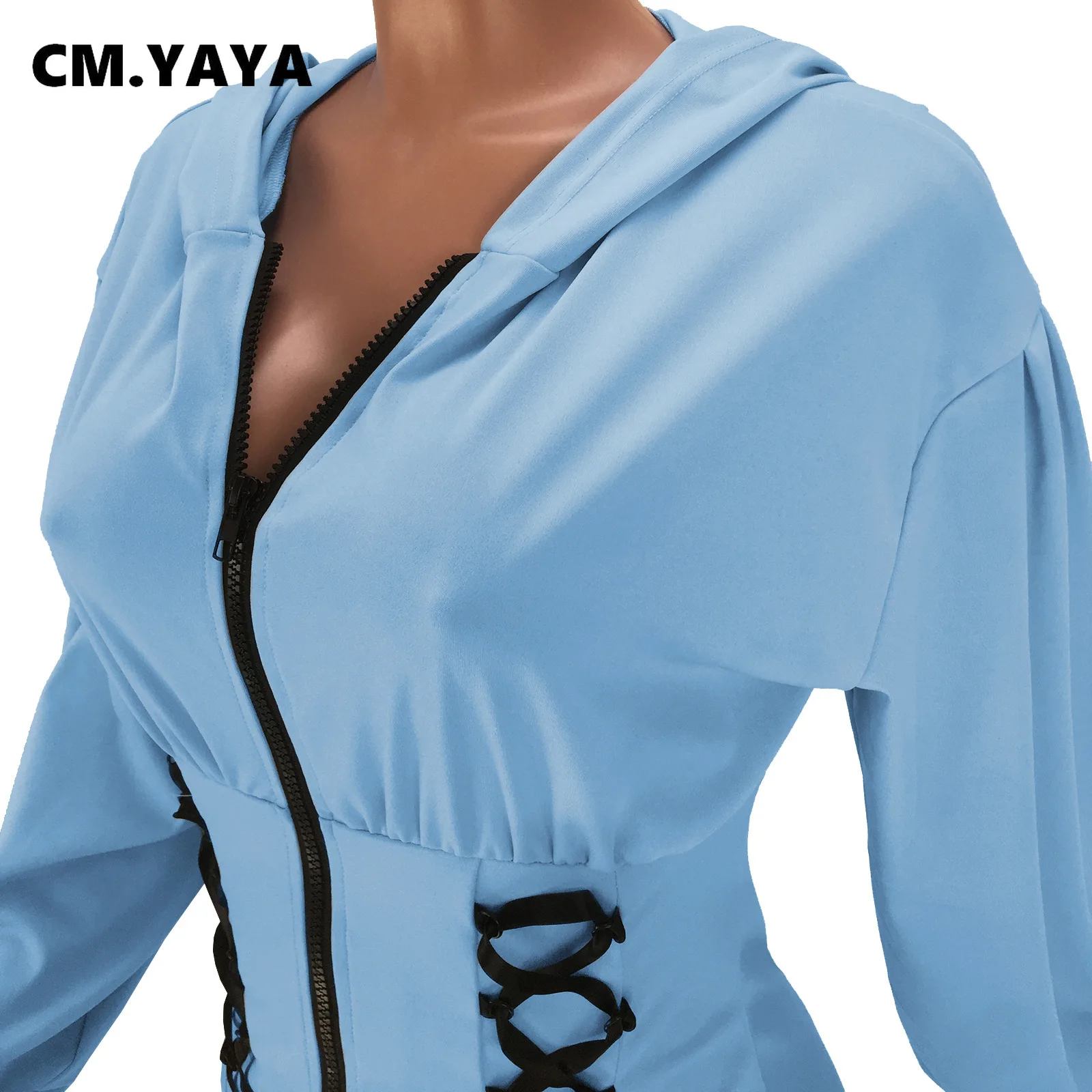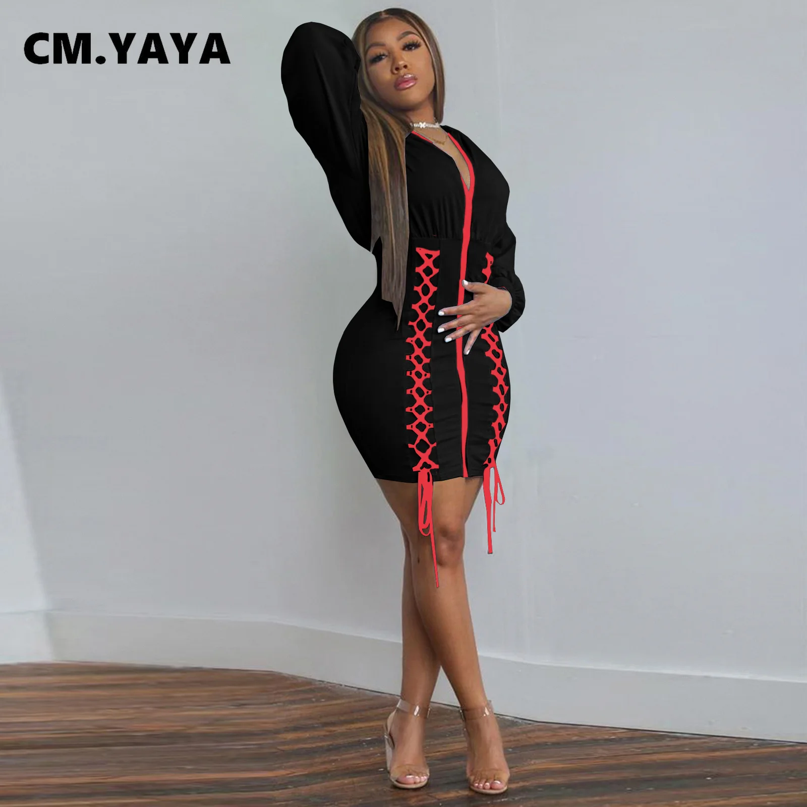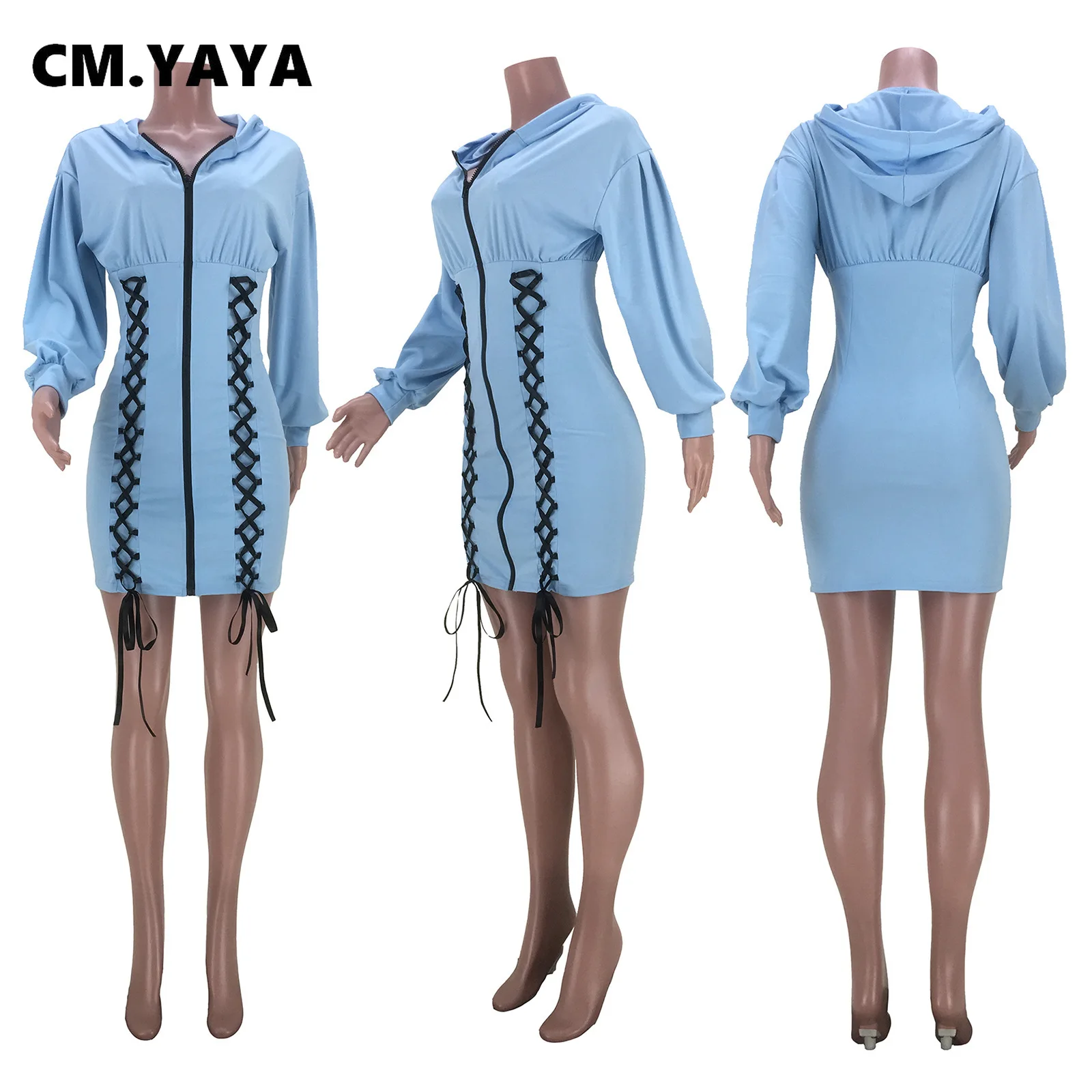 CM.YAYA Women Mini Dress Solid Bandage Hooded Zip Stretchy Bodycon Pencil Dresses Sexy Fashion Vestidos Casual Streetwear Autumn