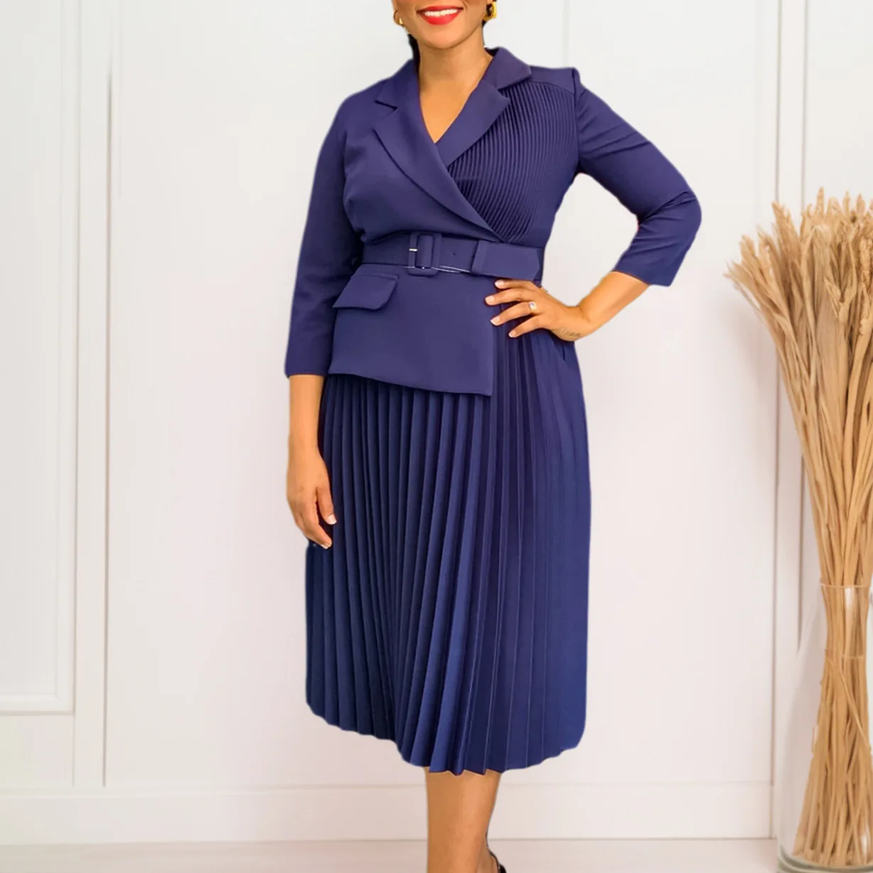 CM.YAYA Women Notched Neck Pleated Blazer Midi Dress 2025 Fall African Sashes Office Lady Vintage Sexy Party 3/4 Sleeve Dresses
