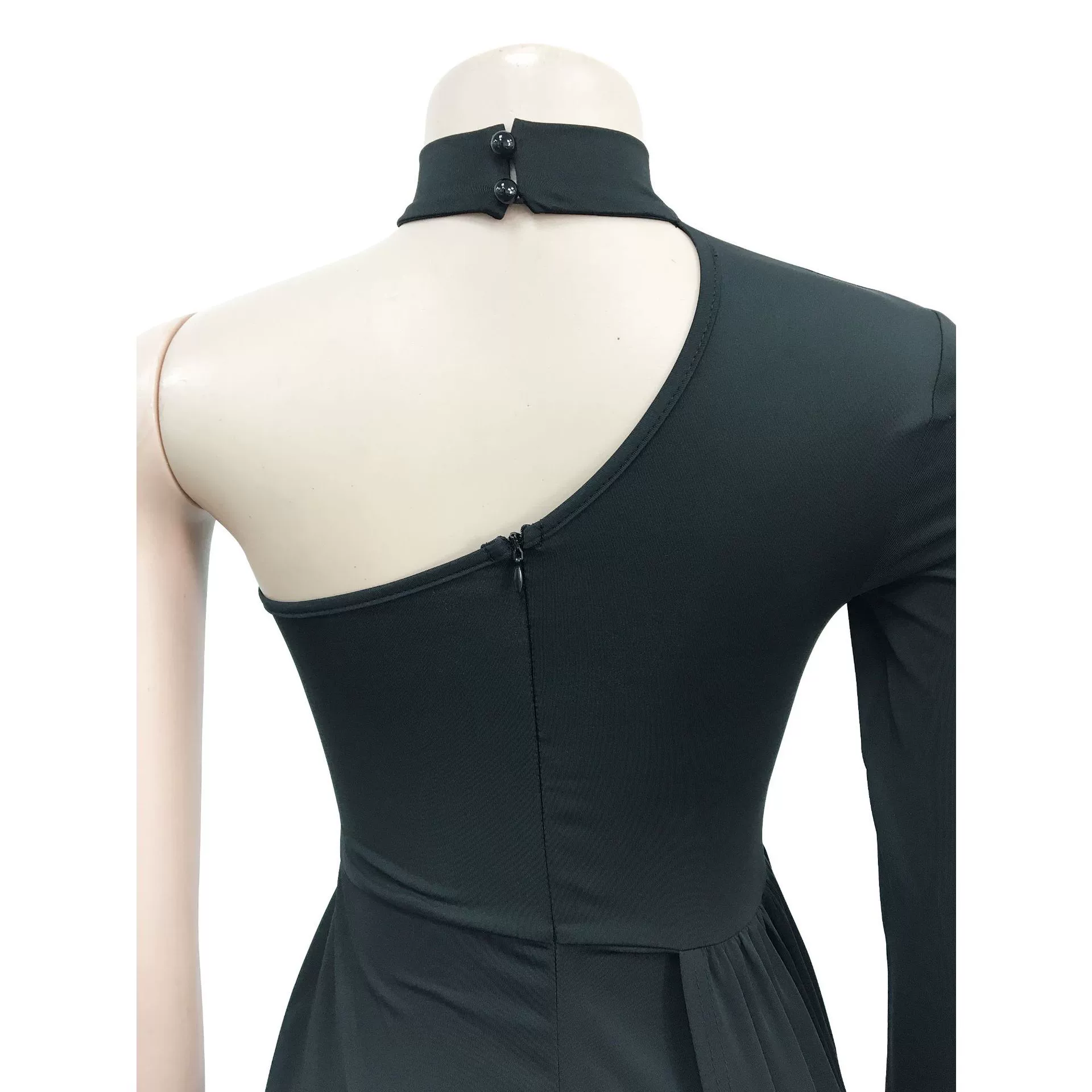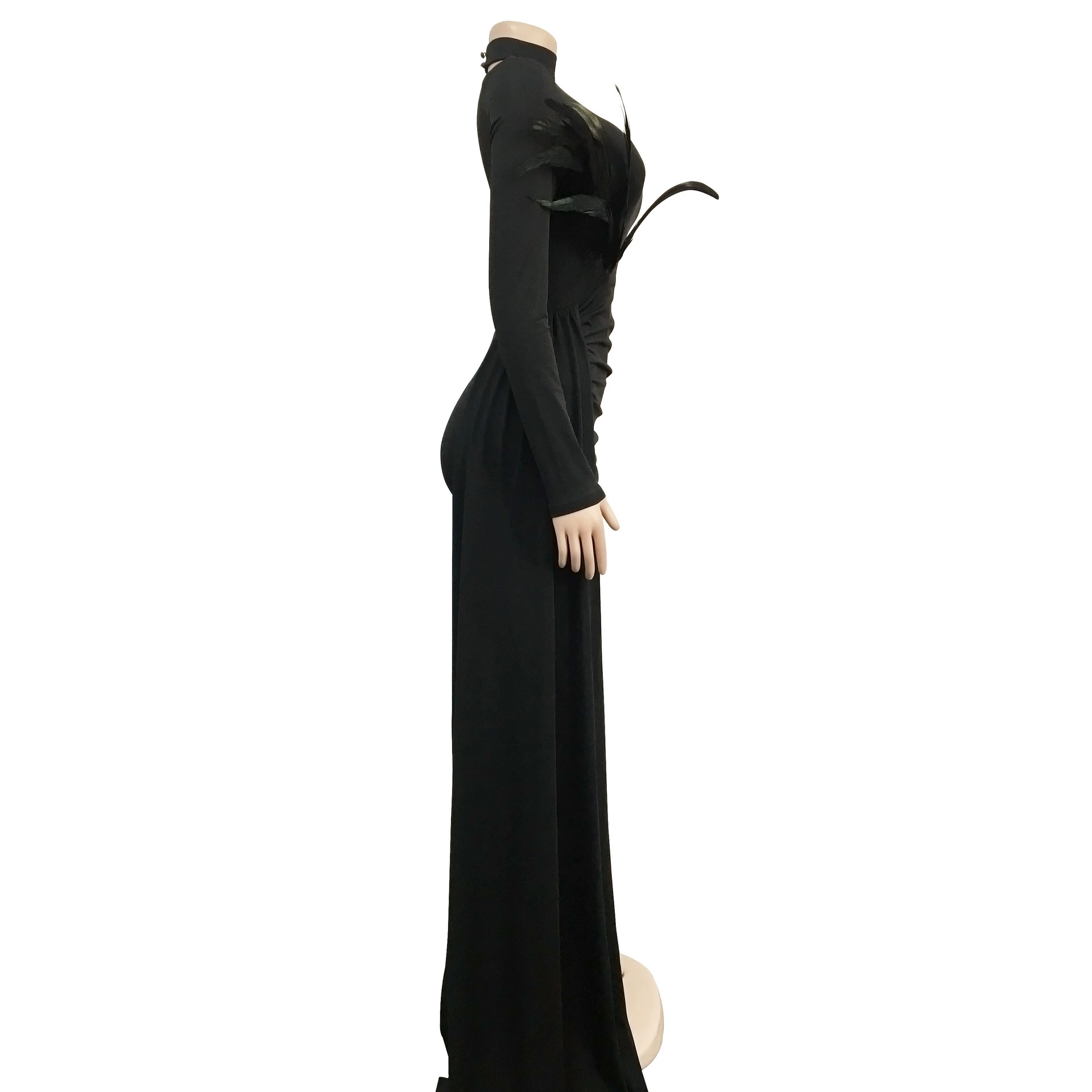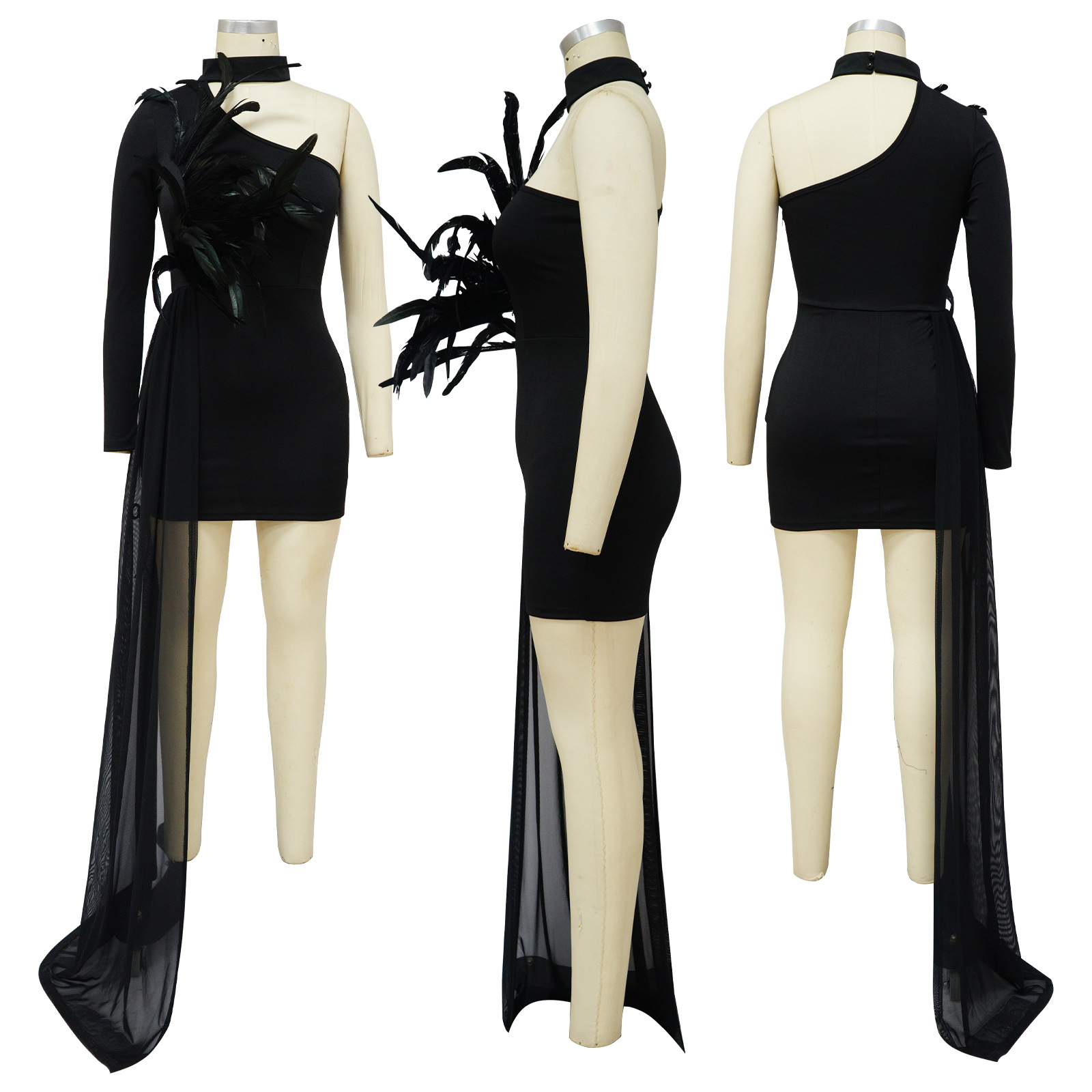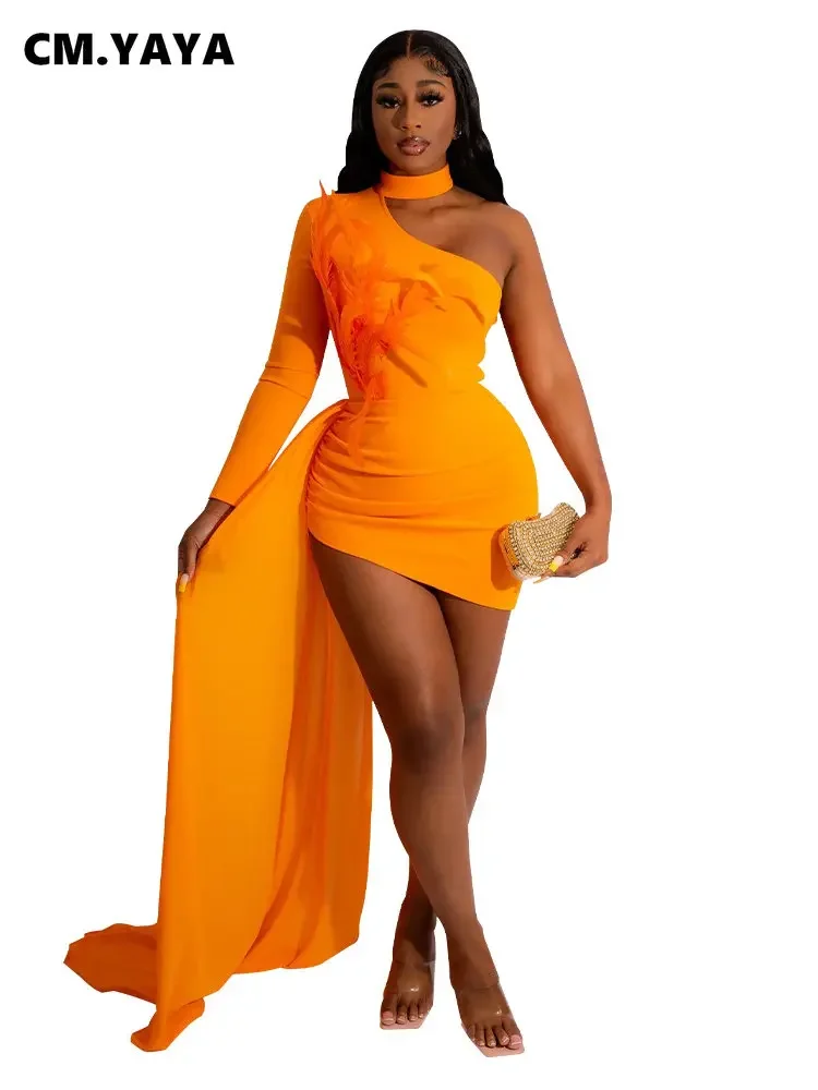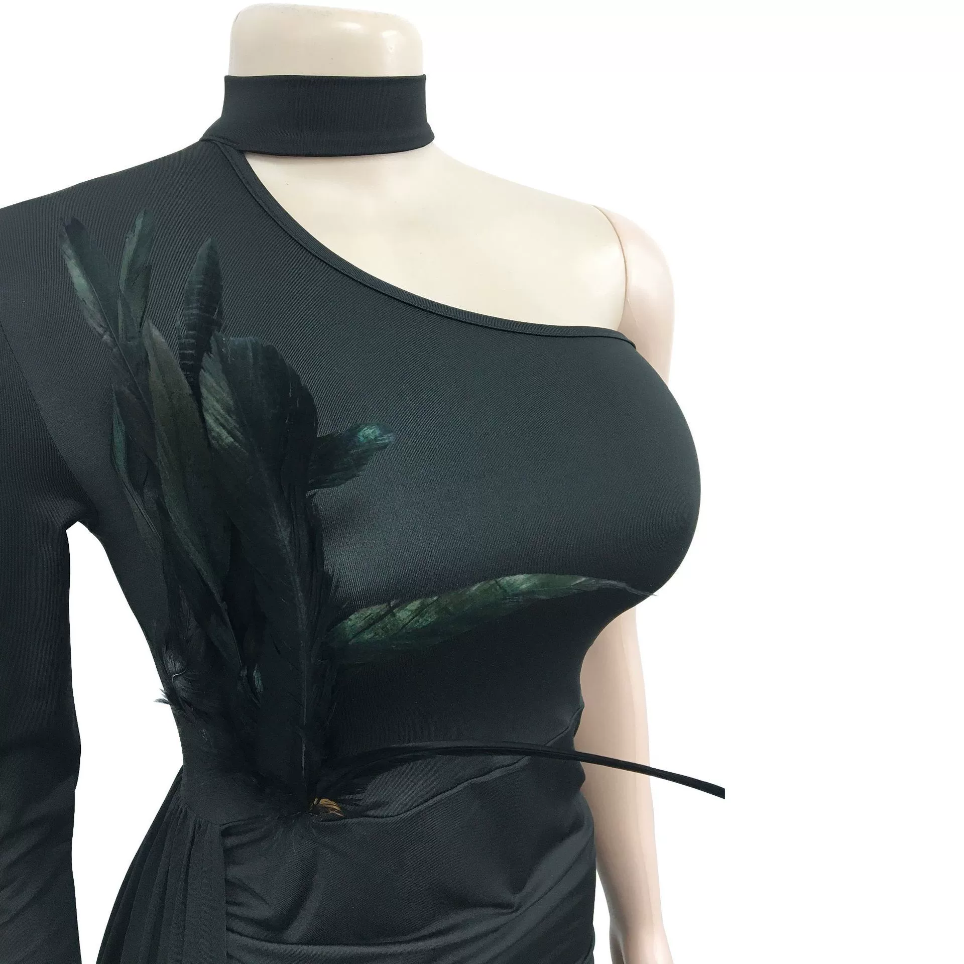 CM.YAYA Women One Long Sleeve Ruched Up Side Asymmetrical Floor Length Streamer Feather Bodycon Midi Dress Sexy Party Dresses