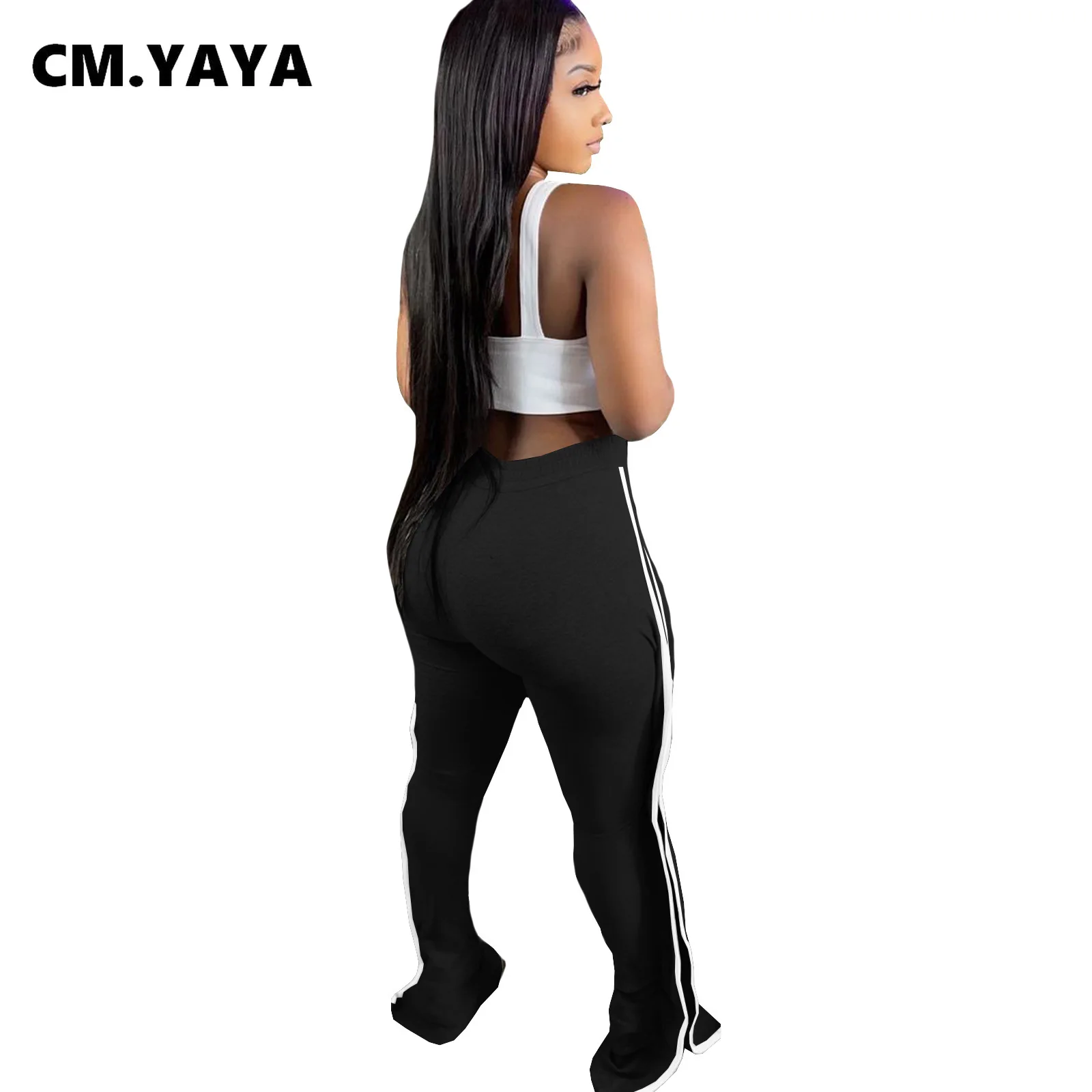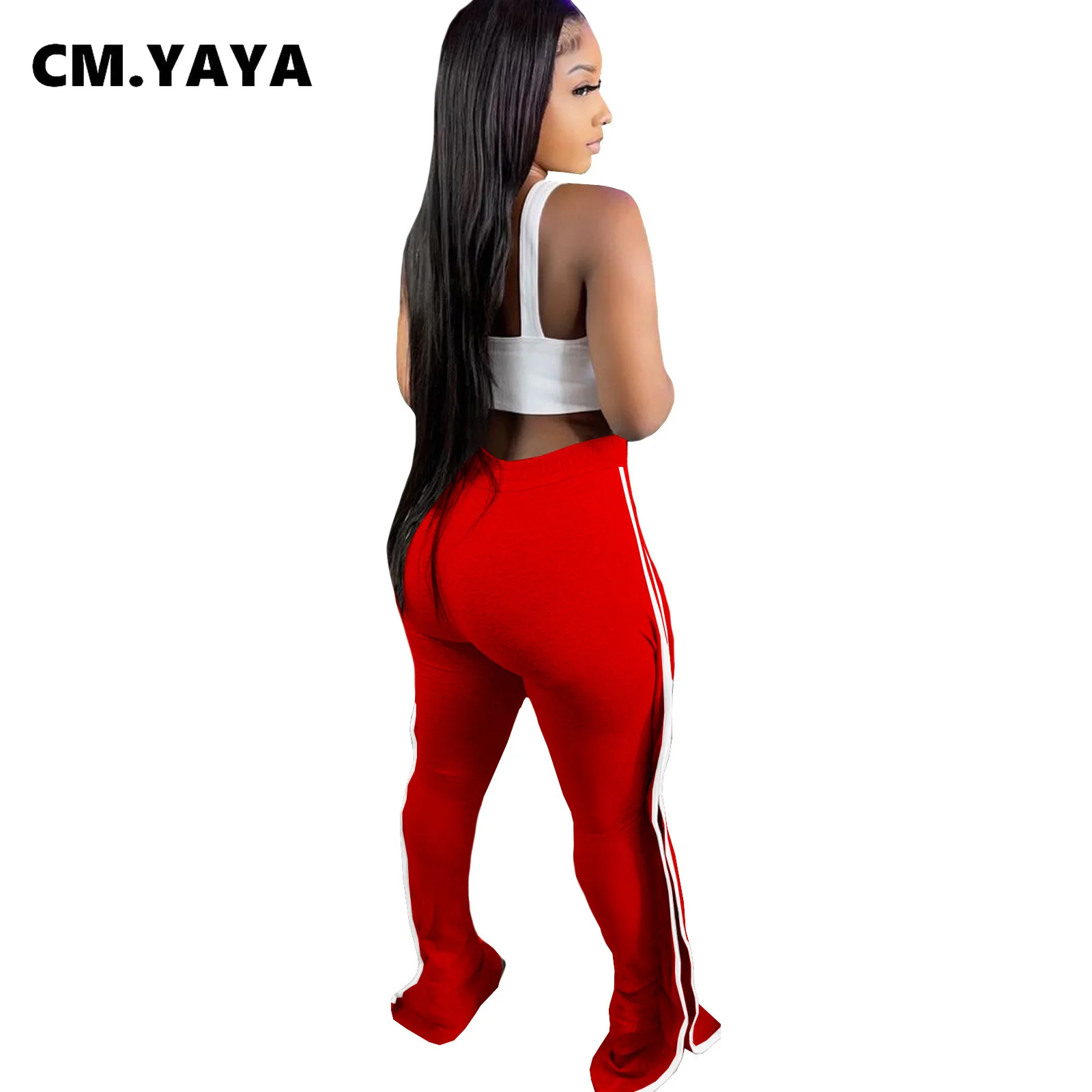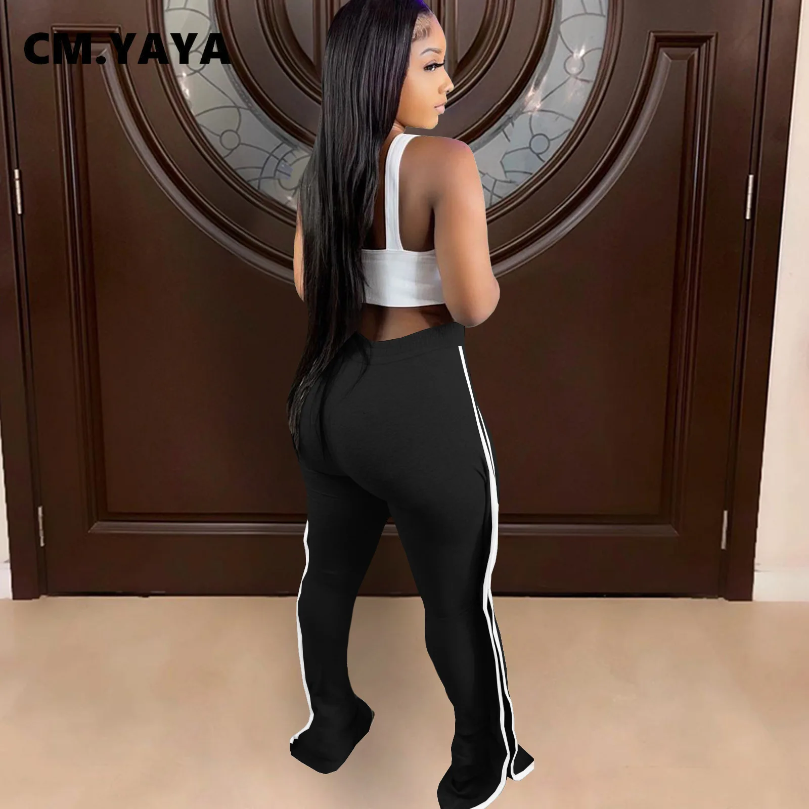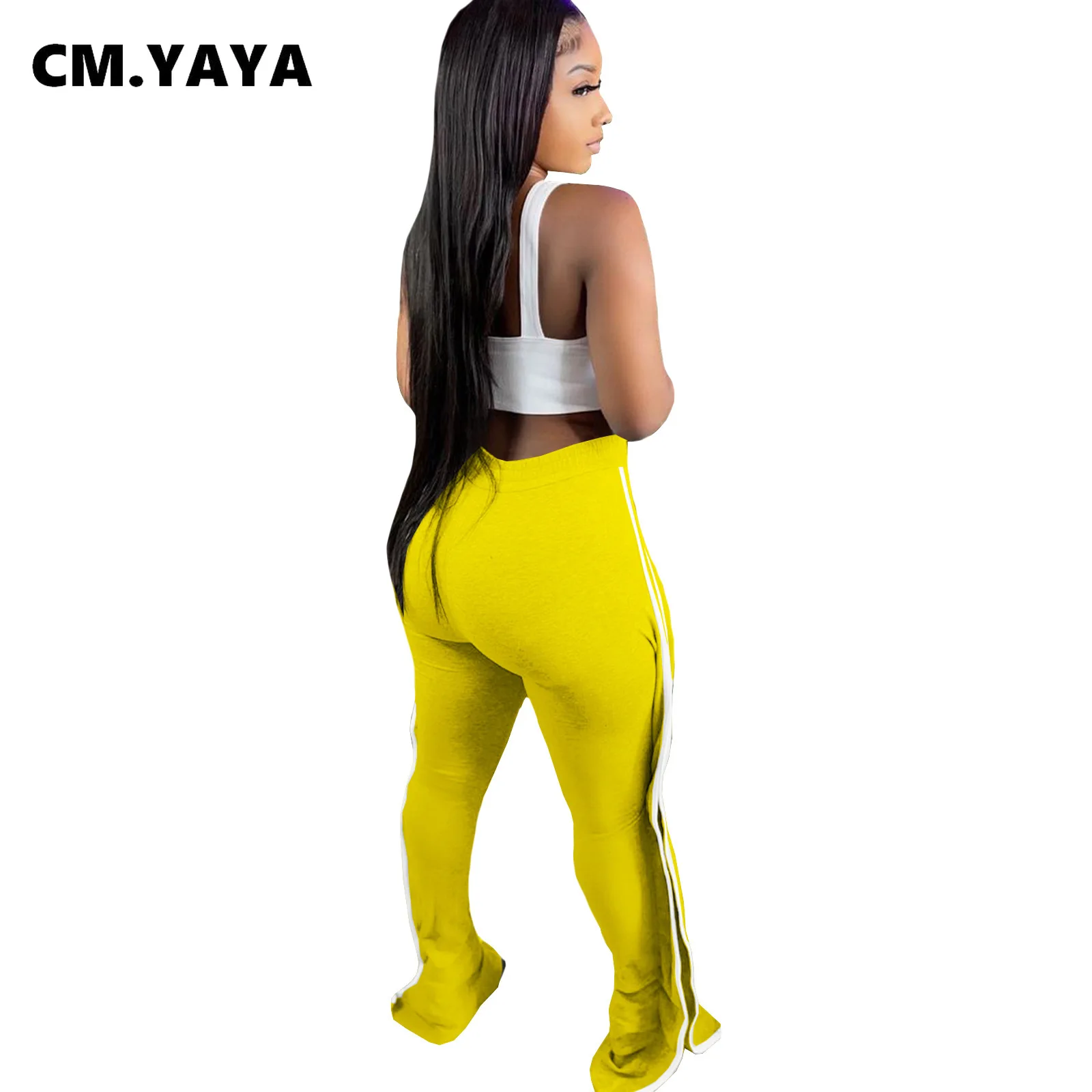 CM.YAYA Women Pant Elastic Mid Waist Patchwork Stretchy Skinny Bodycon Flare Pants Fashion Casual Trouser Summer 2021