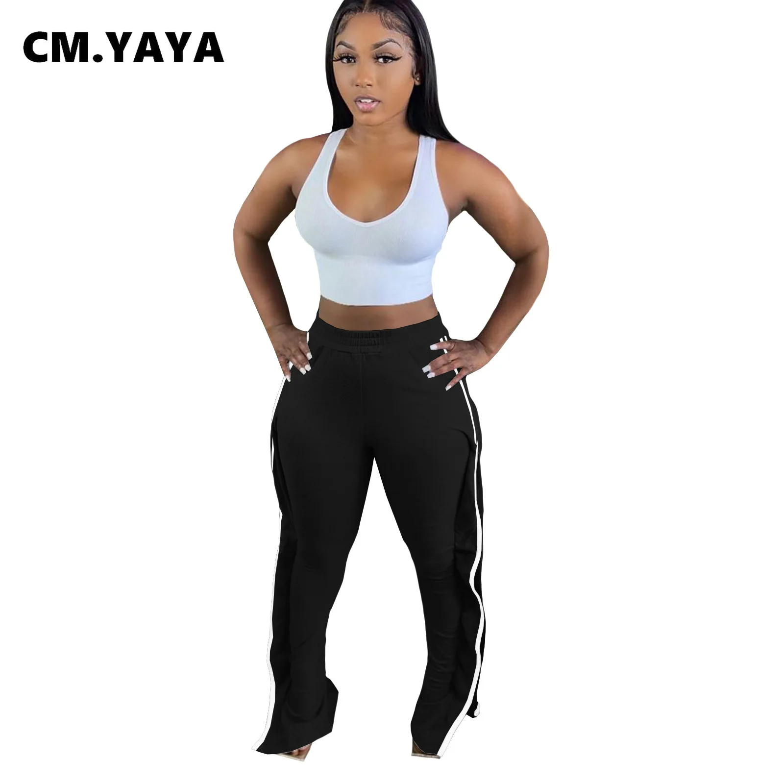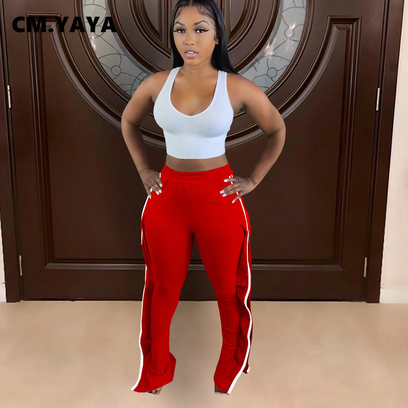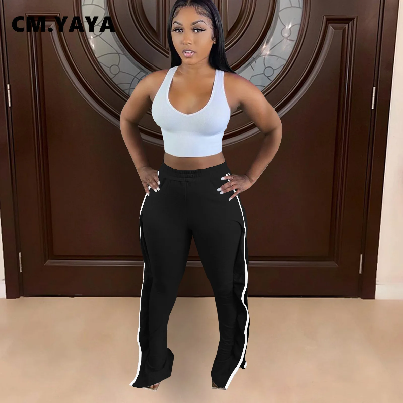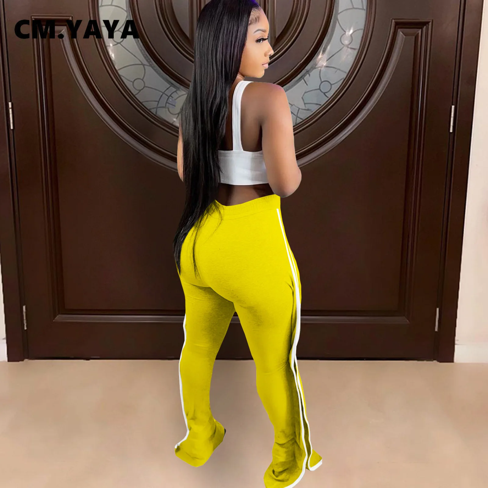 CM.YAYA Women Pant Elastic Mid Waist Patchwork Stretchy Skinny Bodycon Flare Pants Fashion Casual Trouser Summer 2021