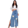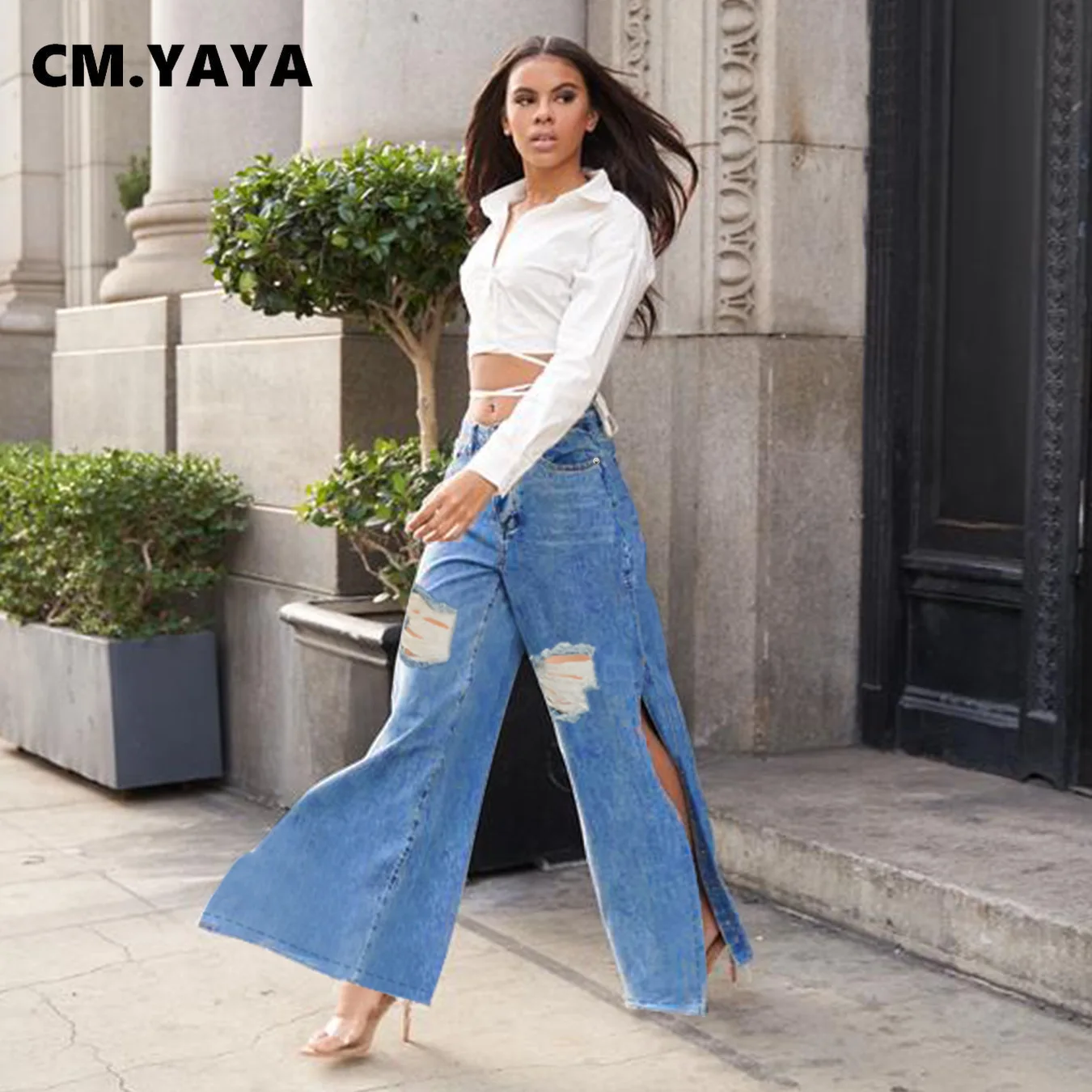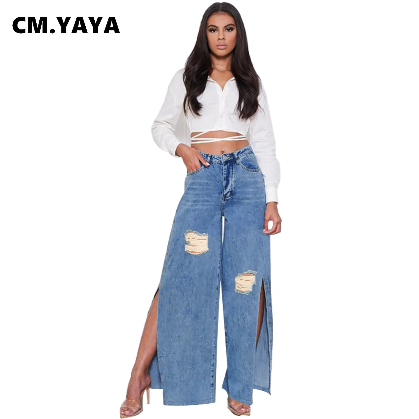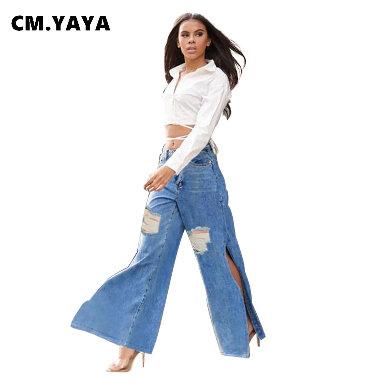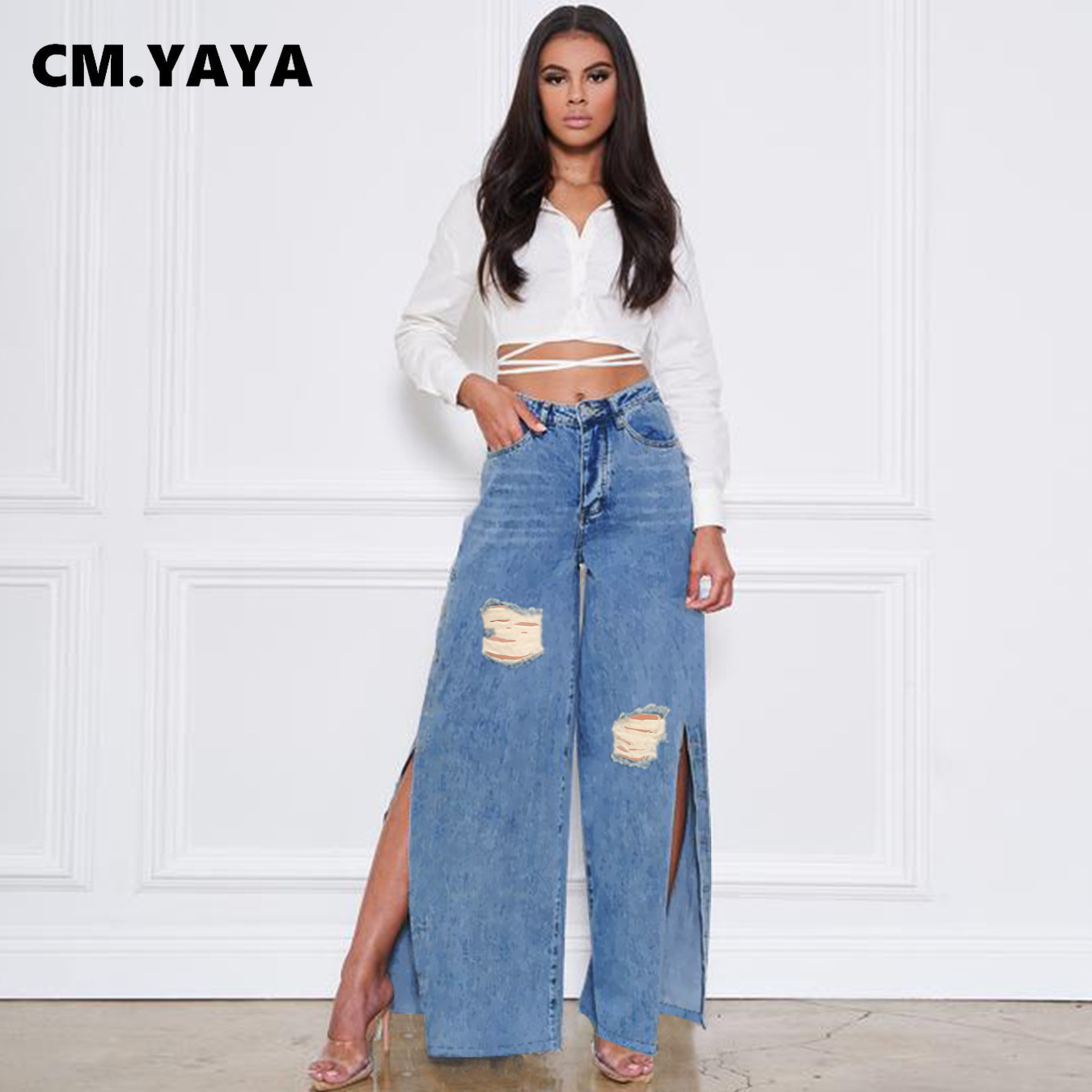 CM.YAYA Women Pants Solid High Waist Split Long Loose Jeans Denim Straight Hole Pants Fashion Trousers Streetwear Autumn 2021