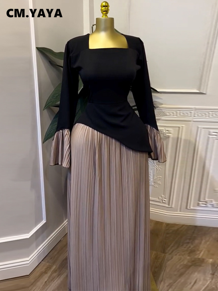 CM.YAYA Women Patchwork Flare Long Sleeve U-collar Pleated Big Swing Maxi Long Dress 2025 Birthday Sexy Club Party Even Dresses