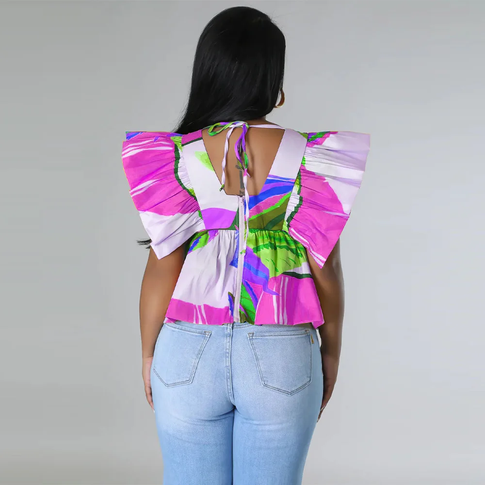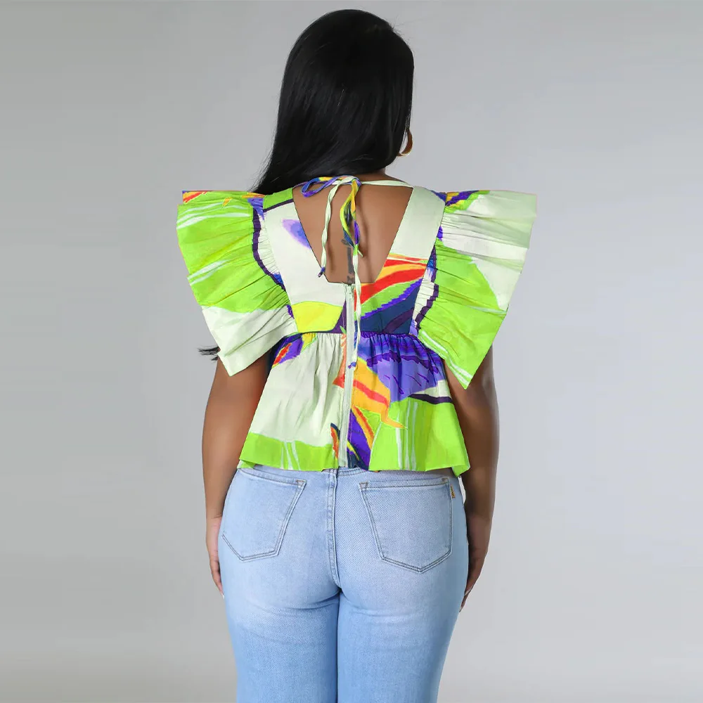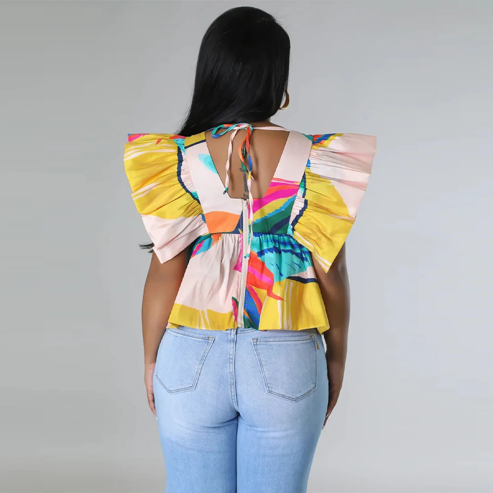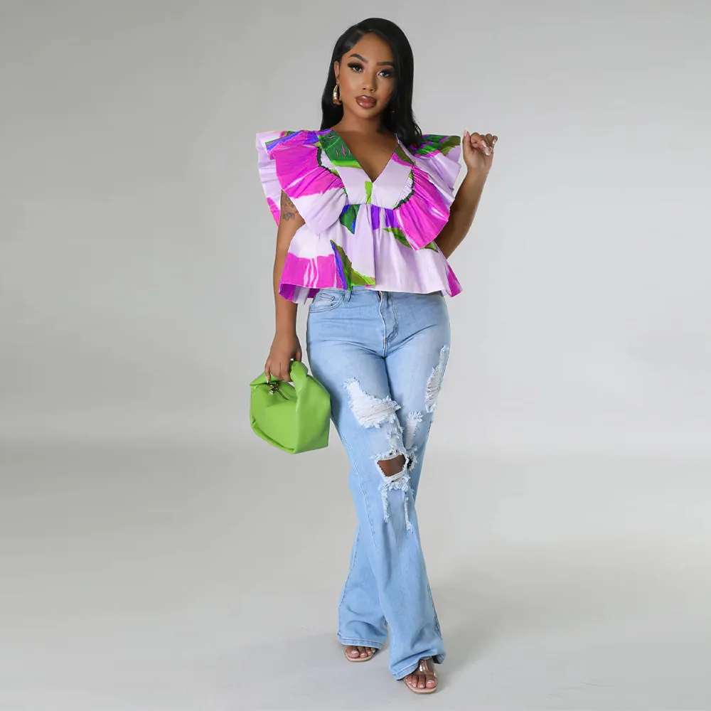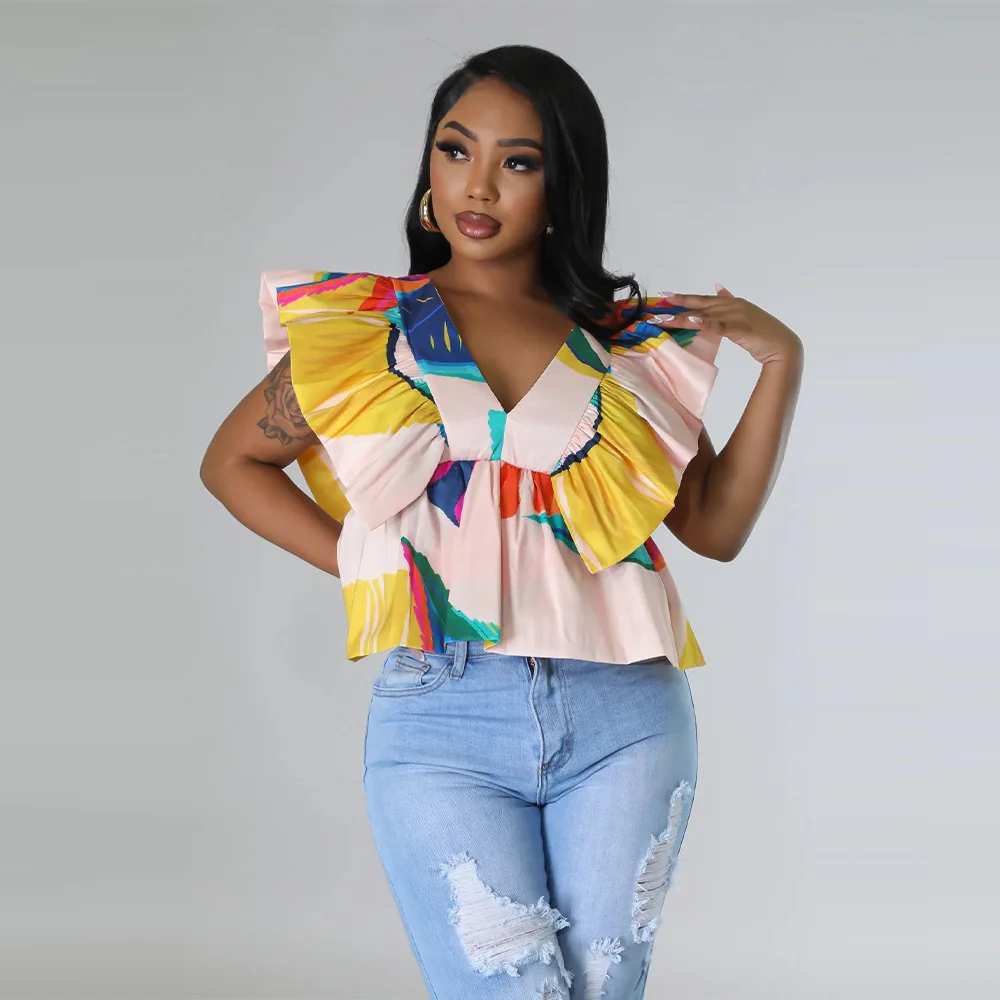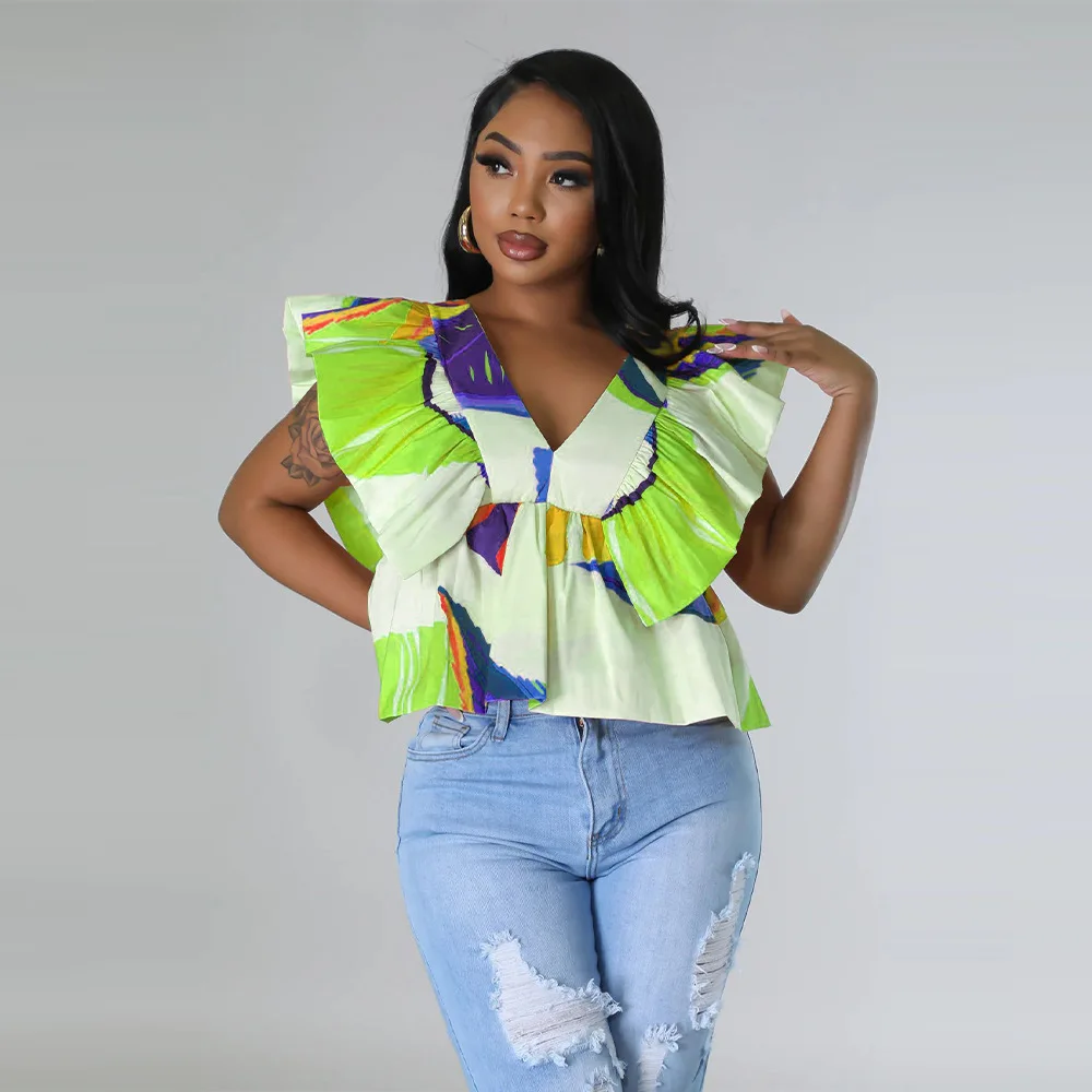 CM.YAYA Women Printed Ruffles Flare Short Sleeve V-neck Tunic Blouse and Shirt Top 2023 Summer New Chic Crop Tops