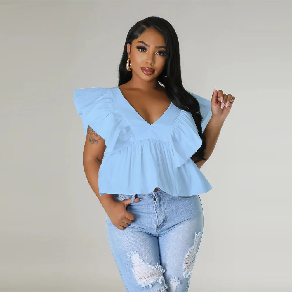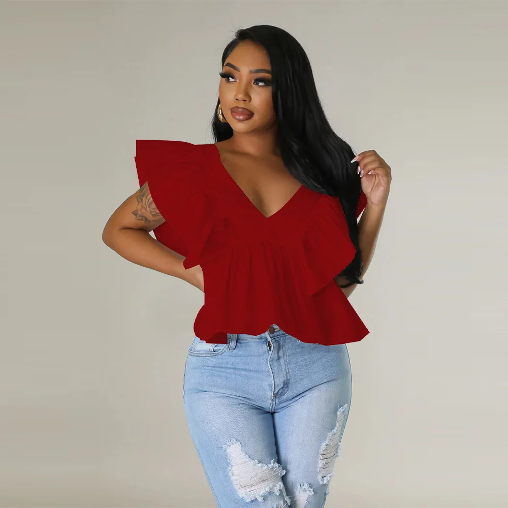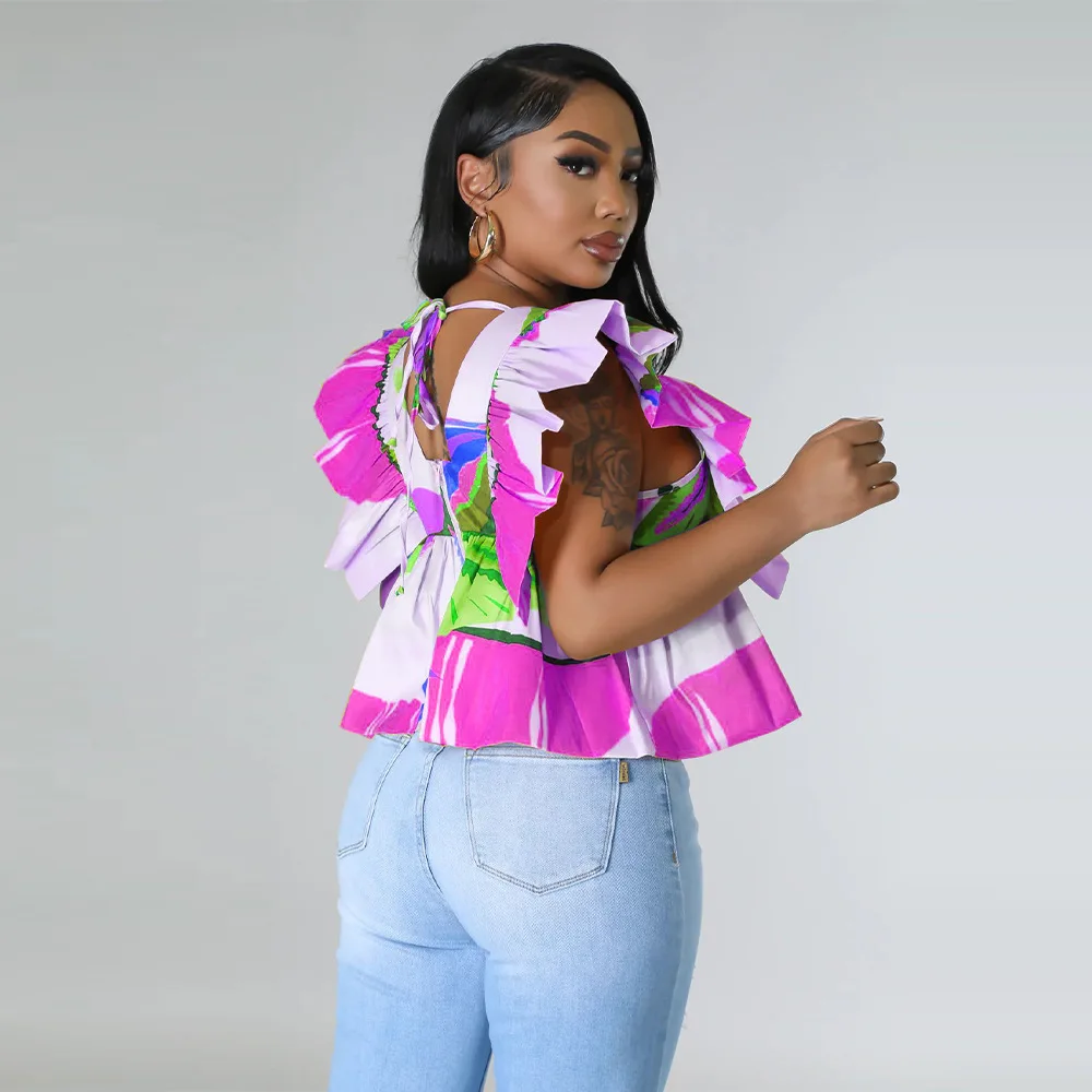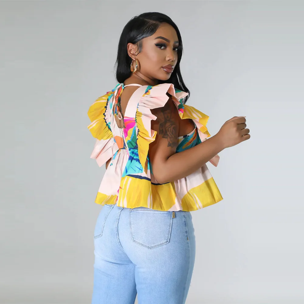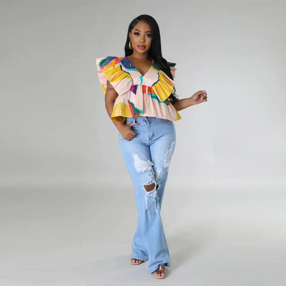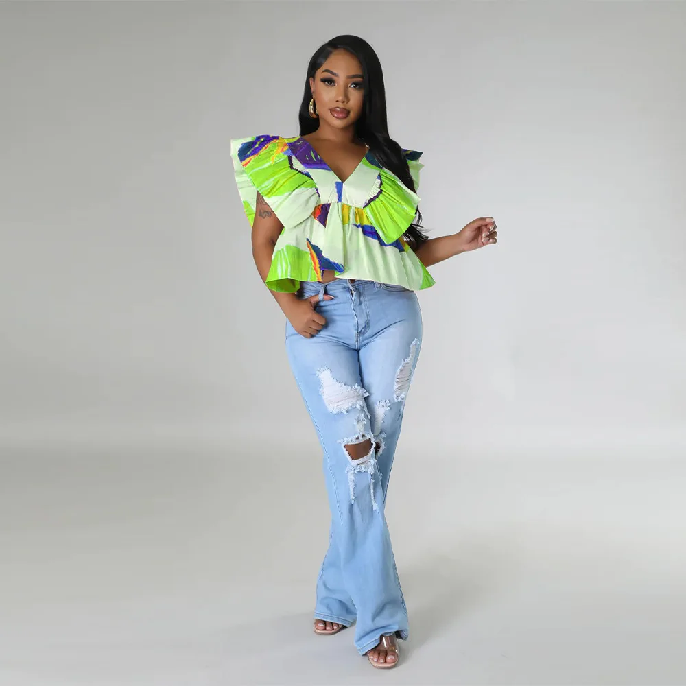 CM.YAYA Women Printed Ruffles Flare Short Sleeve V-neck Tunic Blouse and Shirt Top 2023 Summer New Chic Crop Tops