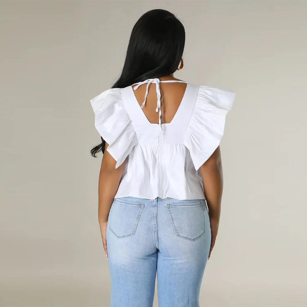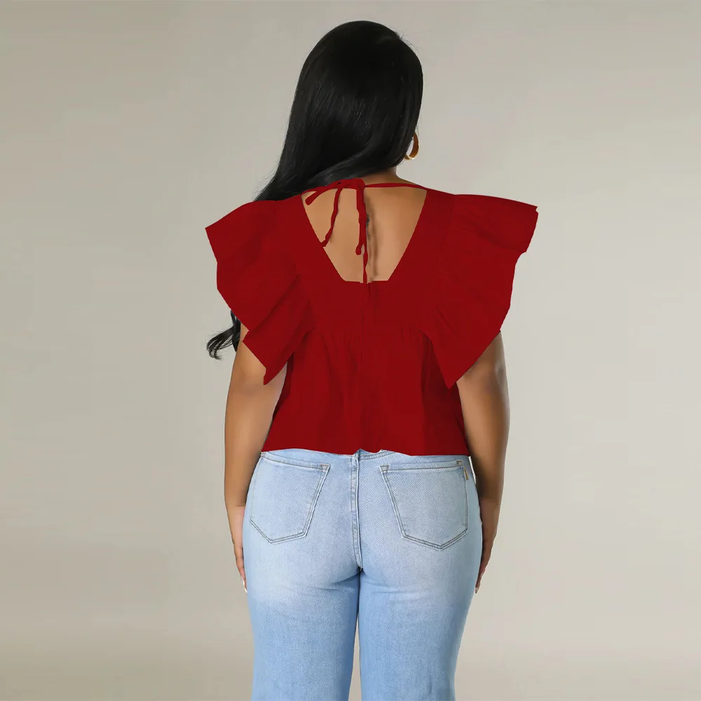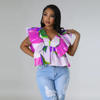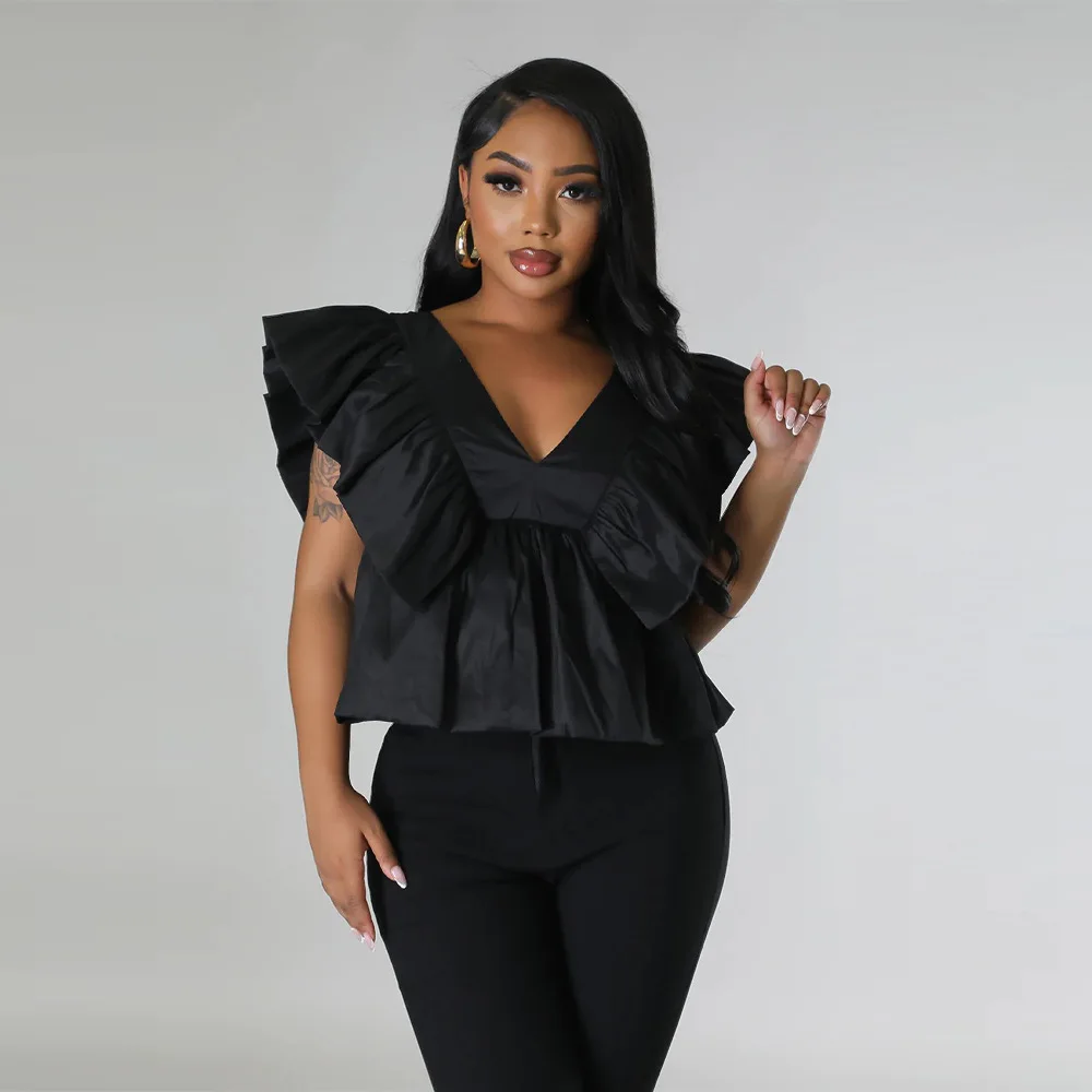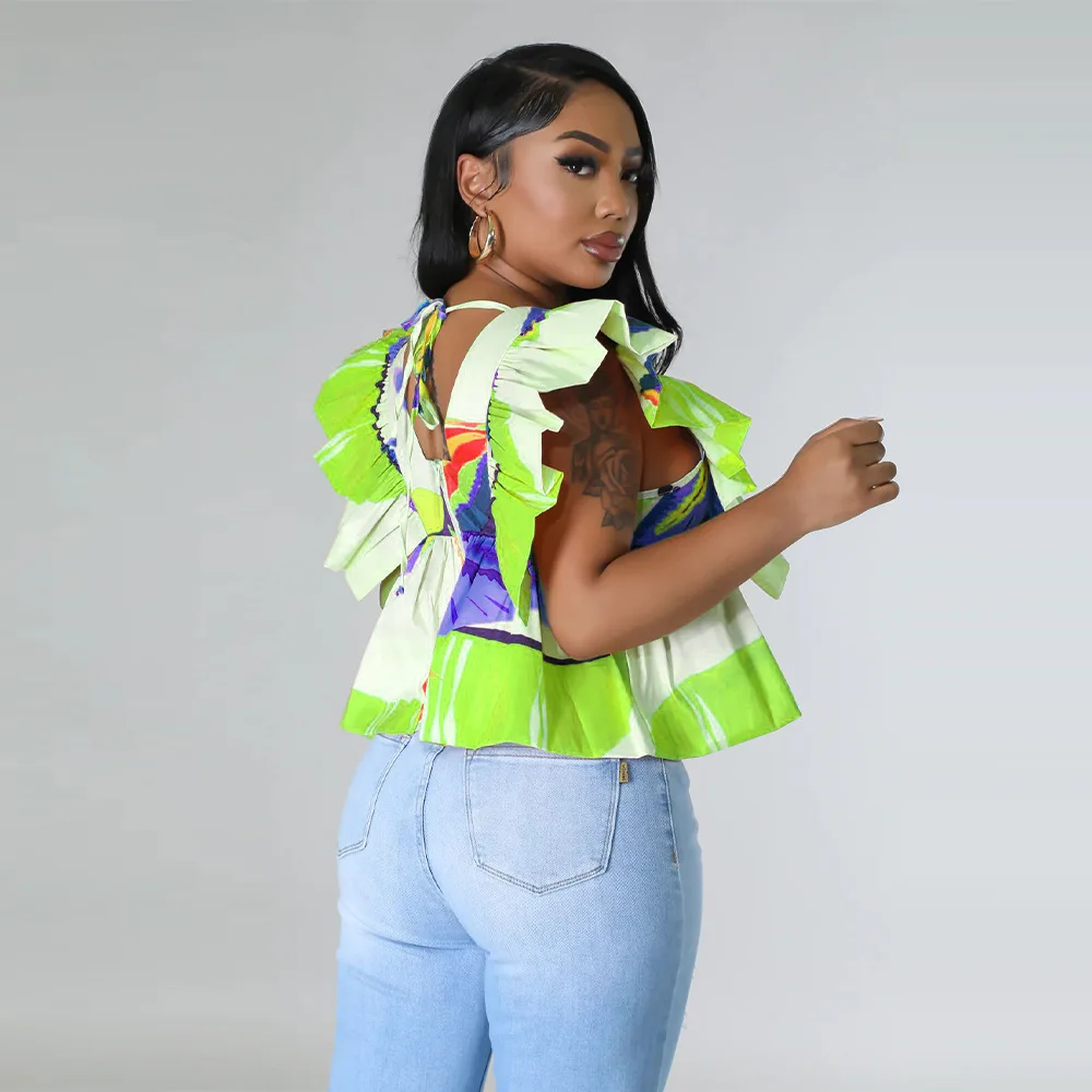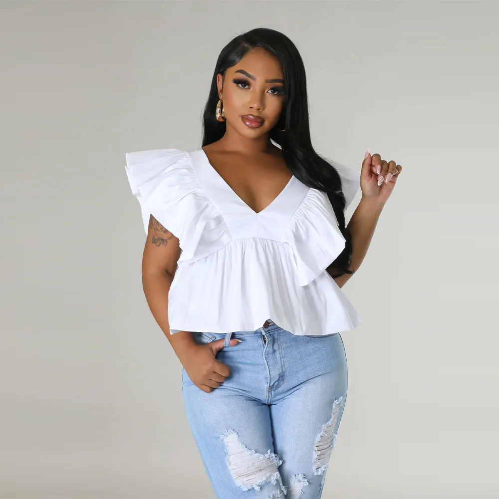 CM.YAYA Women Printed Ruffles Flare Short Sleeve V-neck Tunic Blouse and Shirt Top 2023 Summer New Chic Crop Tops