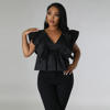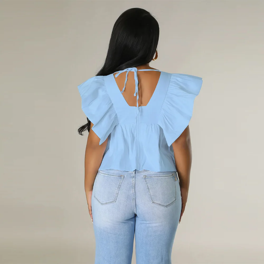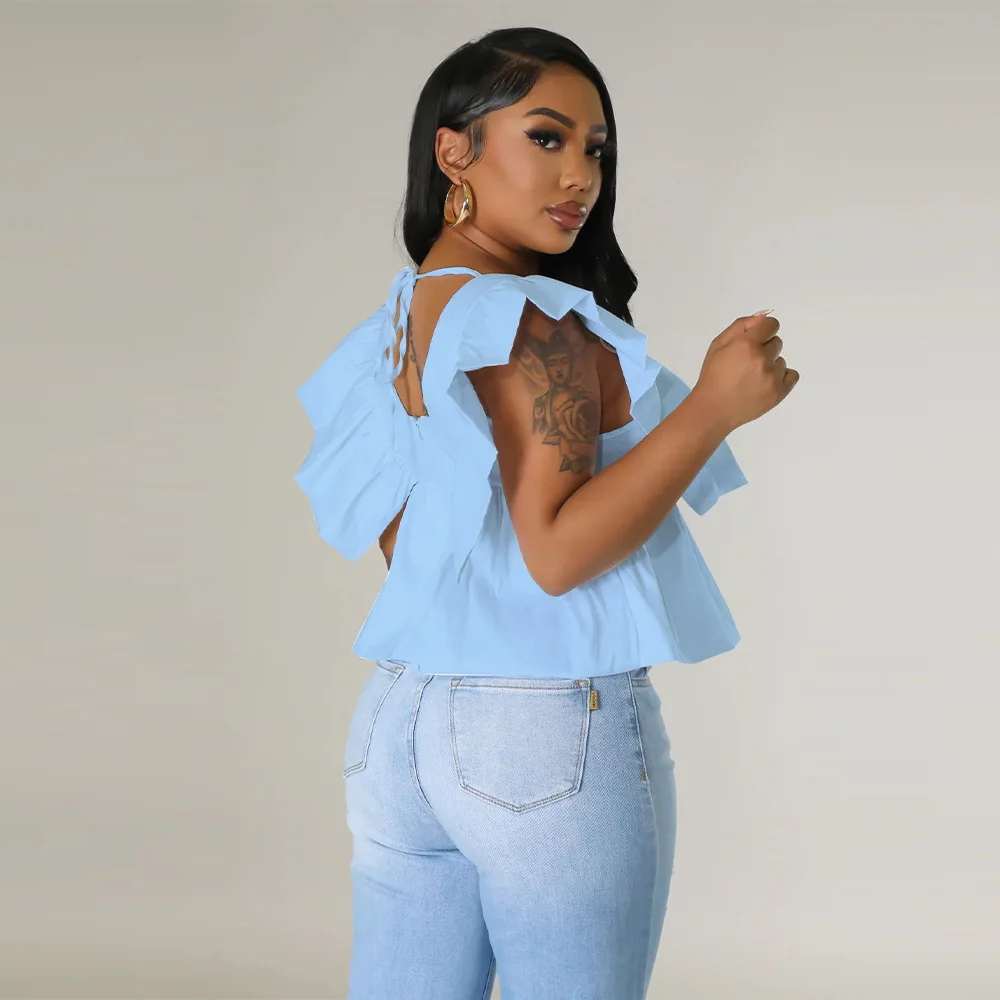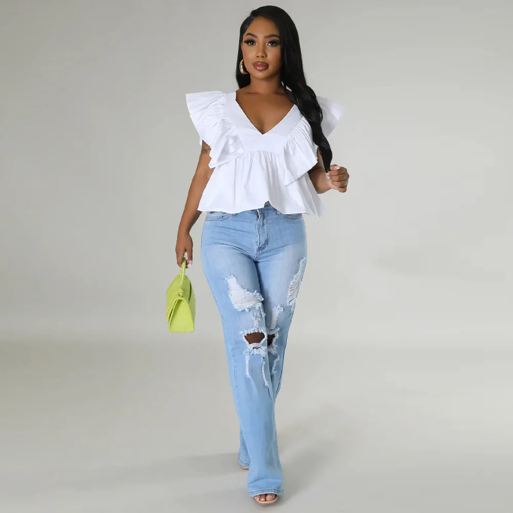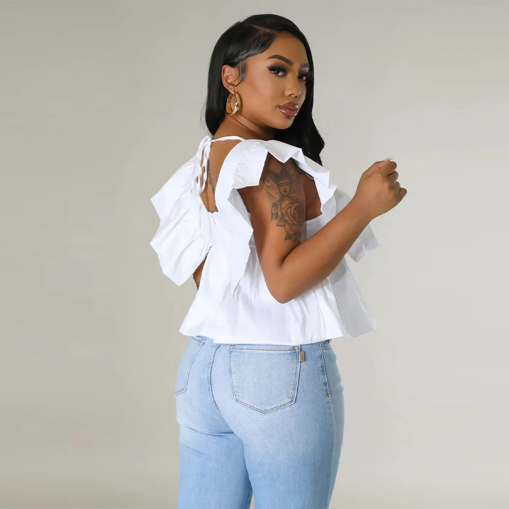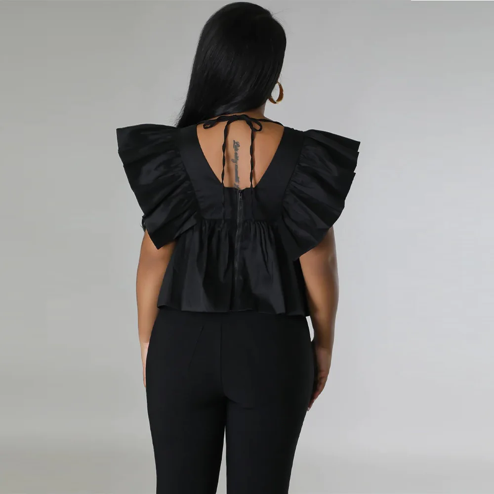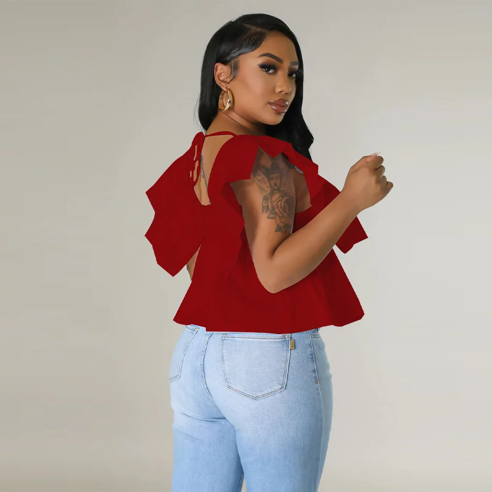 CM.YAYA Women Printed Ruffles Flare Short Sleeve V-neck Tunic Blouse and Shirt Top 2023 Summer New Chic Crop Tops