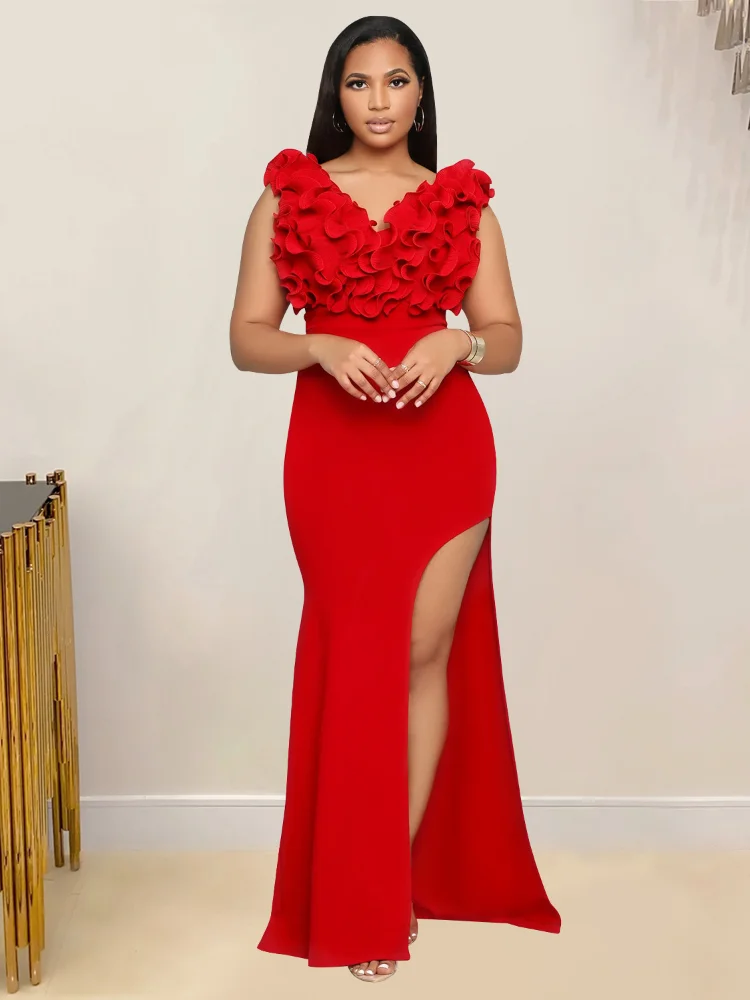 CM.YAYA Women Ruffles V-neck High Split Sleeveless Bodycon Long Maxi Dress 2024 Evening Street Vestidos Prom Sexy Party Dresses