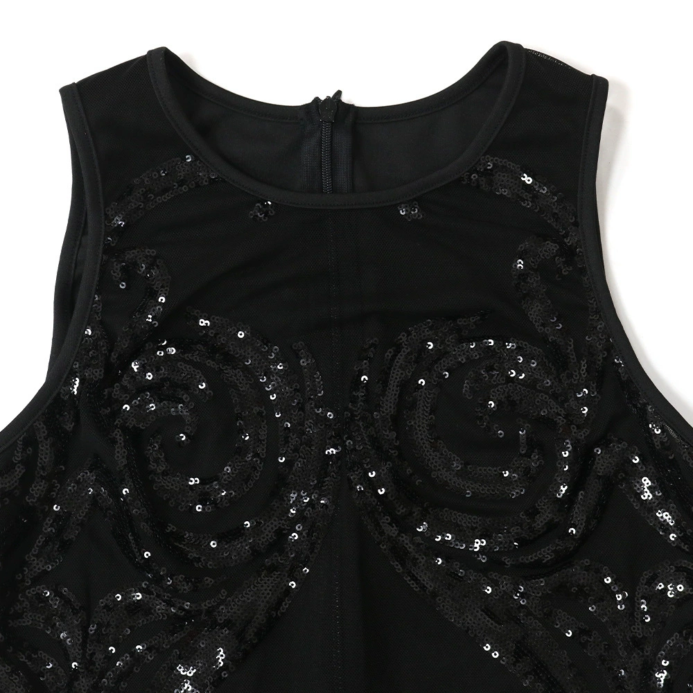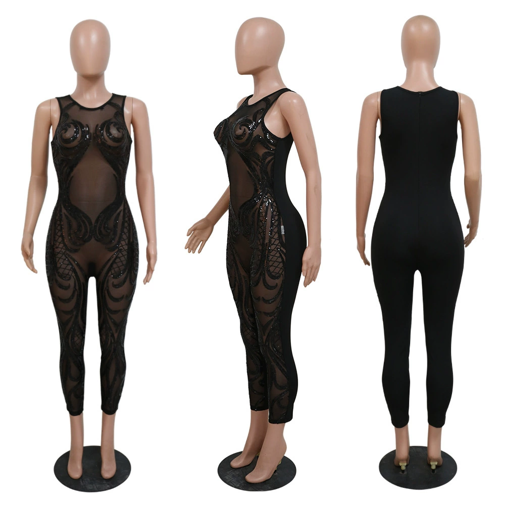 CM.YAYA Women Sequined Paisley Mesh Patchwork Sleeveless Jumpsuit 2023 Summer Sexy Party Club Evening One Piece Set Playsuit