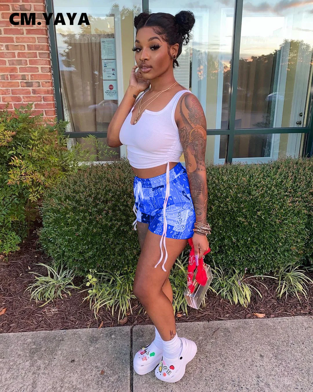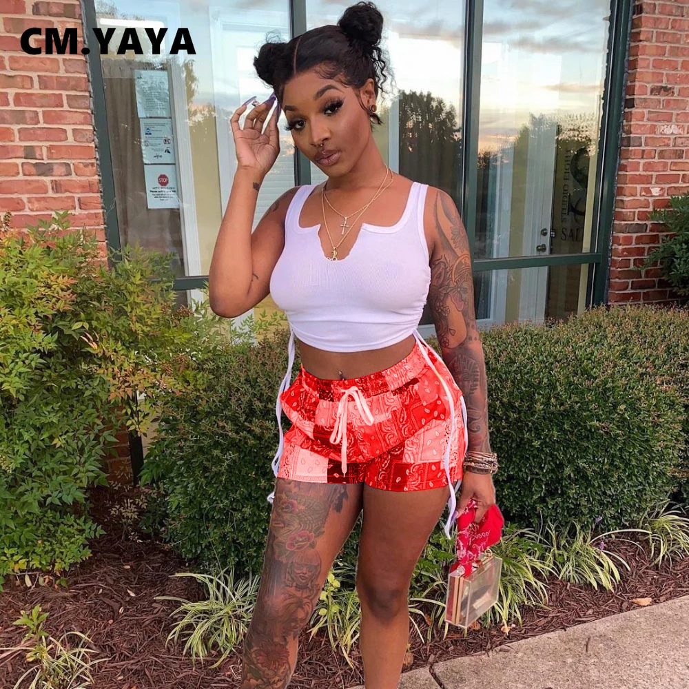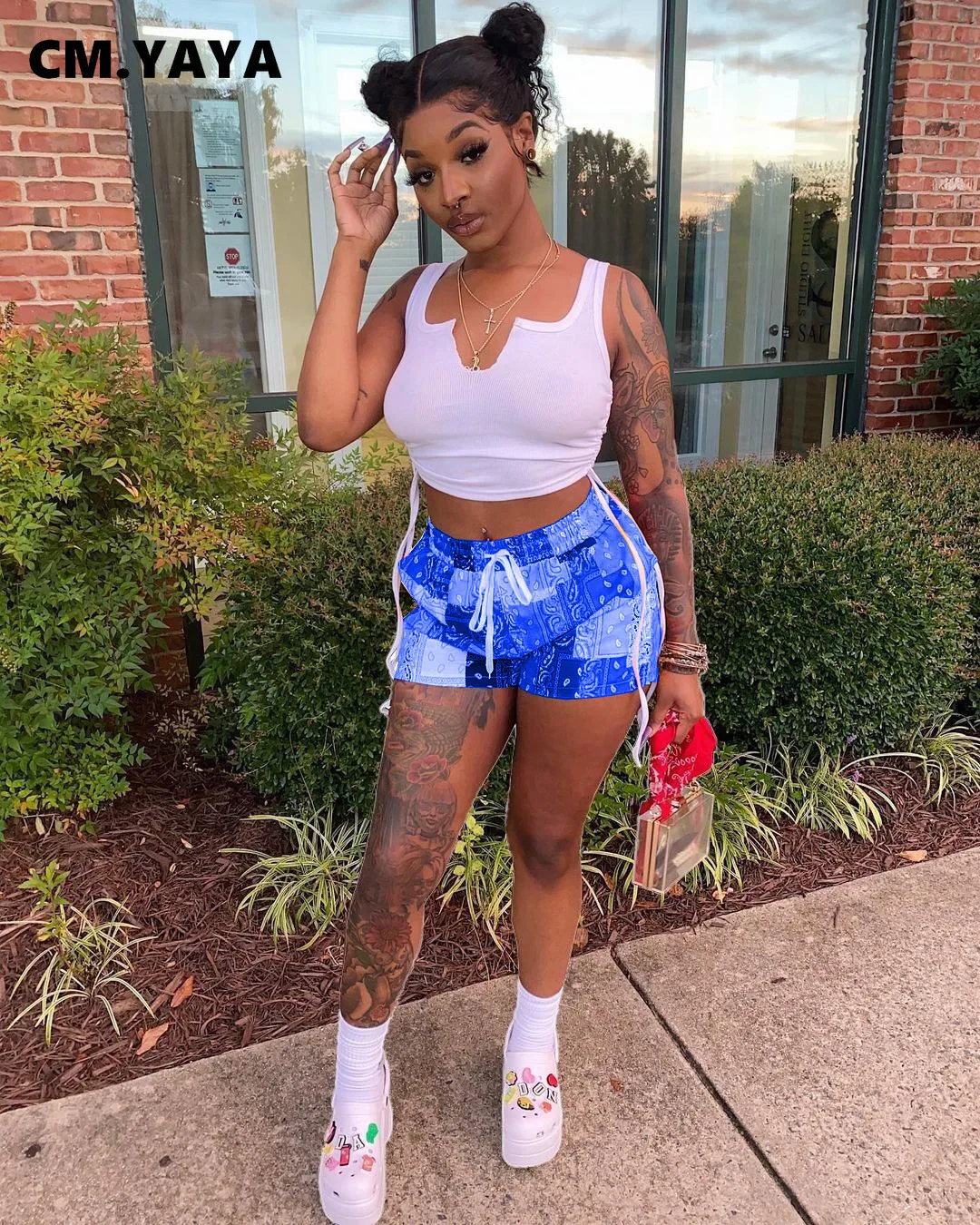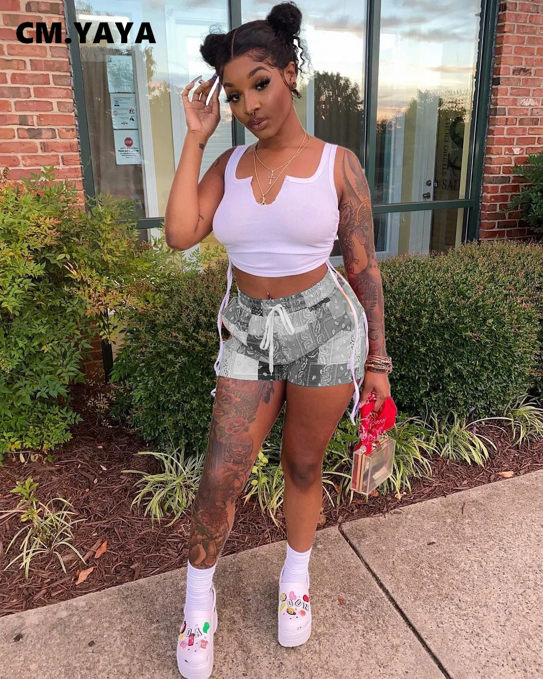 CM.YAYA Women Set Elastic Summer Tanks Drawstring Print Shorts Suits 2 Piece Set Female Casual High Street Wear Tracksuits
