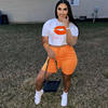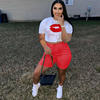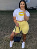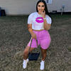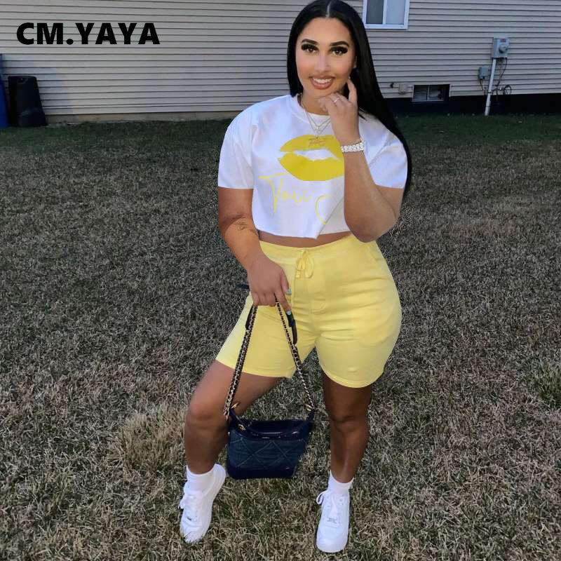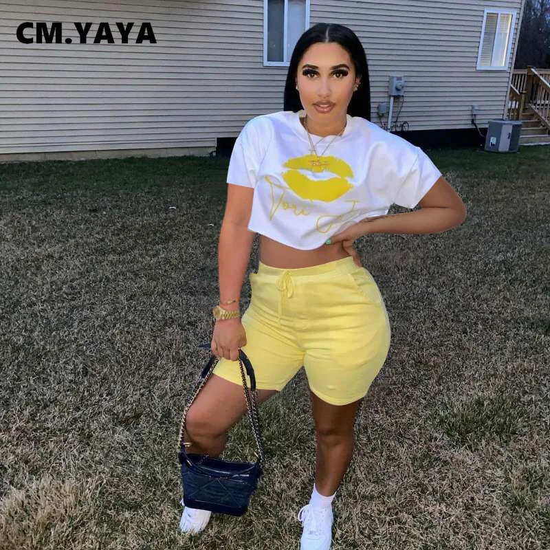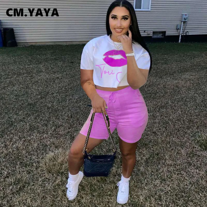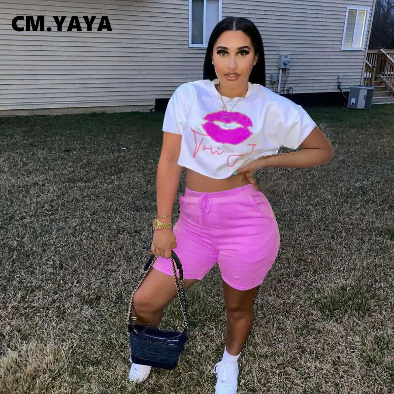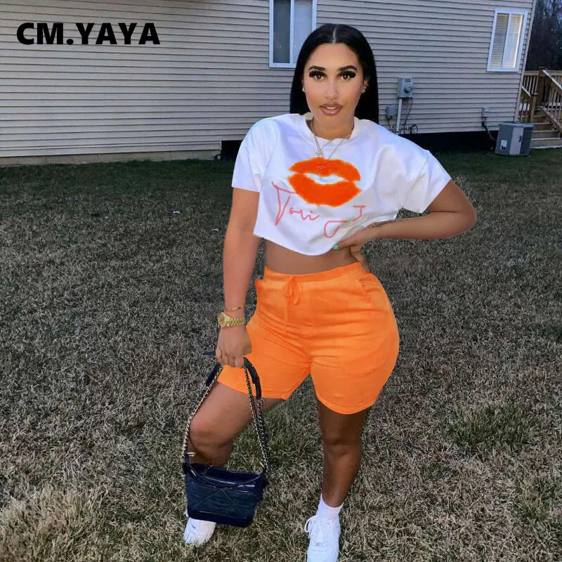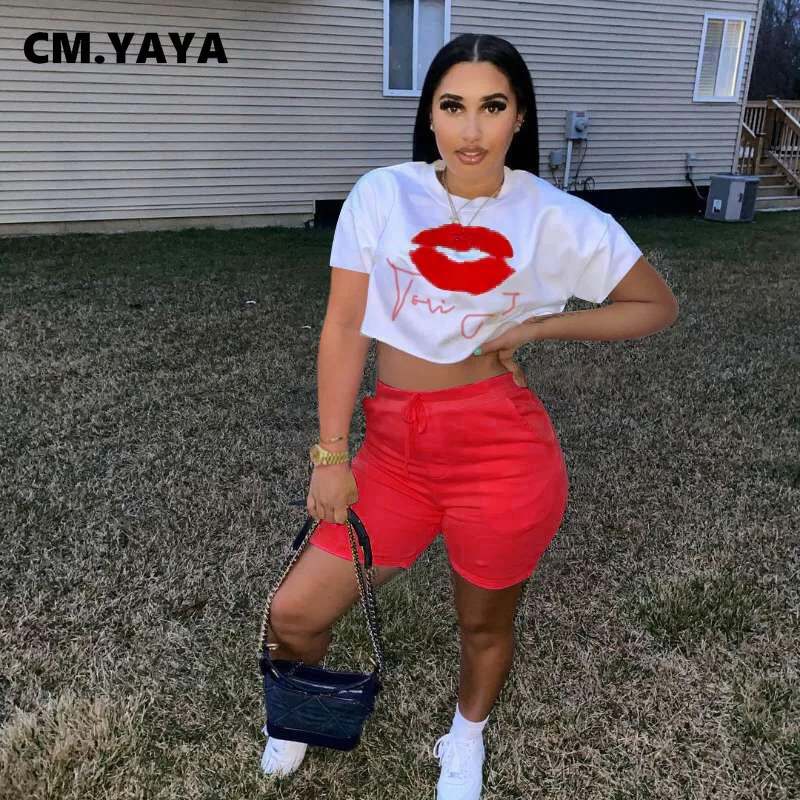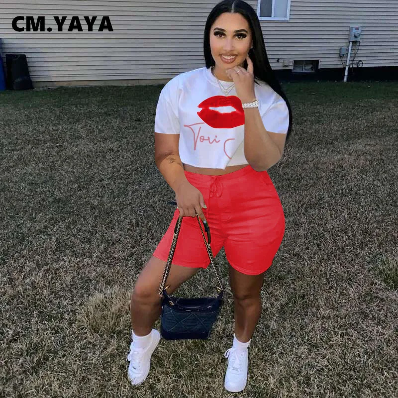CM.YAYA Women Set Lip Print Short Sleeve Loose Crop Tops Drawstring Waist Elastic Shorts Pockets 2 Piece Set Tracksuit Outfits