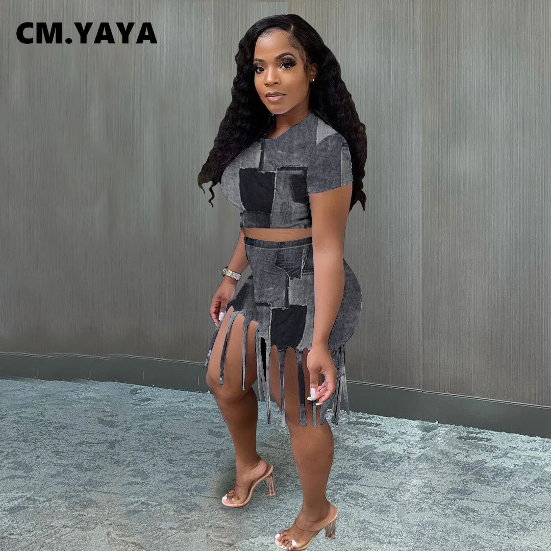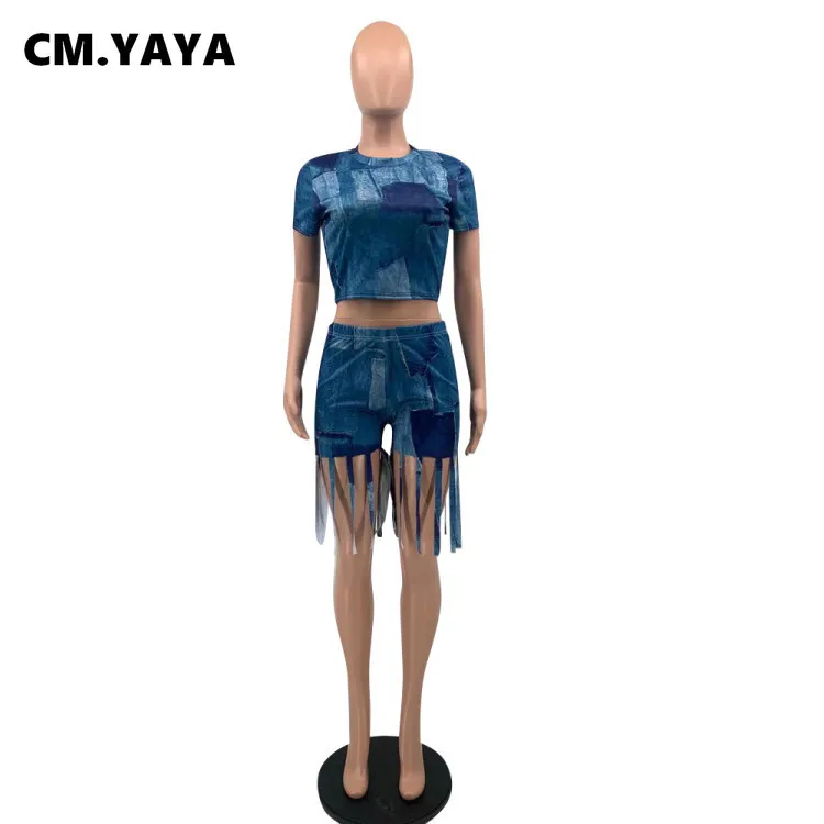 CM.YAYA Women Set Print Short Sleeve O-neck Crop Tops Skinny Tassel Shorts Two 2 Piece Sets Fashion Outfit Summer Tracksuit 2021