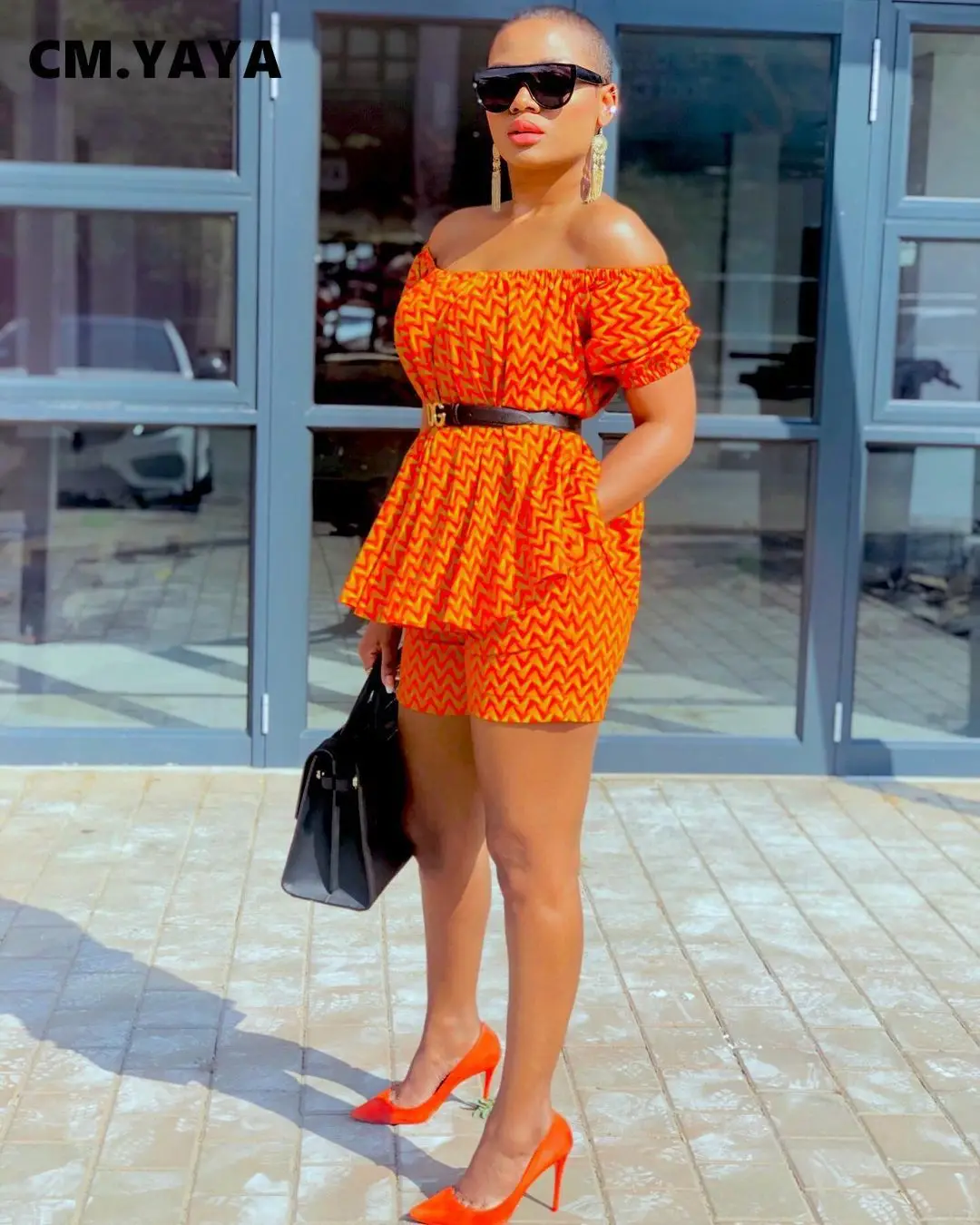 CM.YAYA Women Set Print Short Sleeve Slash Neck Loose Top Stretchy Shorts Two 2 Piece Set Tracksuit Summer Outfit Without Sashes