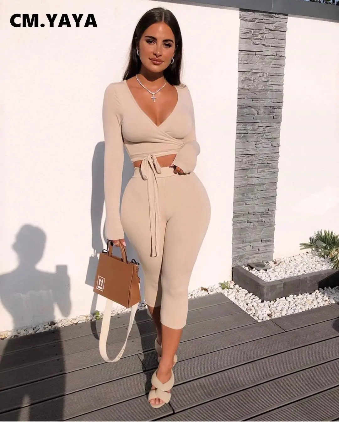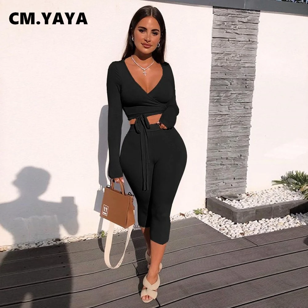 CM.YAYA Women Set Solid Full Sleeve V-neck Bandage Crop Top Mid Waist Skinny Elastic Calf Length Pants 2 Piece Set Summer Outfit