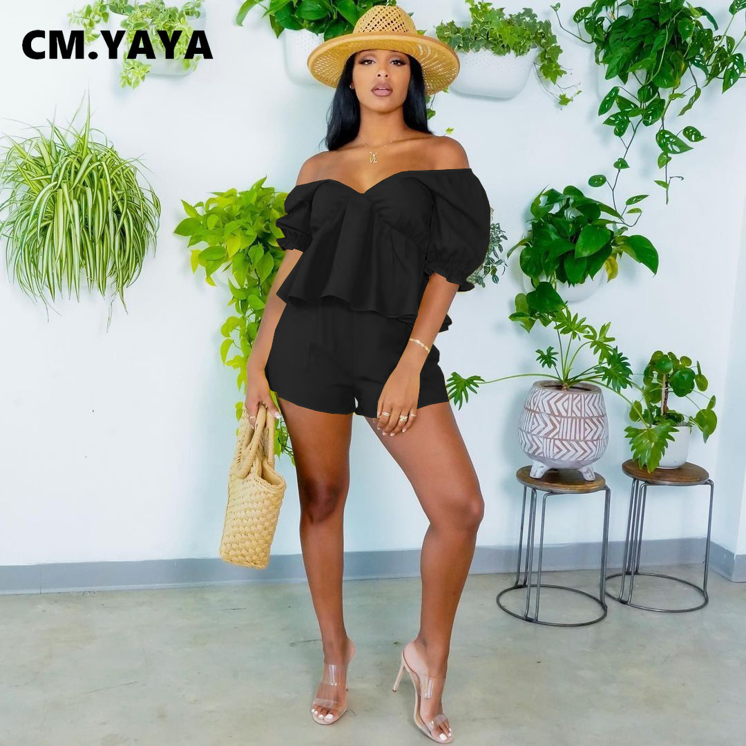 CM.YAYA Women Set Solid Off Shoulder Short Sleeve Ruffles Tops Straight Shorts Two 2 Piece Set Active Tracksuit Fashion Outfits