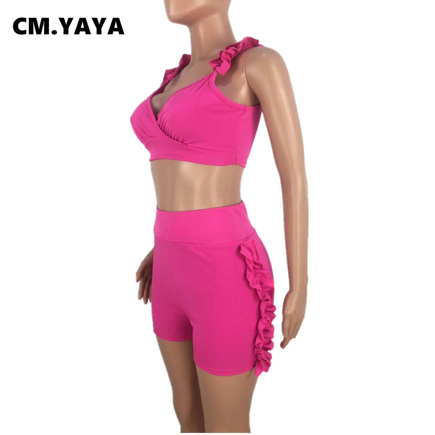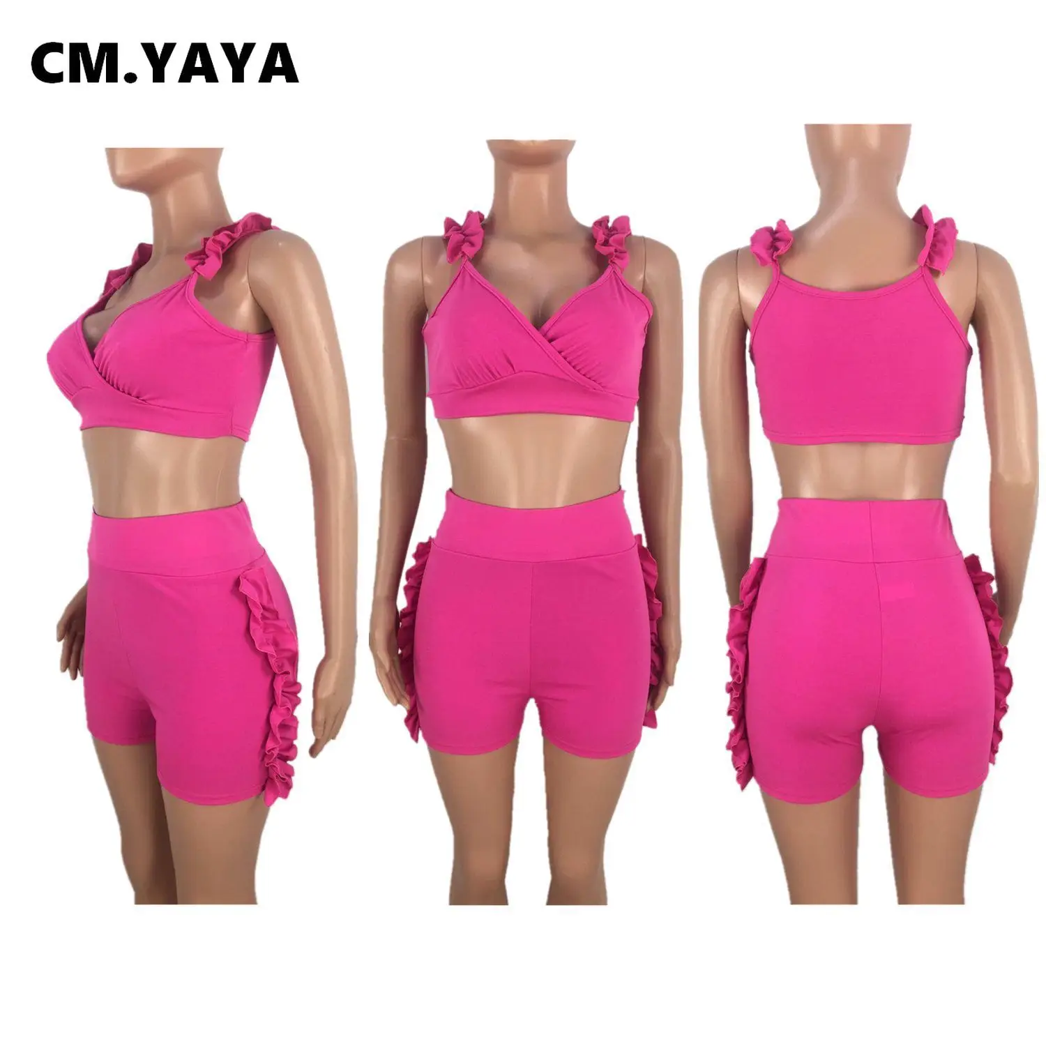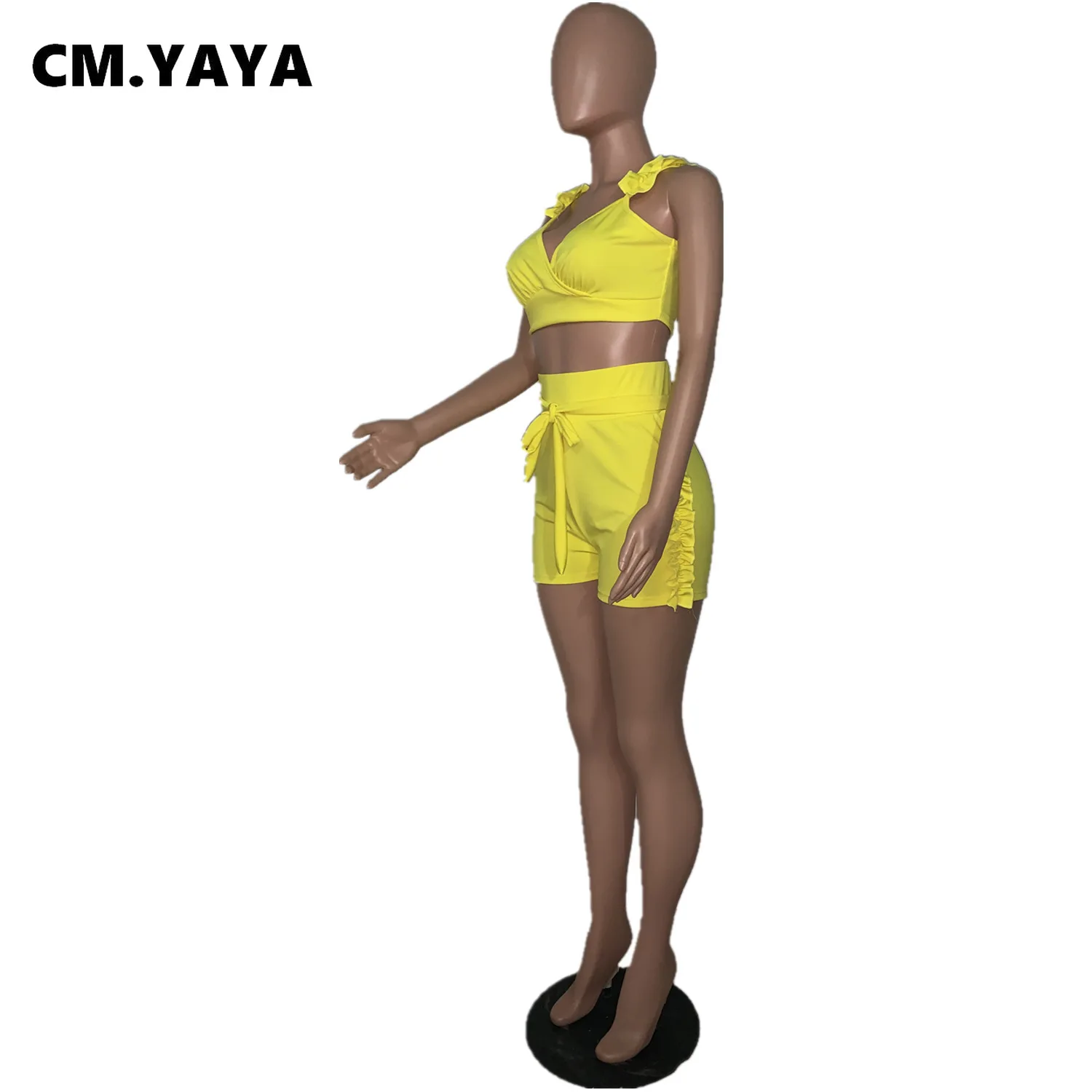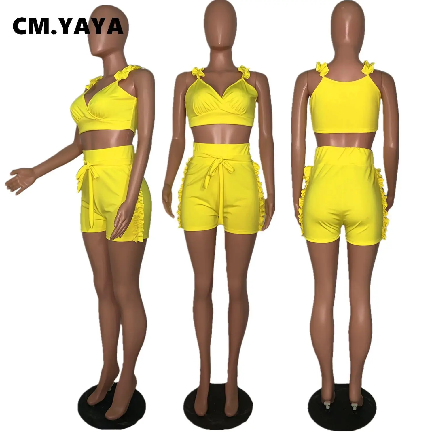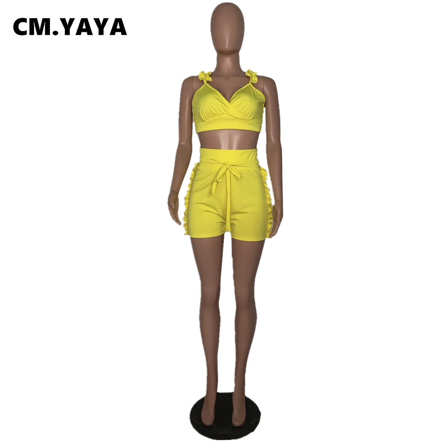 CM.YAYA Women Set Solid Petal Sleeve V-neck Crop Tops Bowknot High Waist Elastic Shorts 2 Piece Set Fashion Outfit Tracksuit
