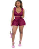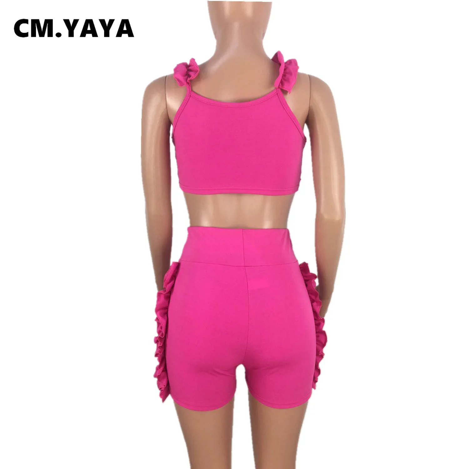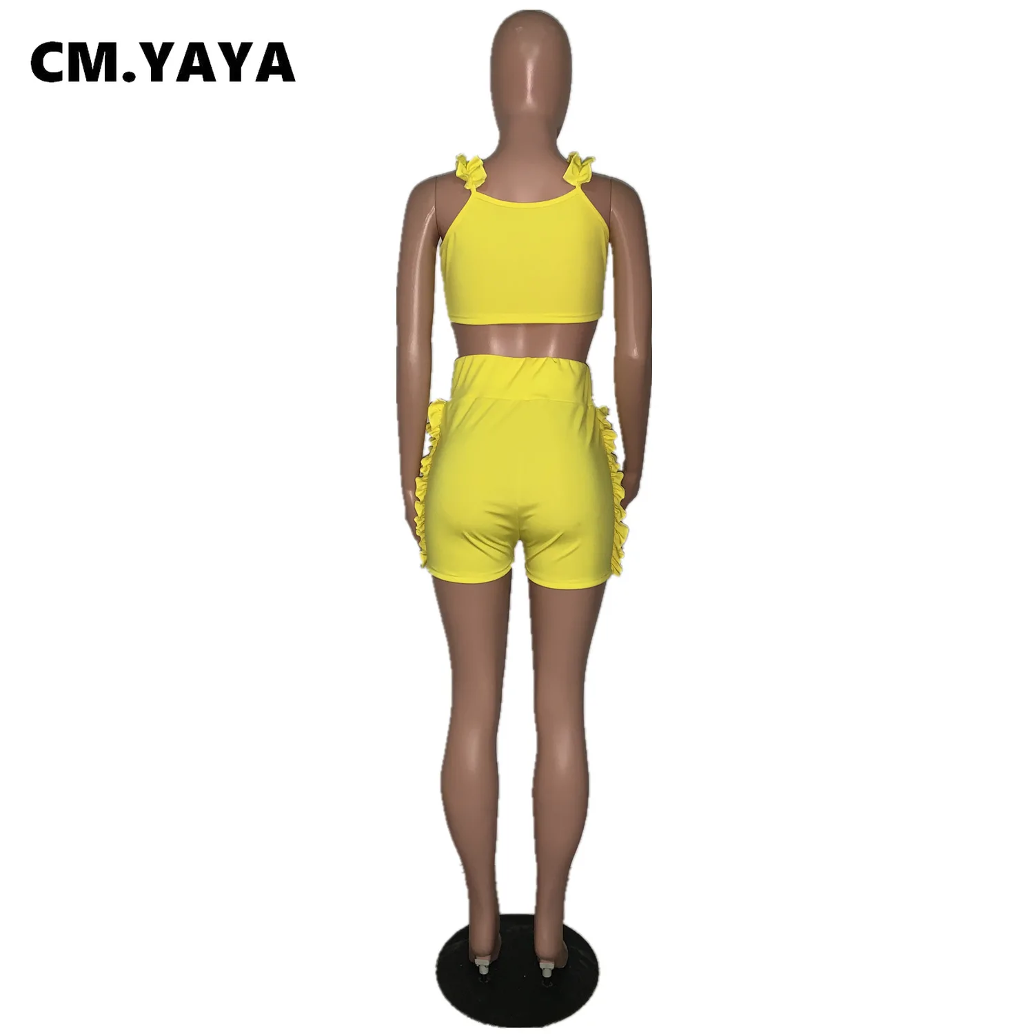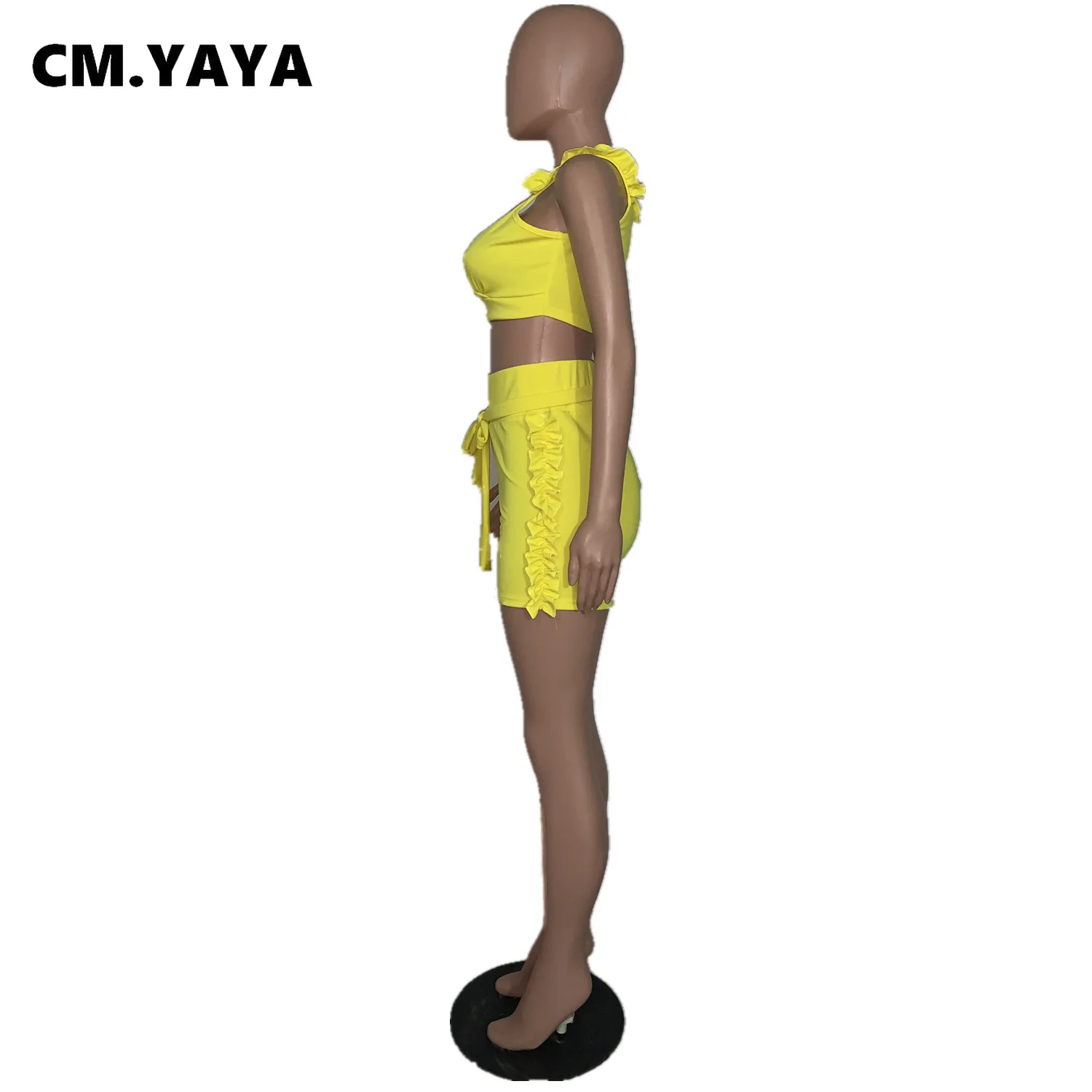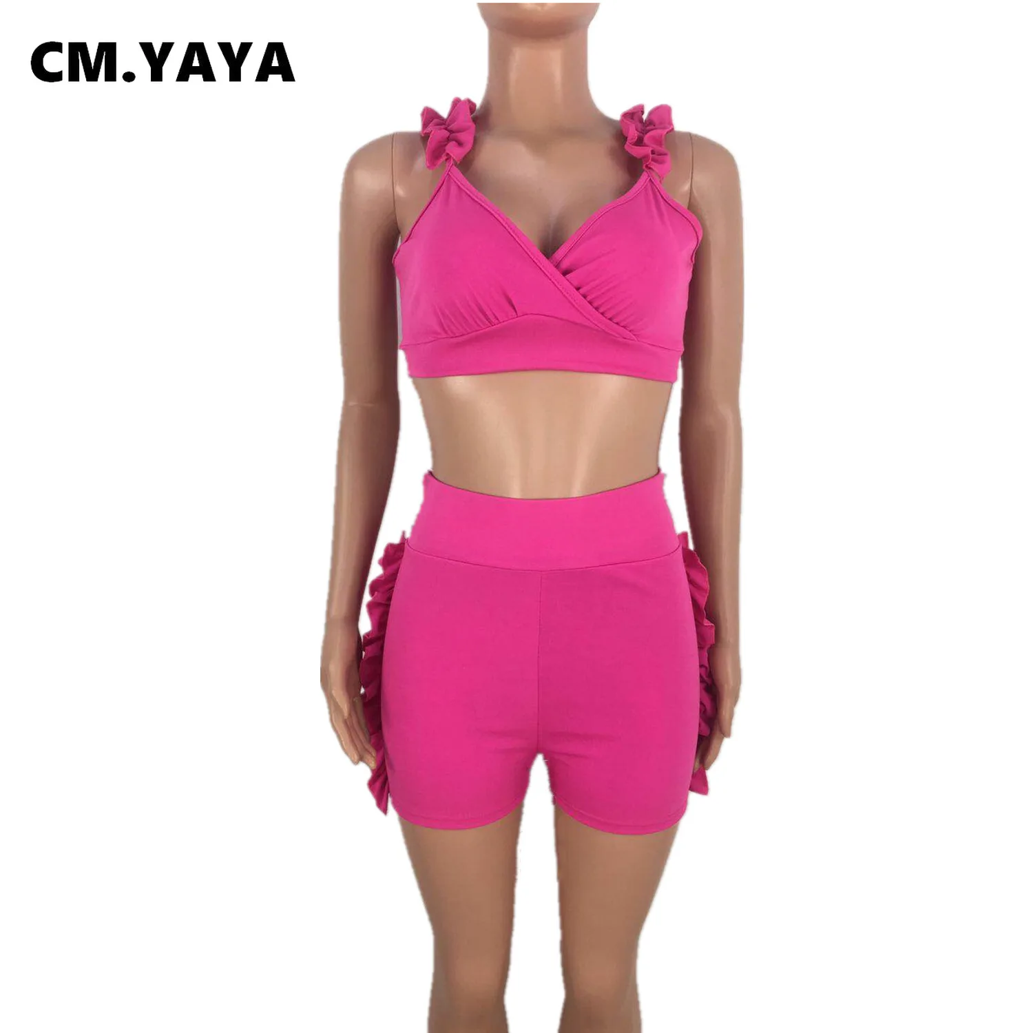 CM.YAYA Women Set Solid Petal Sleeve V-neck Crop Tops Bowknot High Waist Elastic Shorts 2 Piece Set Fashion Outfit Tracksuit