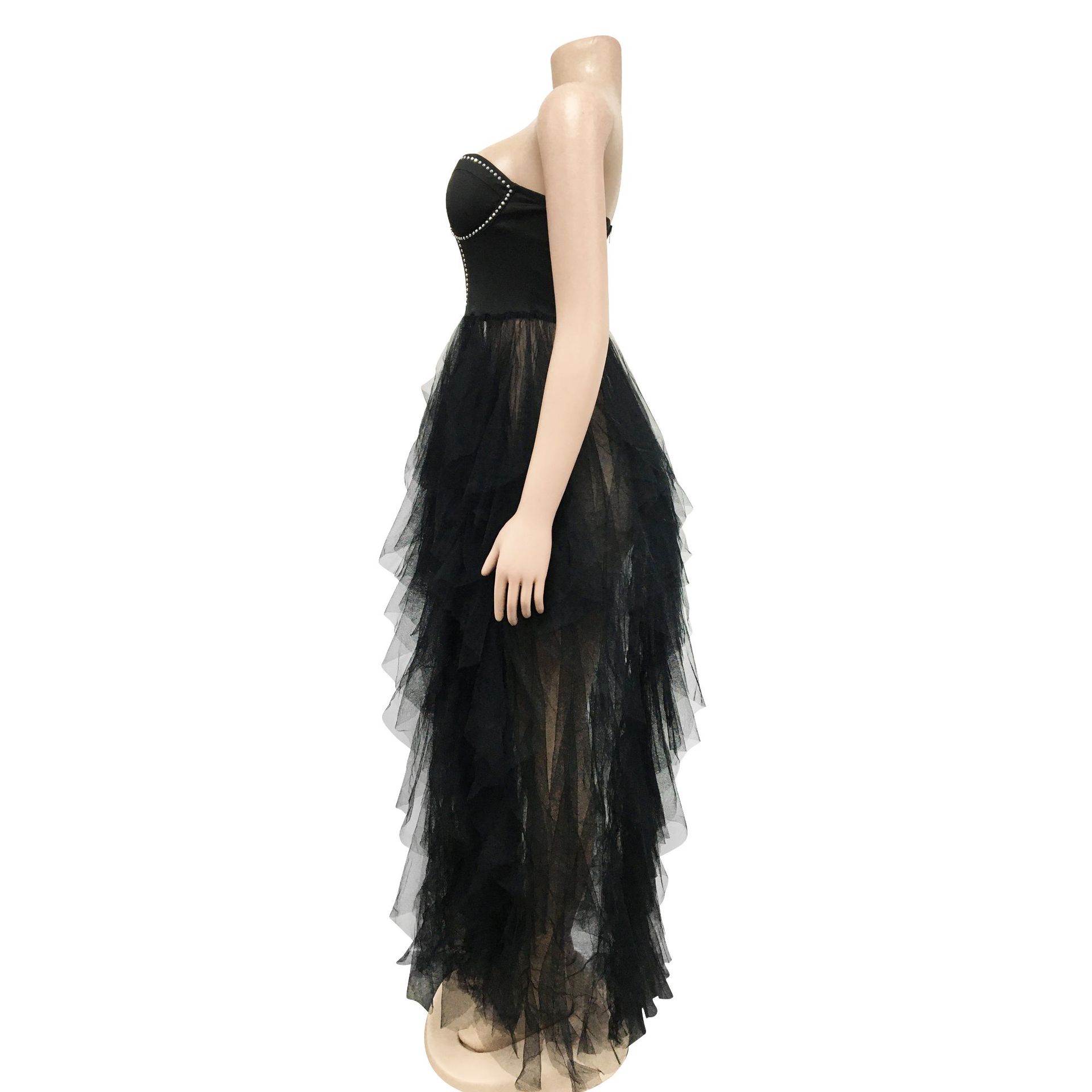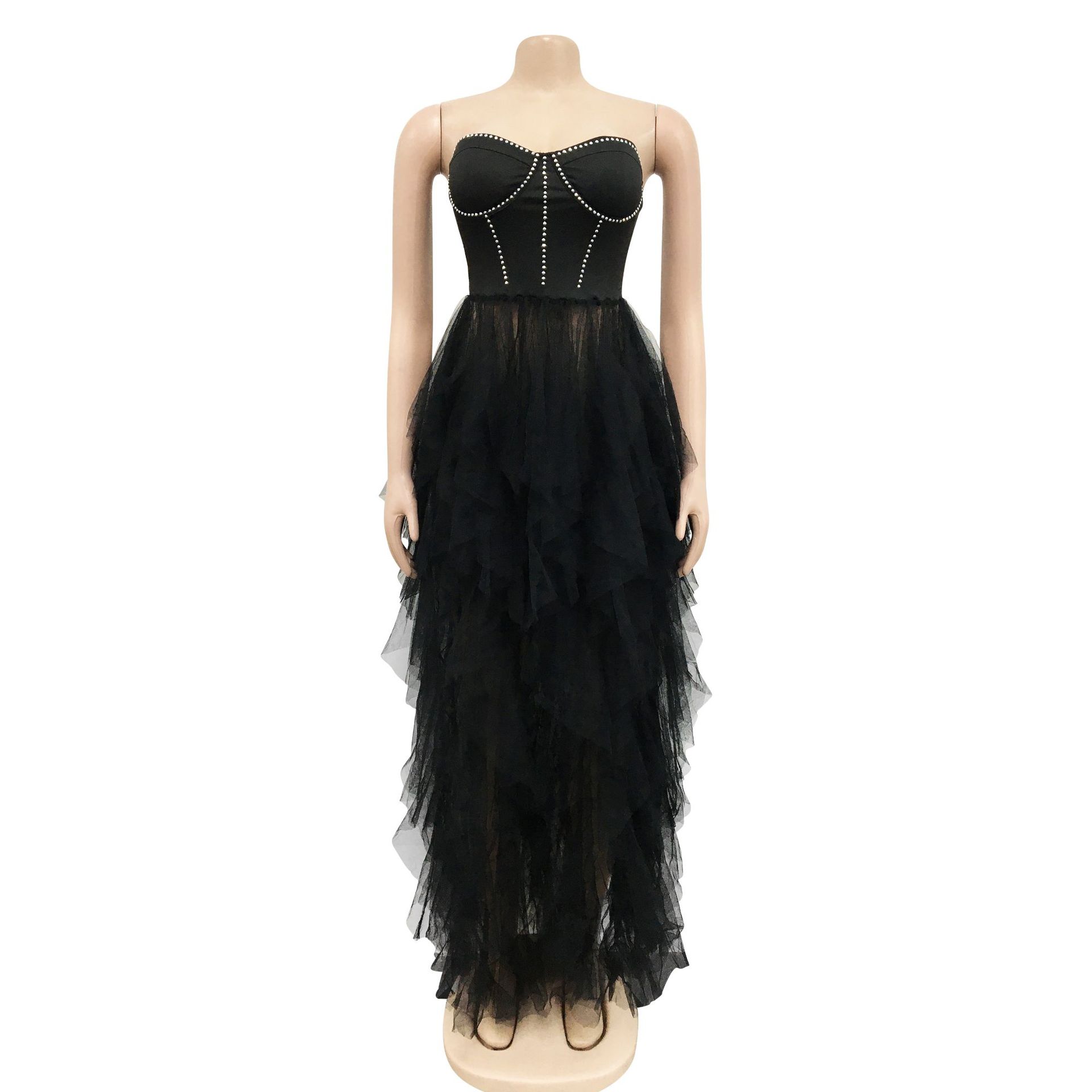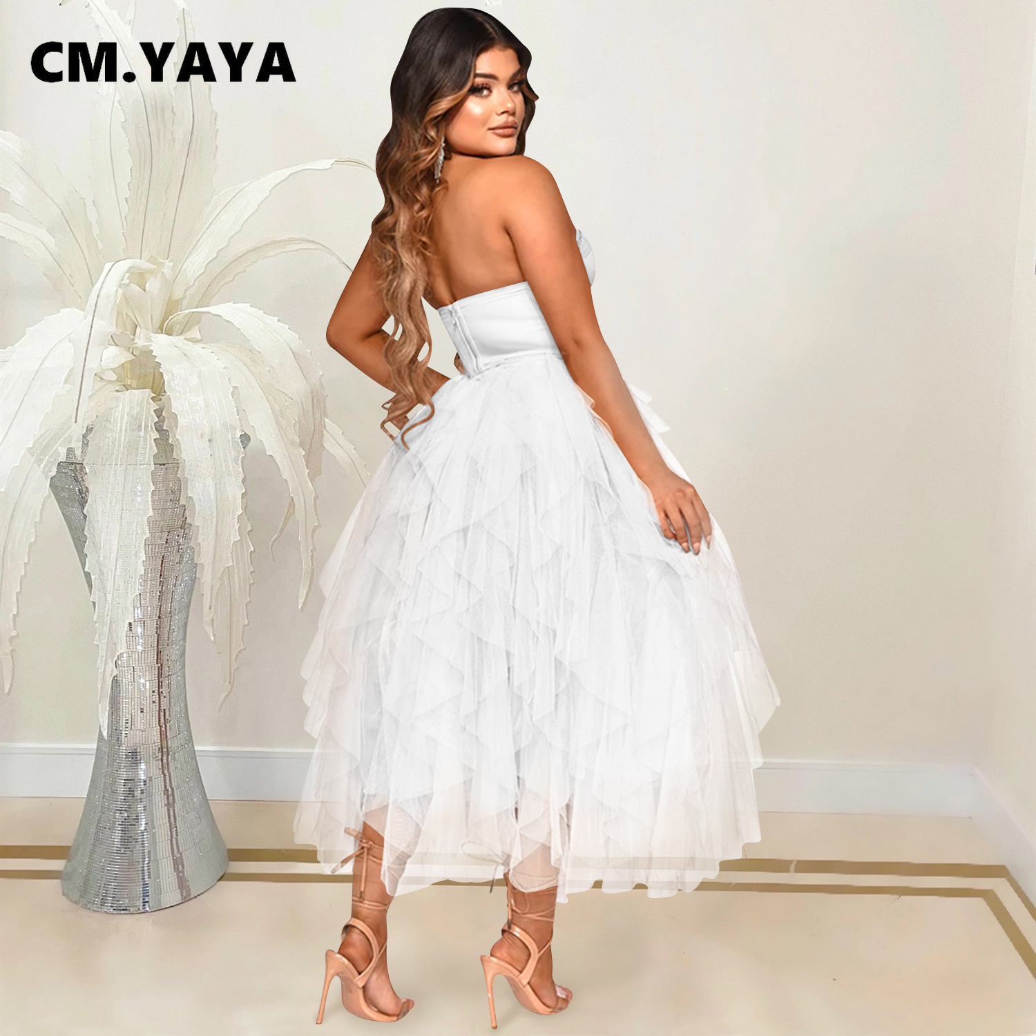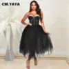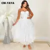 CM.YAYA Women Sexy Party Maxi Dresses 2022 Diamonds Hot Rhinestones Strapless Big Swing Mesh Cascading Ruffles Long Dress