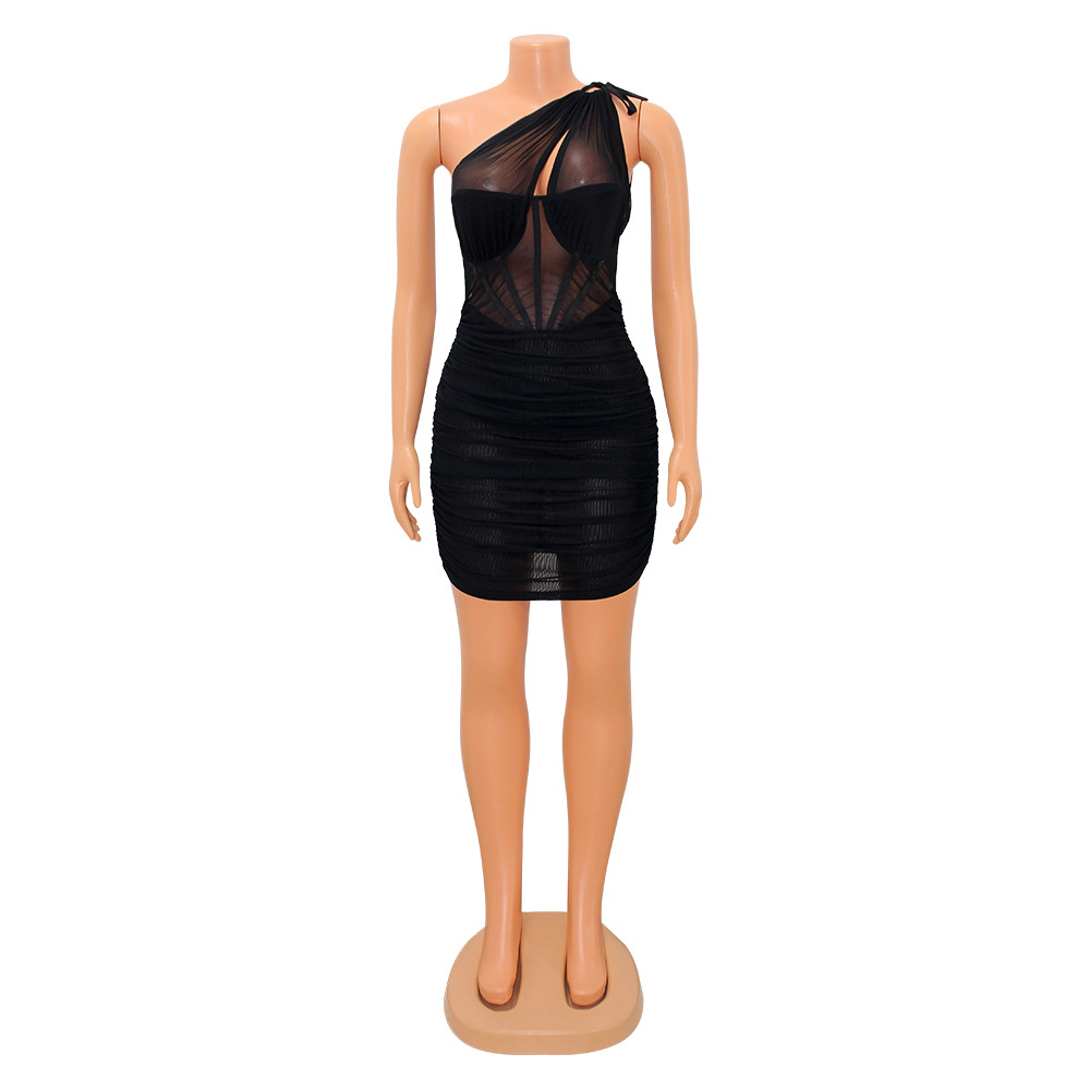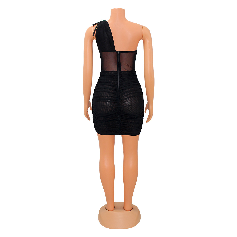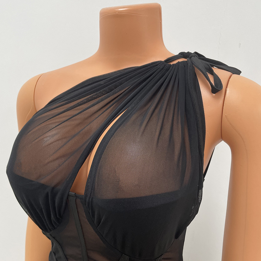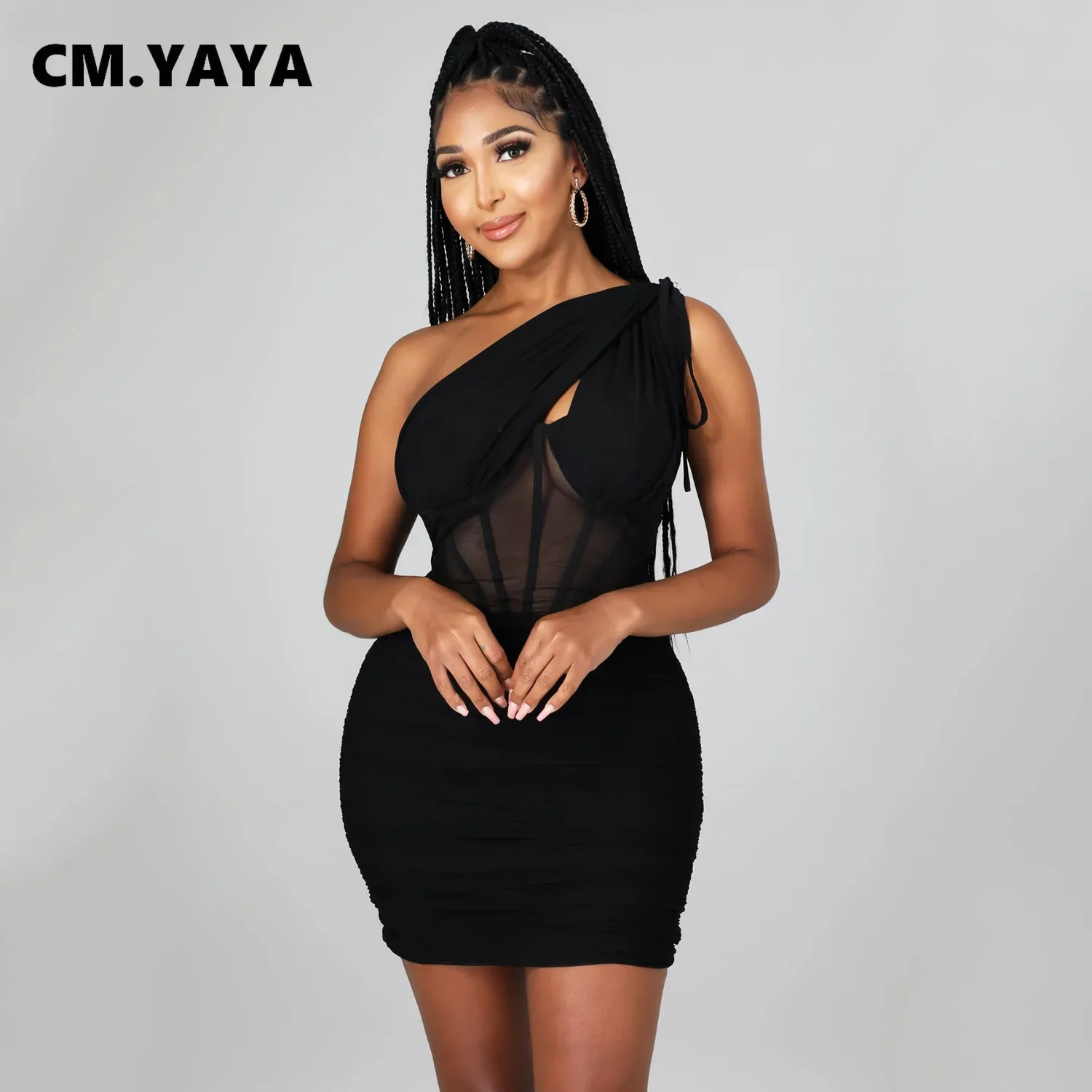CM.YAYA Women Skew Tie Shoulder Mesh Patchwork Croset High Waist Bodycon Ruched Mini Dress 2022 Summer Sexy Party Midi Dresses