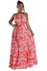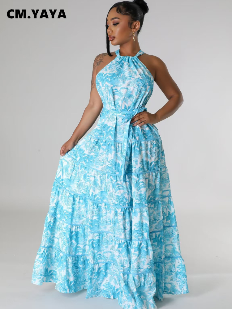 CM.YAYA Women Sleeveless Beach Boho Leaf Printed Big Swing Halter Neck Backless Maxi Long Dress Summer 2025 Dresses Vestidos