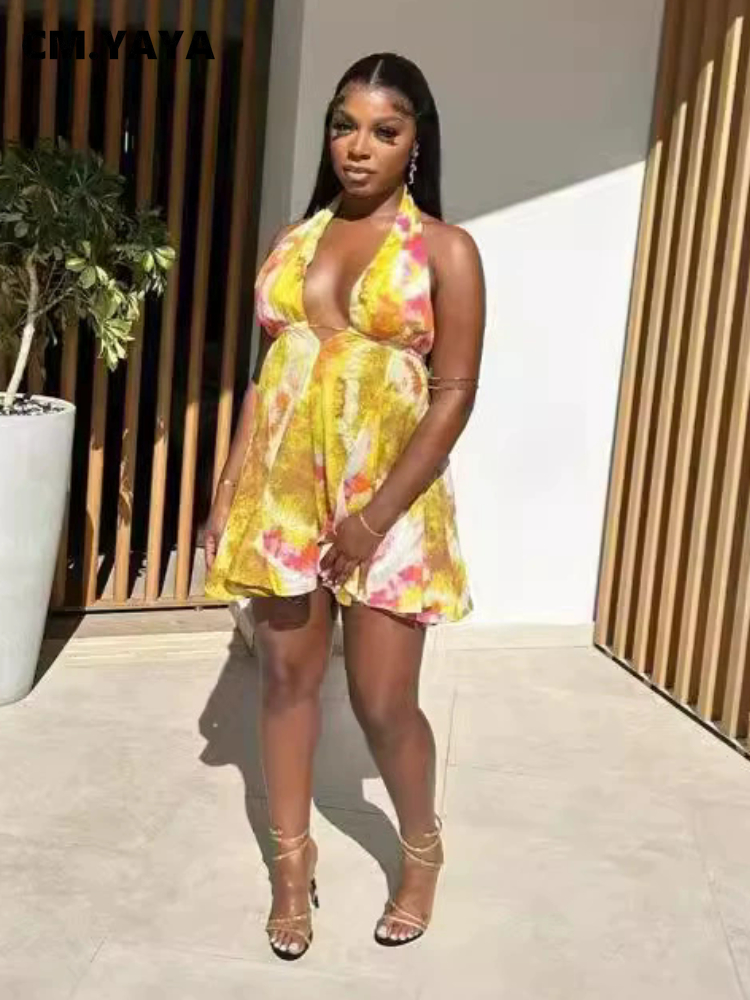 CM.YAYA Women Sleeveless Floral Printed Halter V-neck Backless Big Swing Smock Dress 2025 Birthday Summer Party Dresses Vestidos