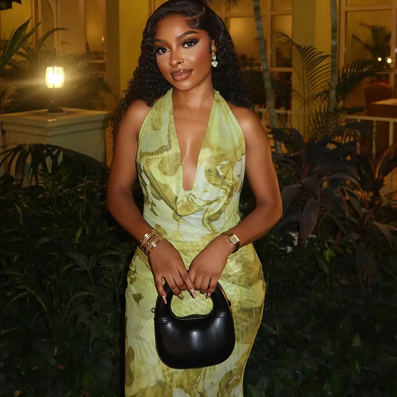 CM.YAYA Women Sleeveless Ruched Halter V-neck High Waist Long Maxi Dress Print Birthday Night Club Party Vestidos Sexy Dresses