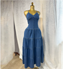 CM.YAYA Women Sleeveless V-neck Strap Denim Long Dress High Waist Ruched Holiday Party Evening Streetwear Tiered Maxi Dresses